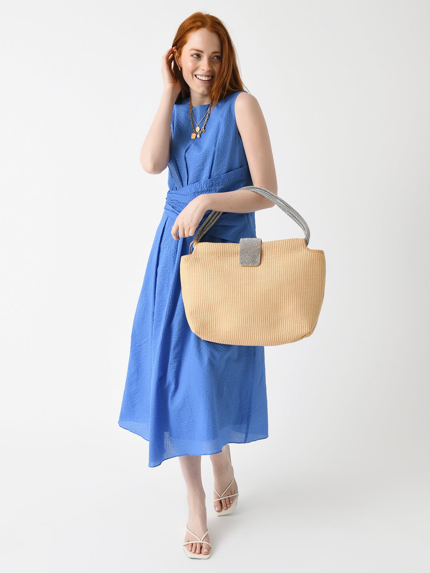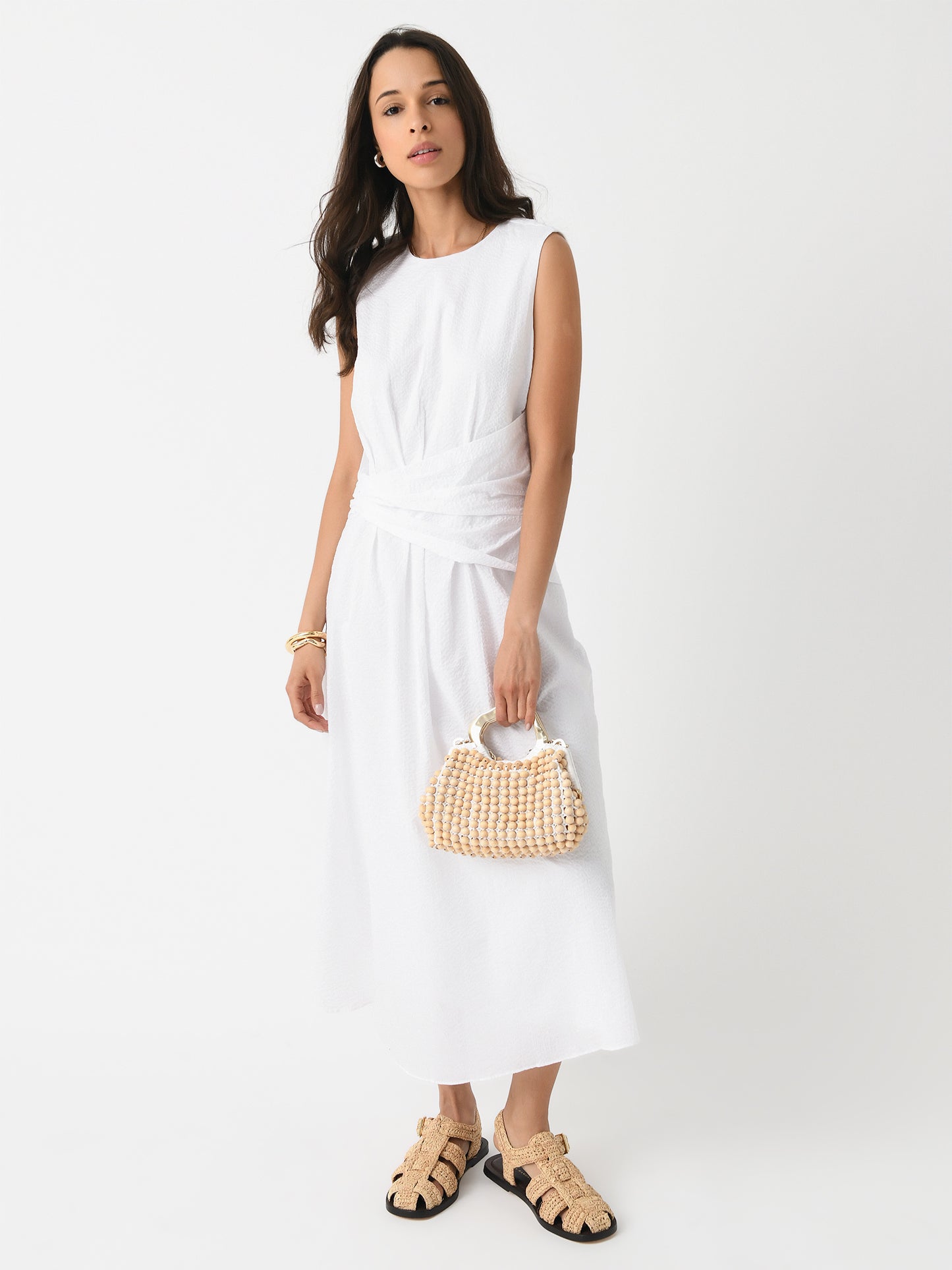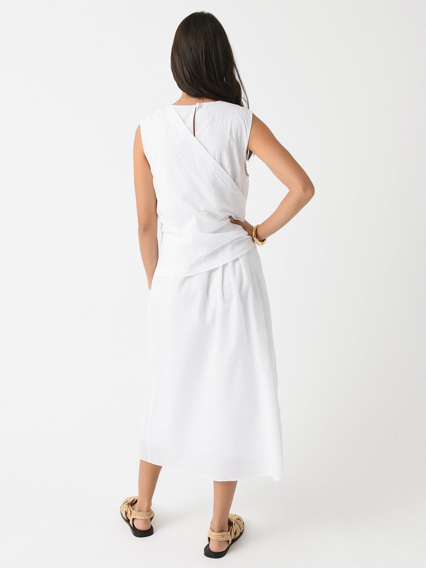 A sleeveless midi dress made from textured cotton with a shirred panel detail.