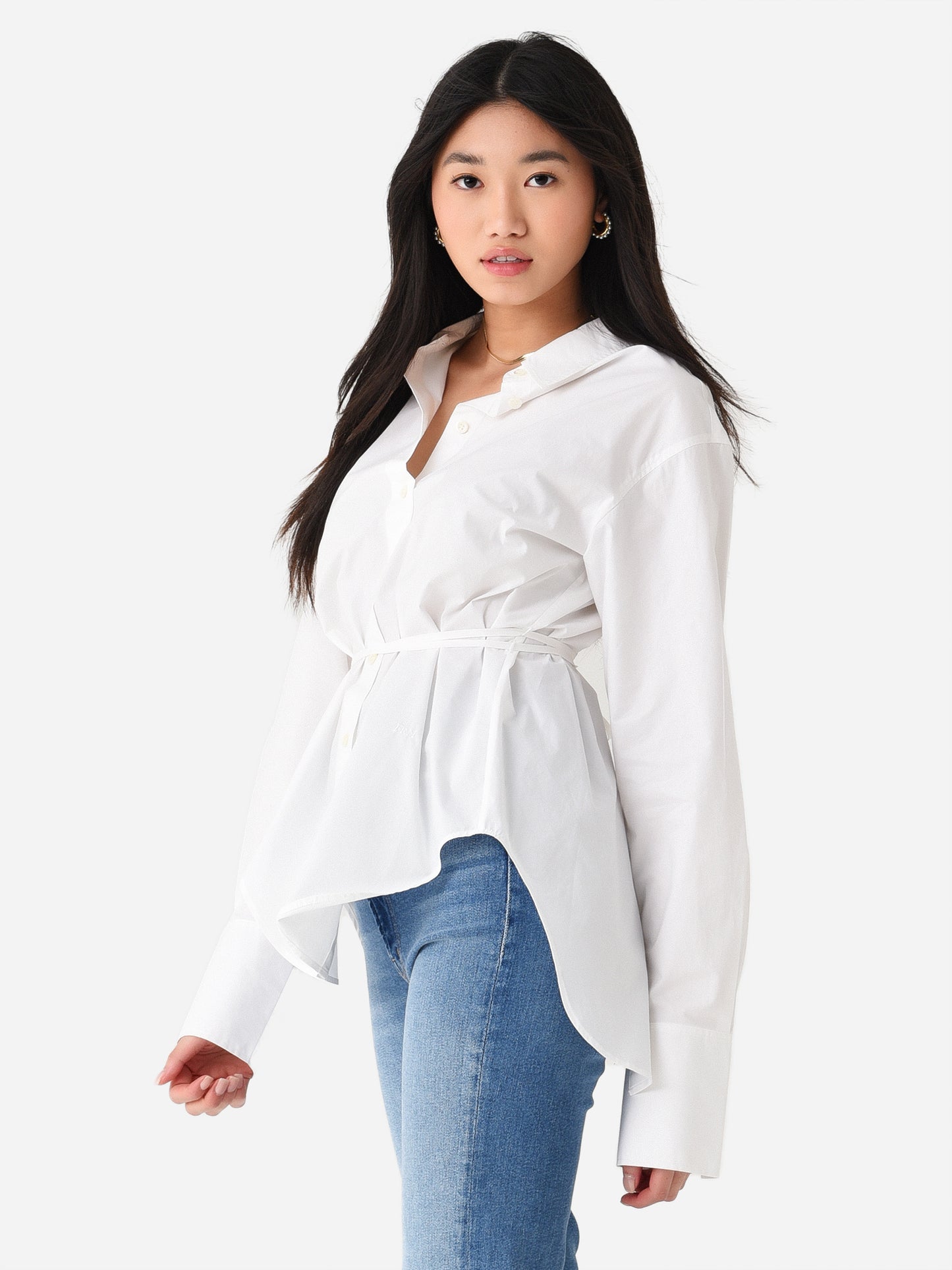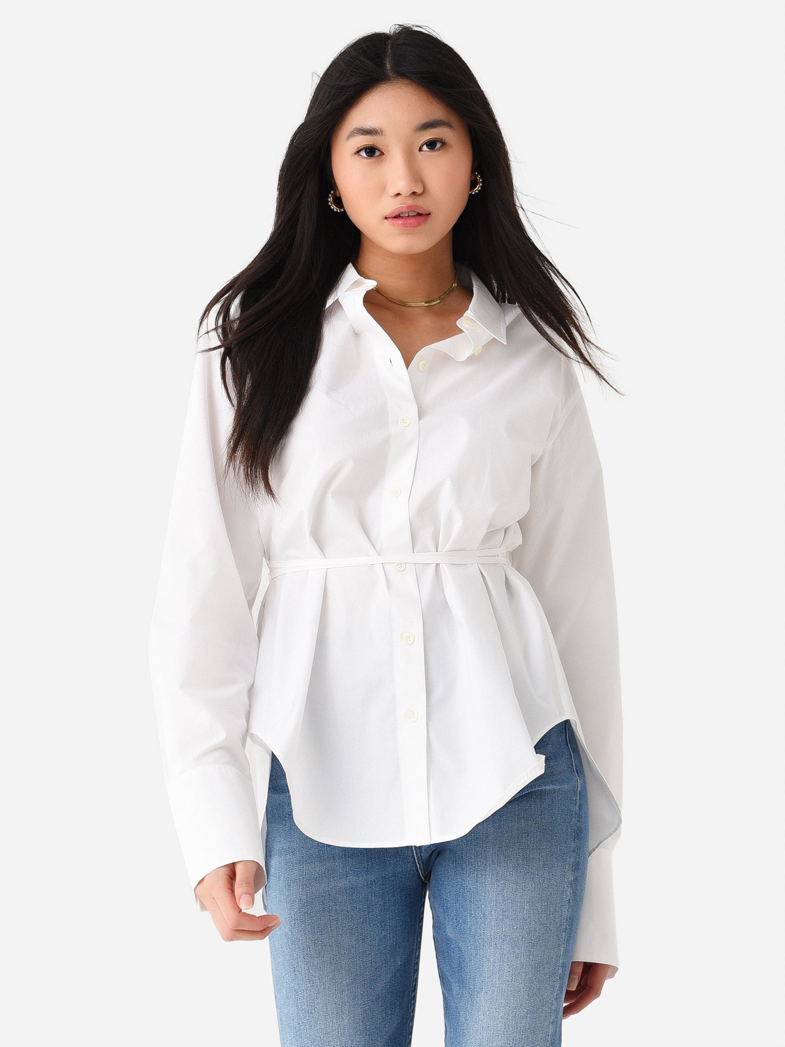 Poplin button-down shirt with a chic back slit and slim waist ties.