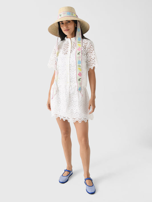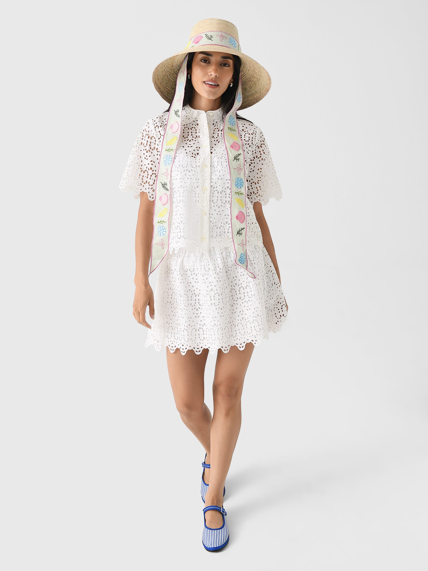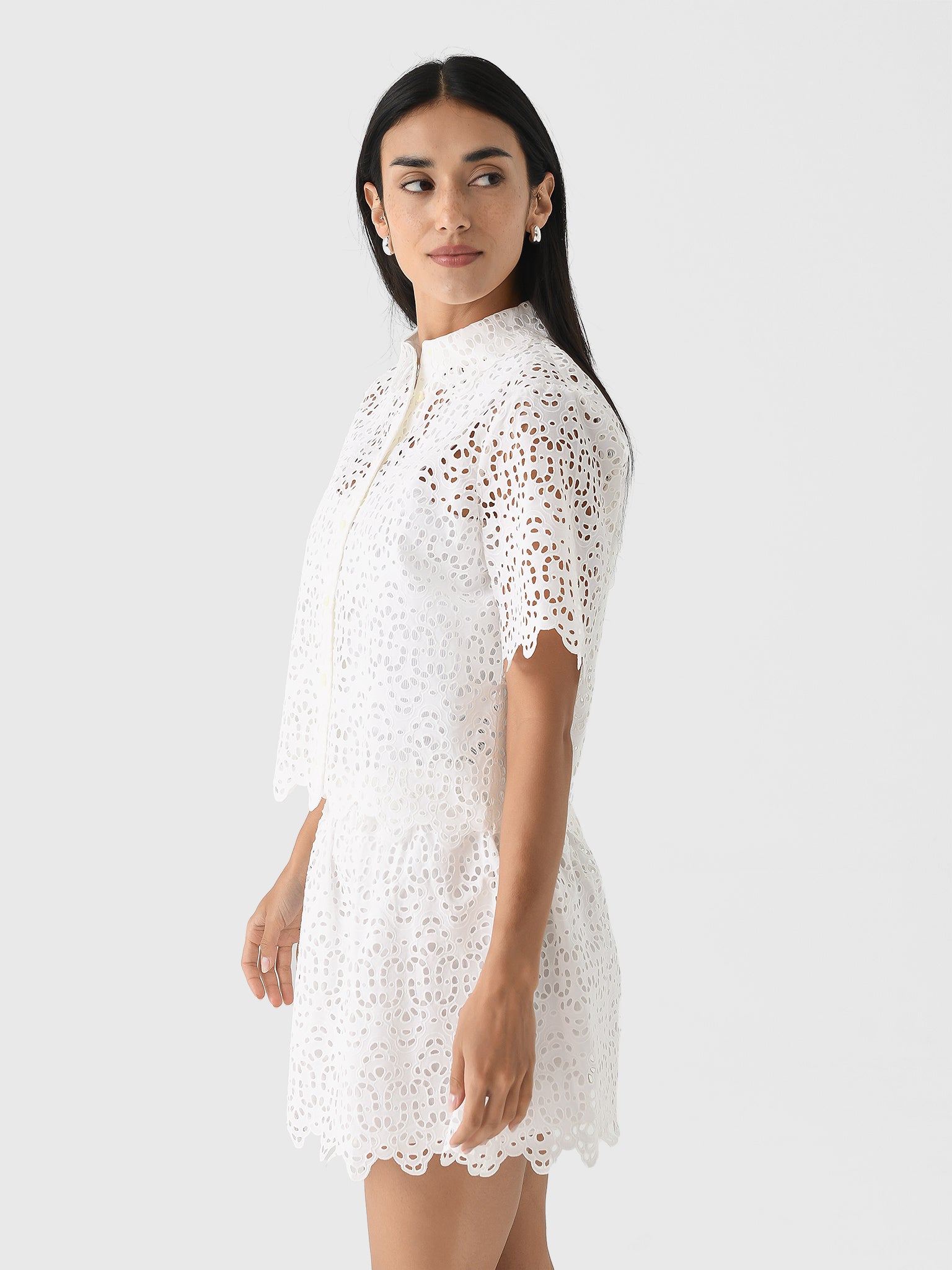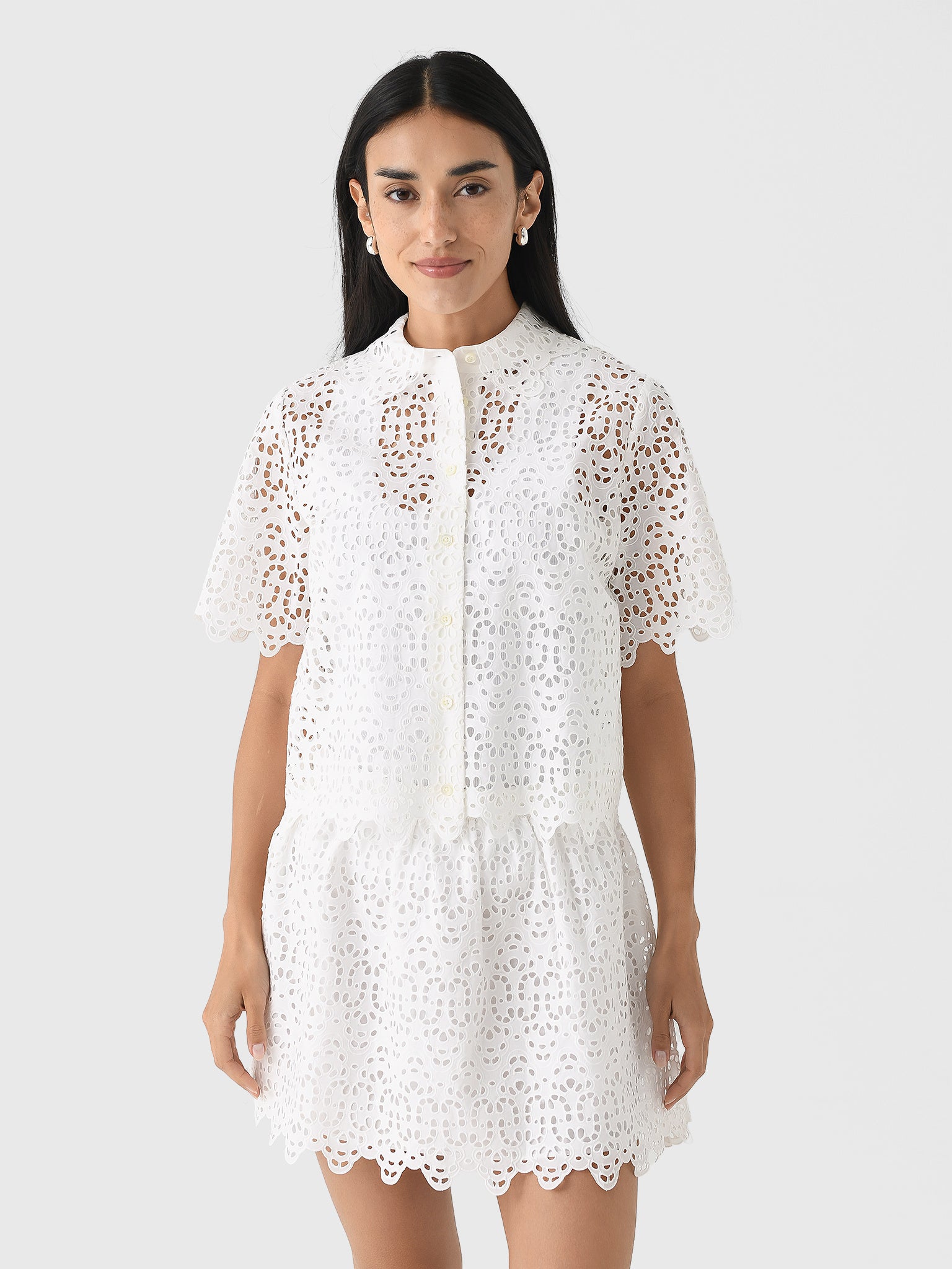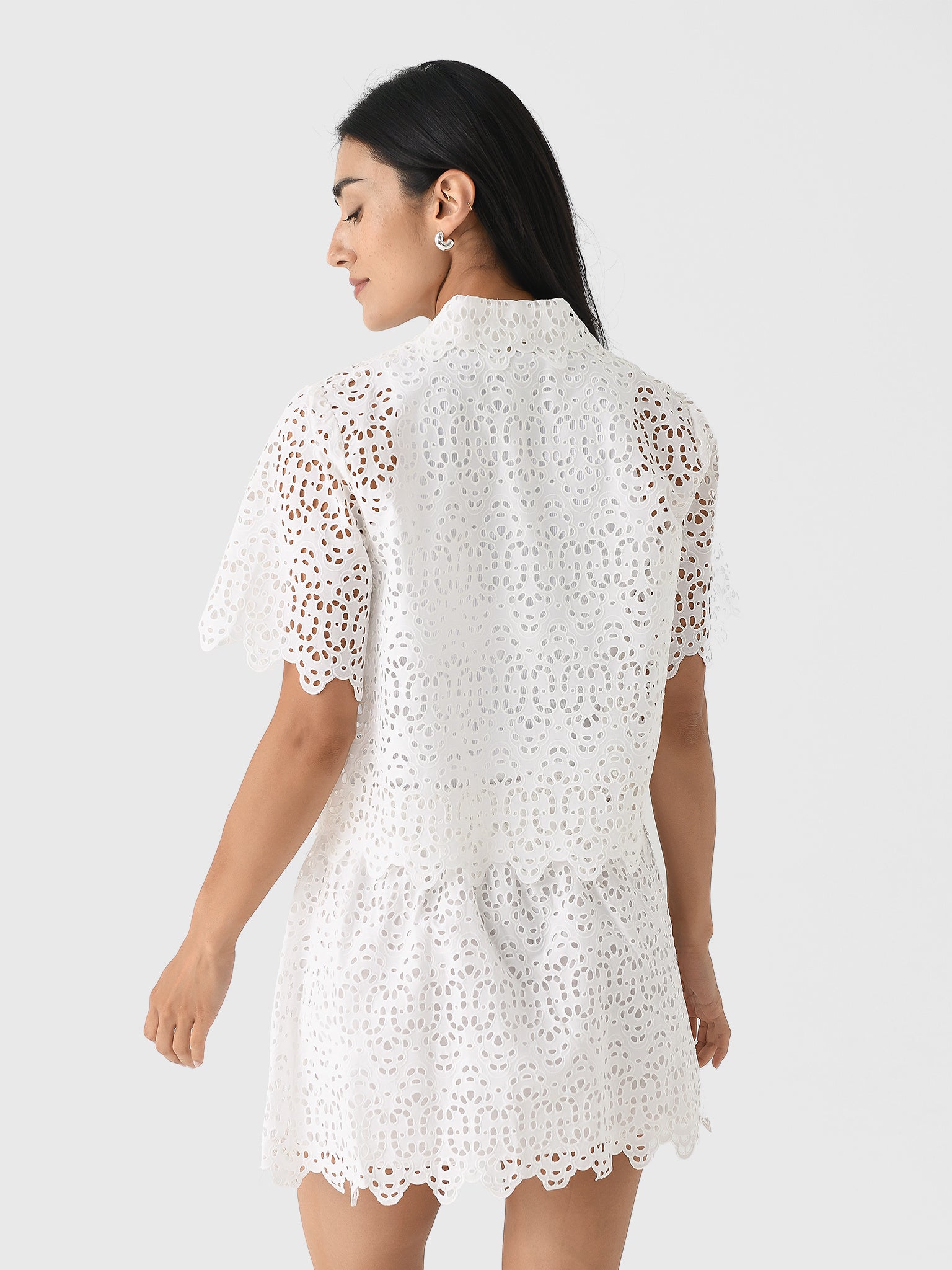 This lightweight button-down blouse is made from comfortable cotton and features intricate eyelet fabric and scalloped edges.