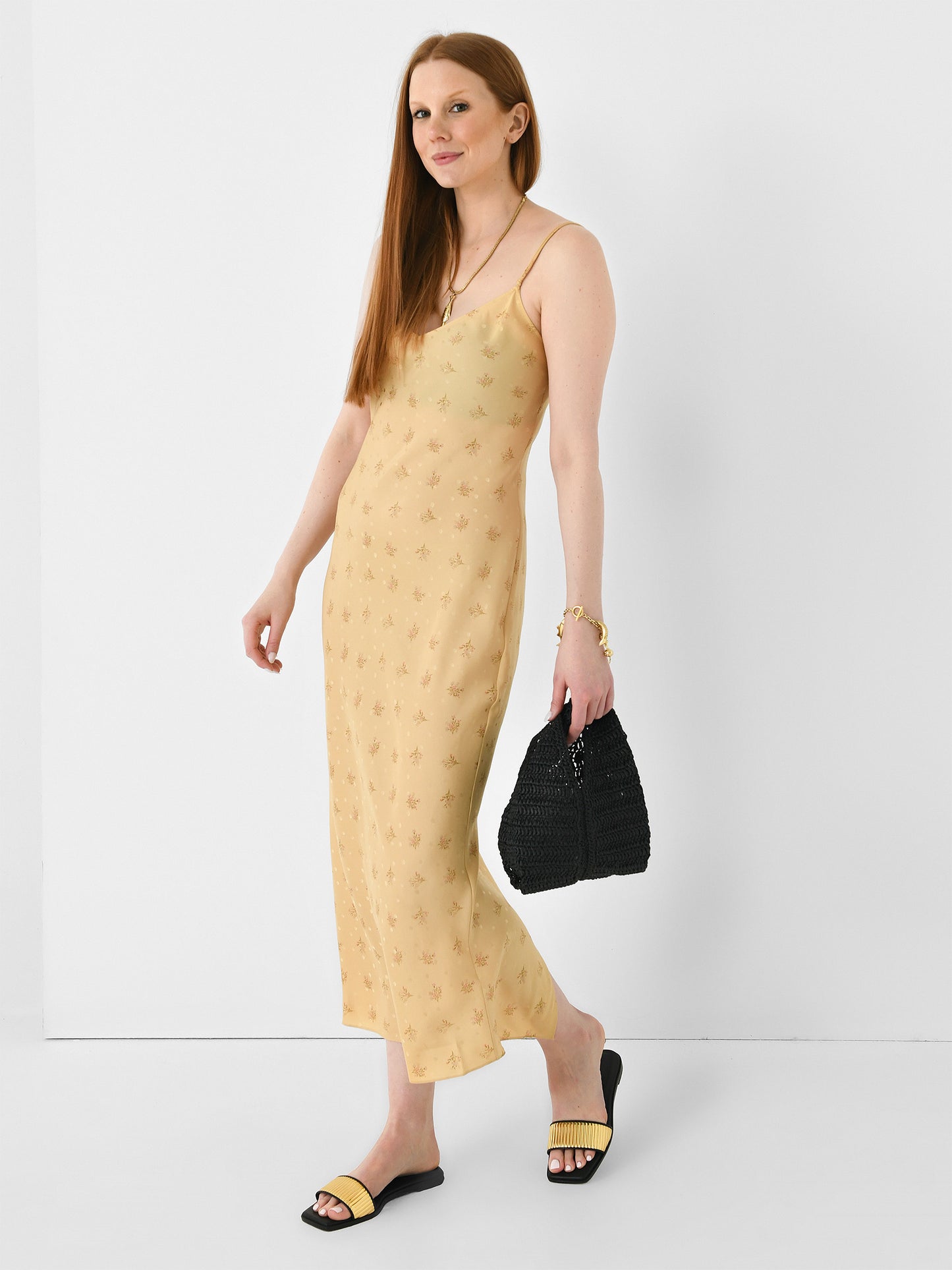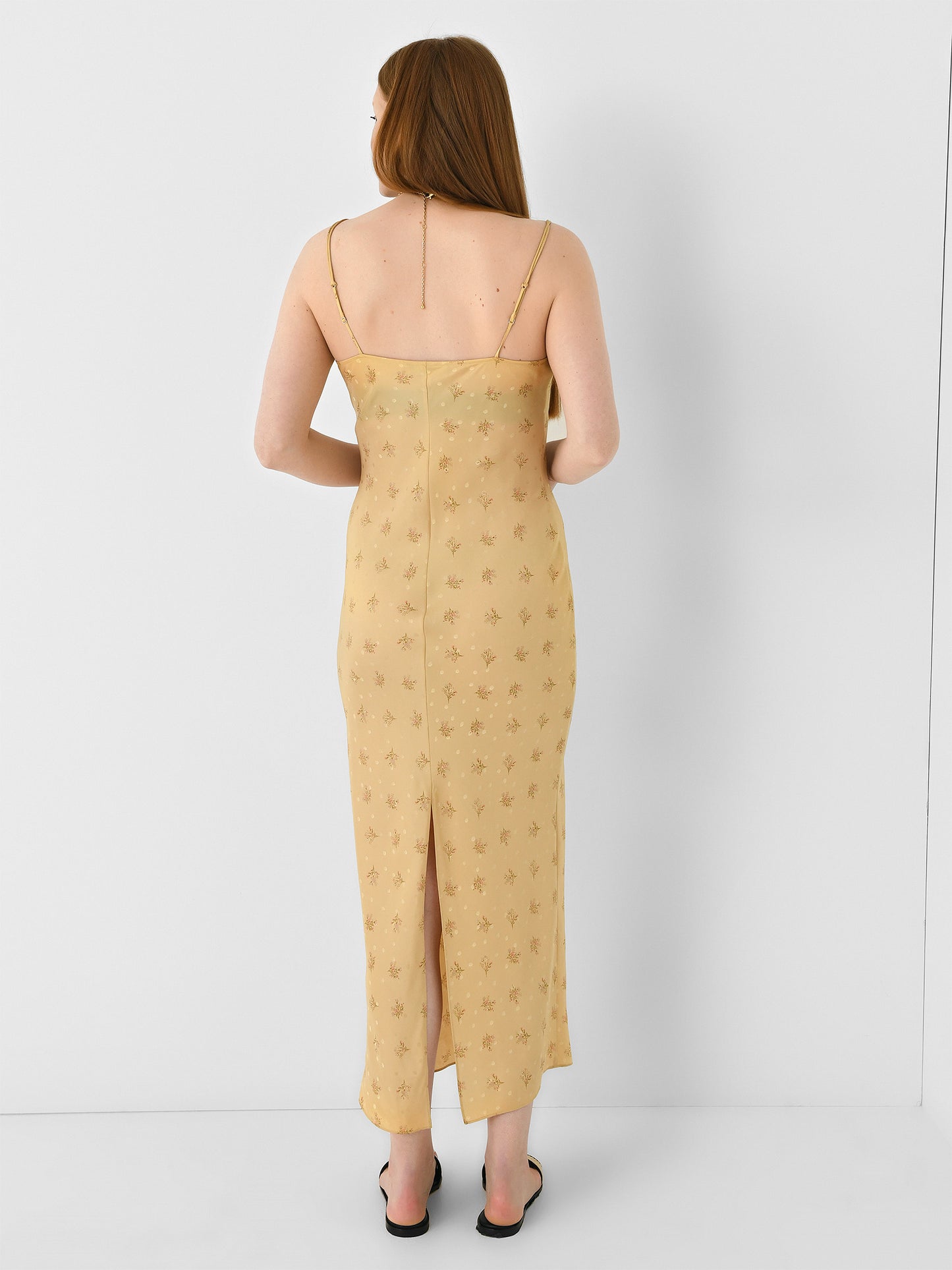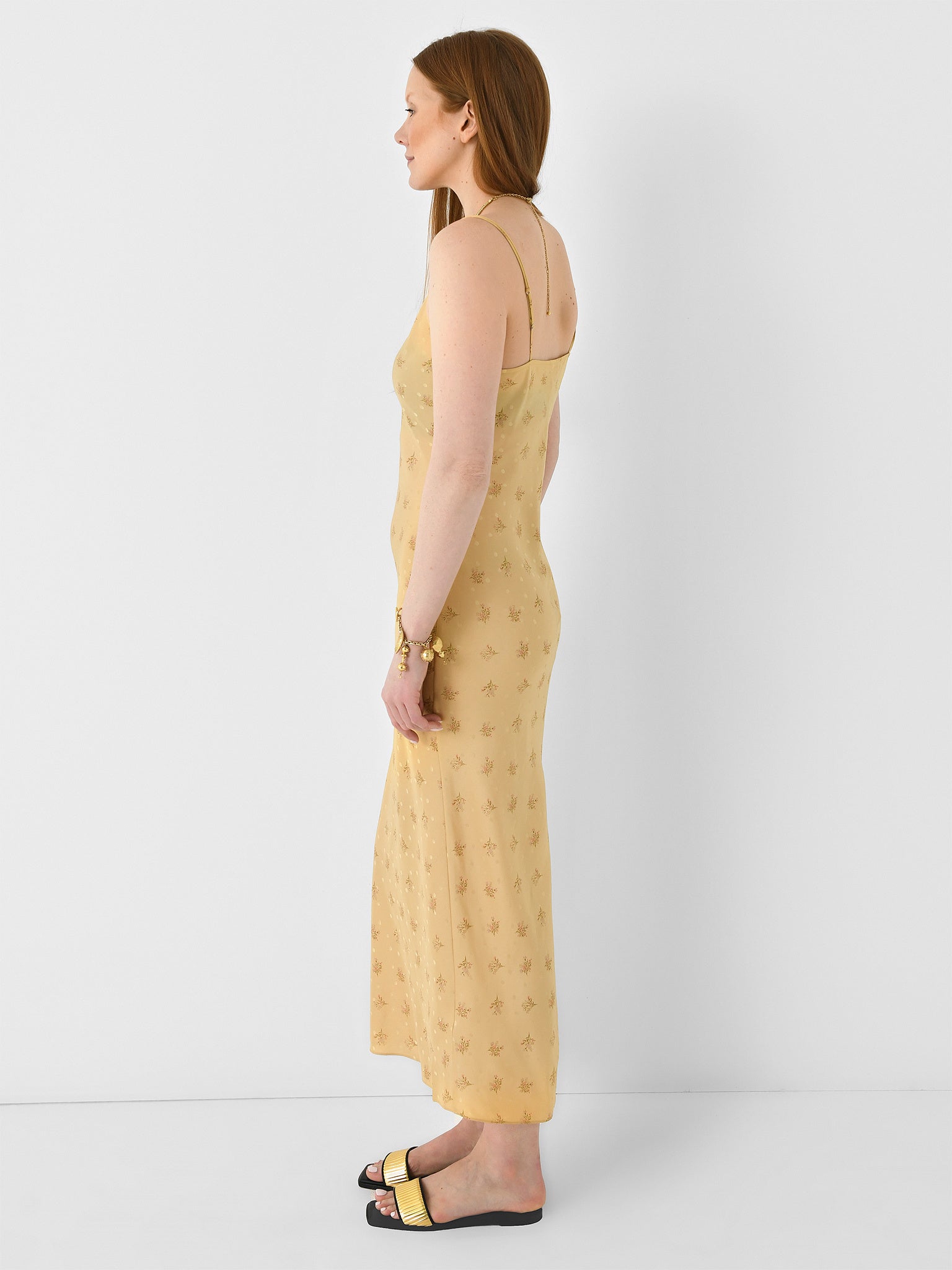 A long cami-style dress made from jacquard silk with a luxurious draped design.