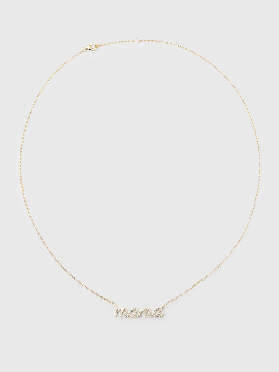 This necklace is a graceful piece rendered in 14-karat yellow gold. It features a fluid, cursive "mama" pendant adorned with sparkling pavé diamonds for a subtle touch of brilliance.