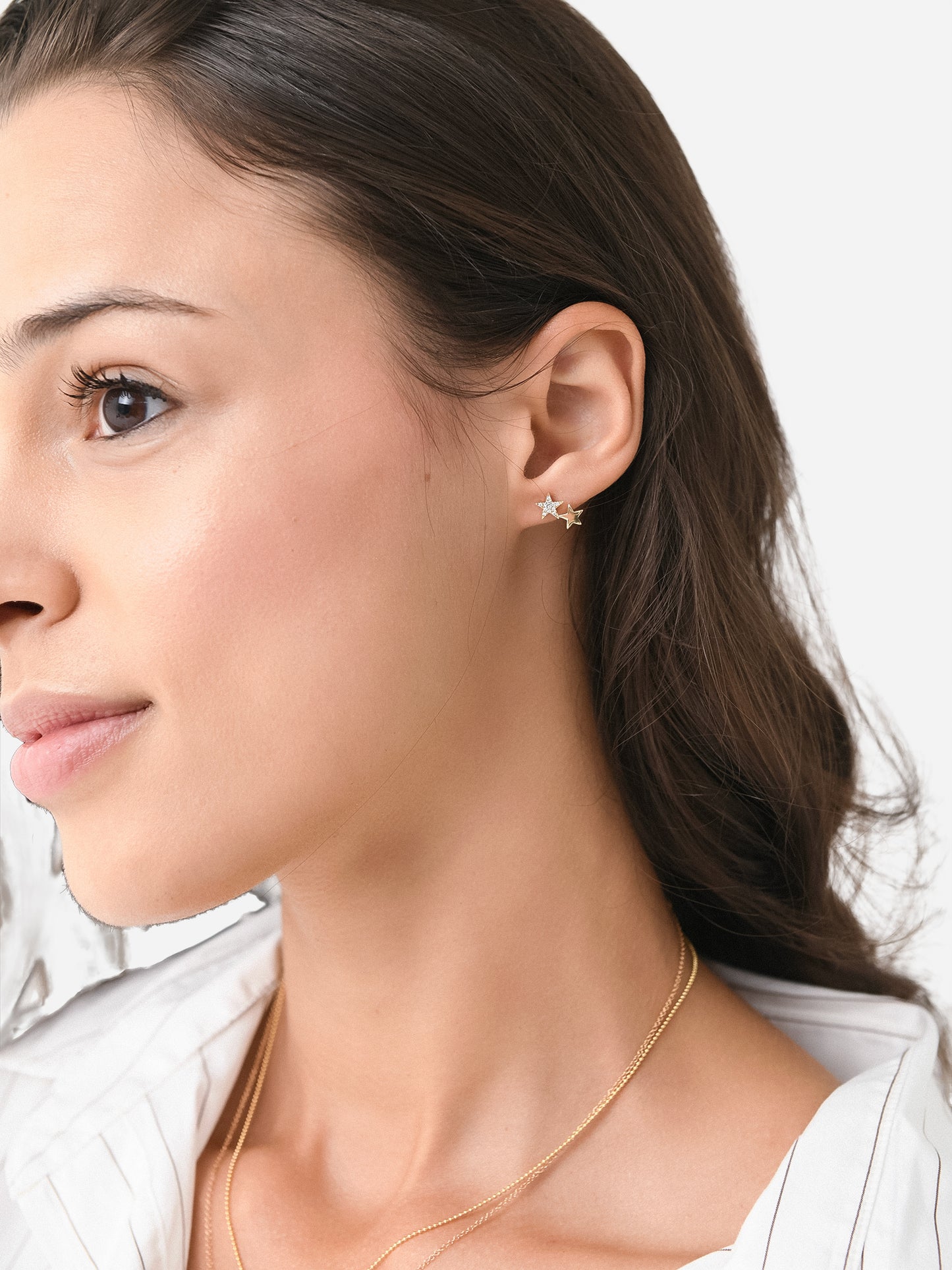 A pair of 14-karat yellow gold stud earrings with a double star design and pavé diamonds.
