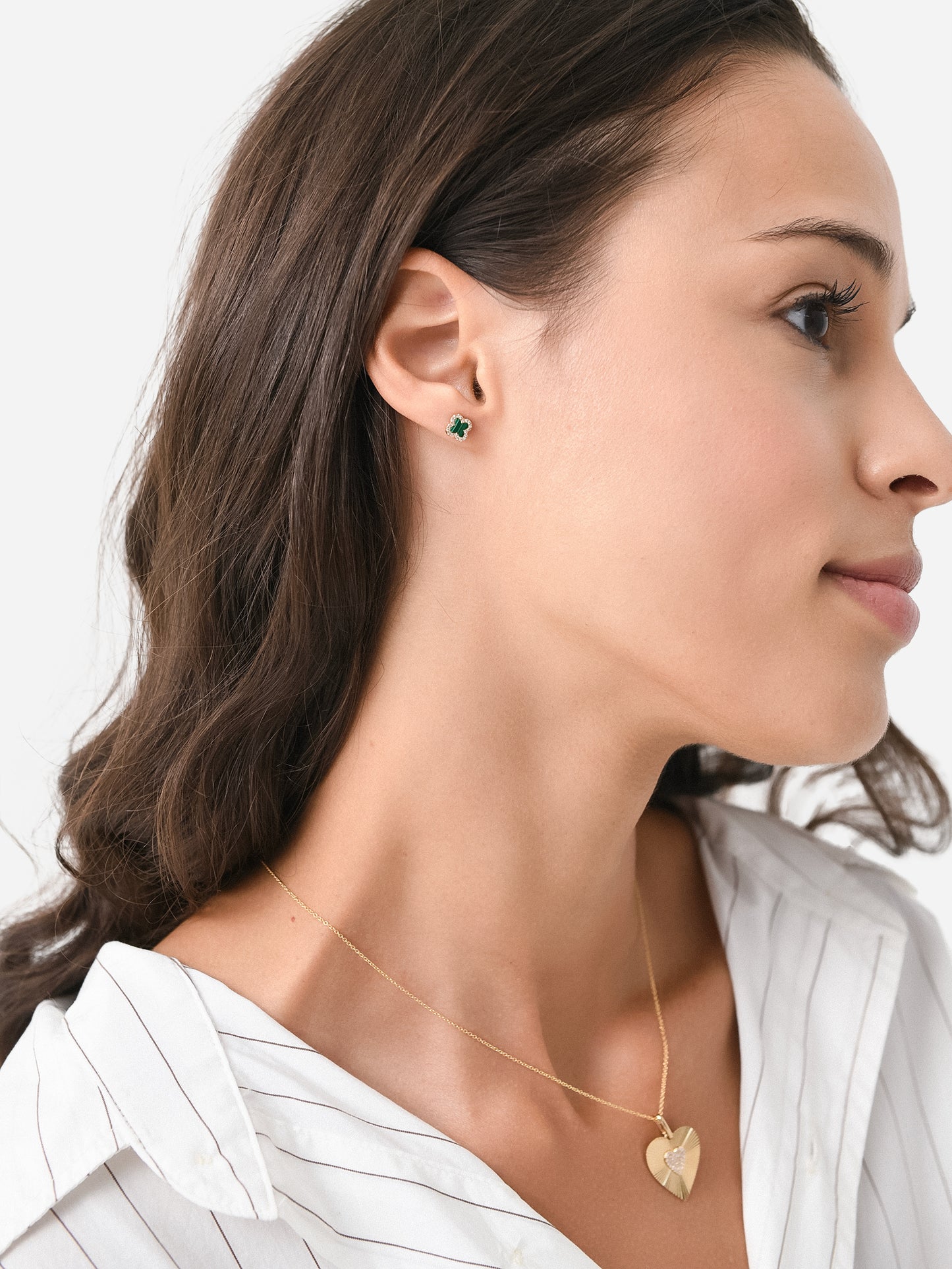 14-karat yellow gold clover-shaped emerald stud earrings with pavé diamonds.