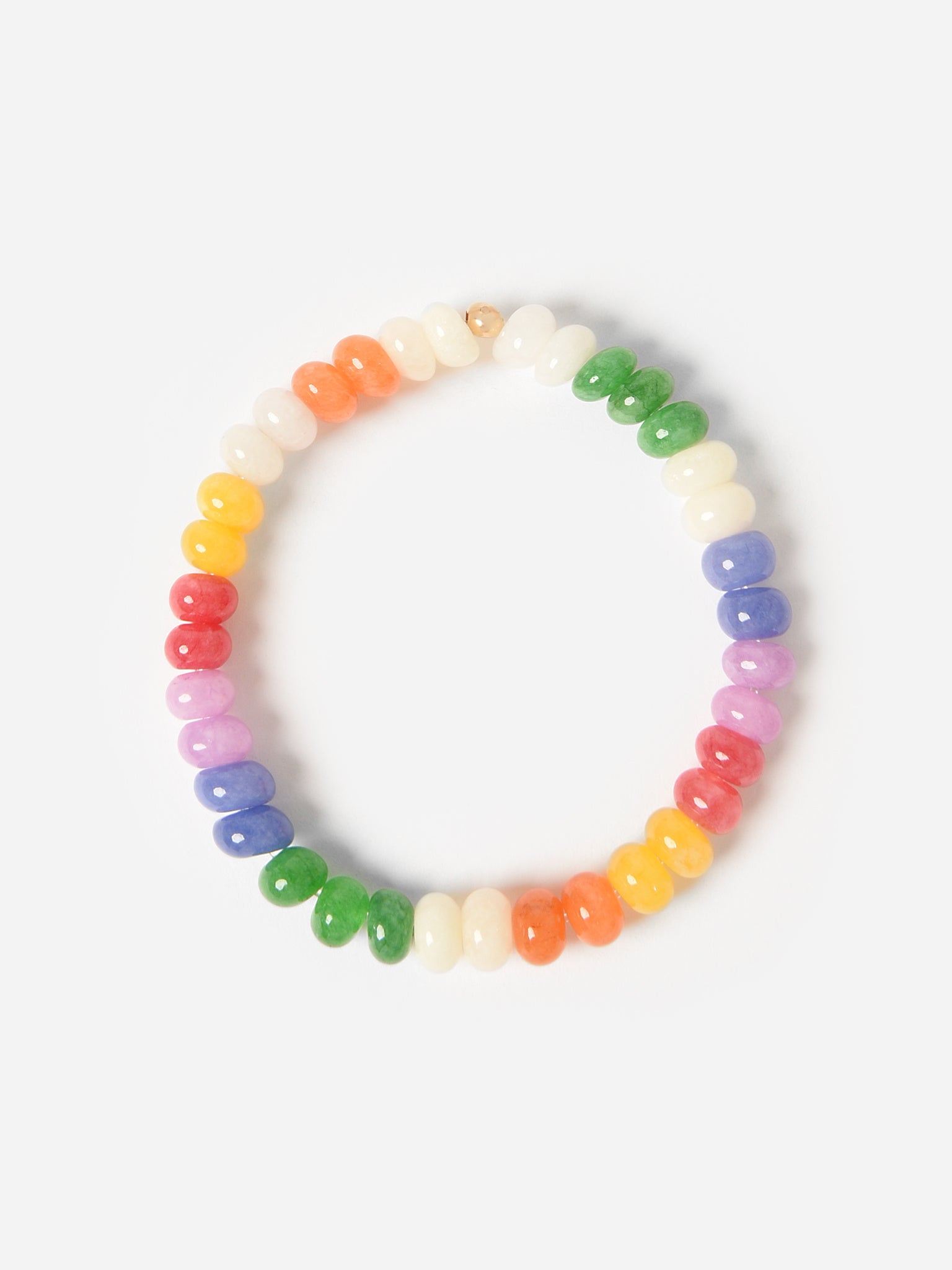 A multi-colored crystal bead bracelet with a gold accent bead.