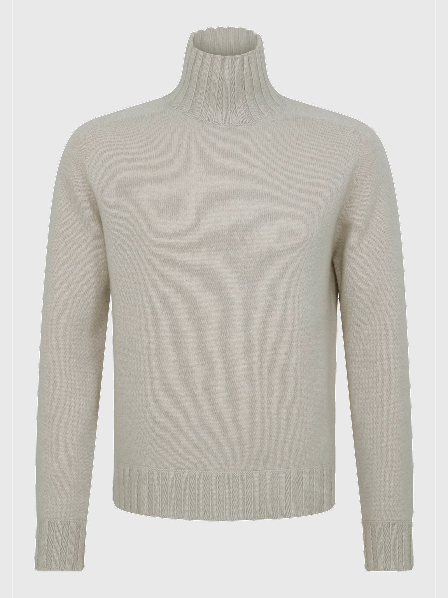 A high-quality cashmere turtleneck sweater featuring double-layer wide-ribbed trims.