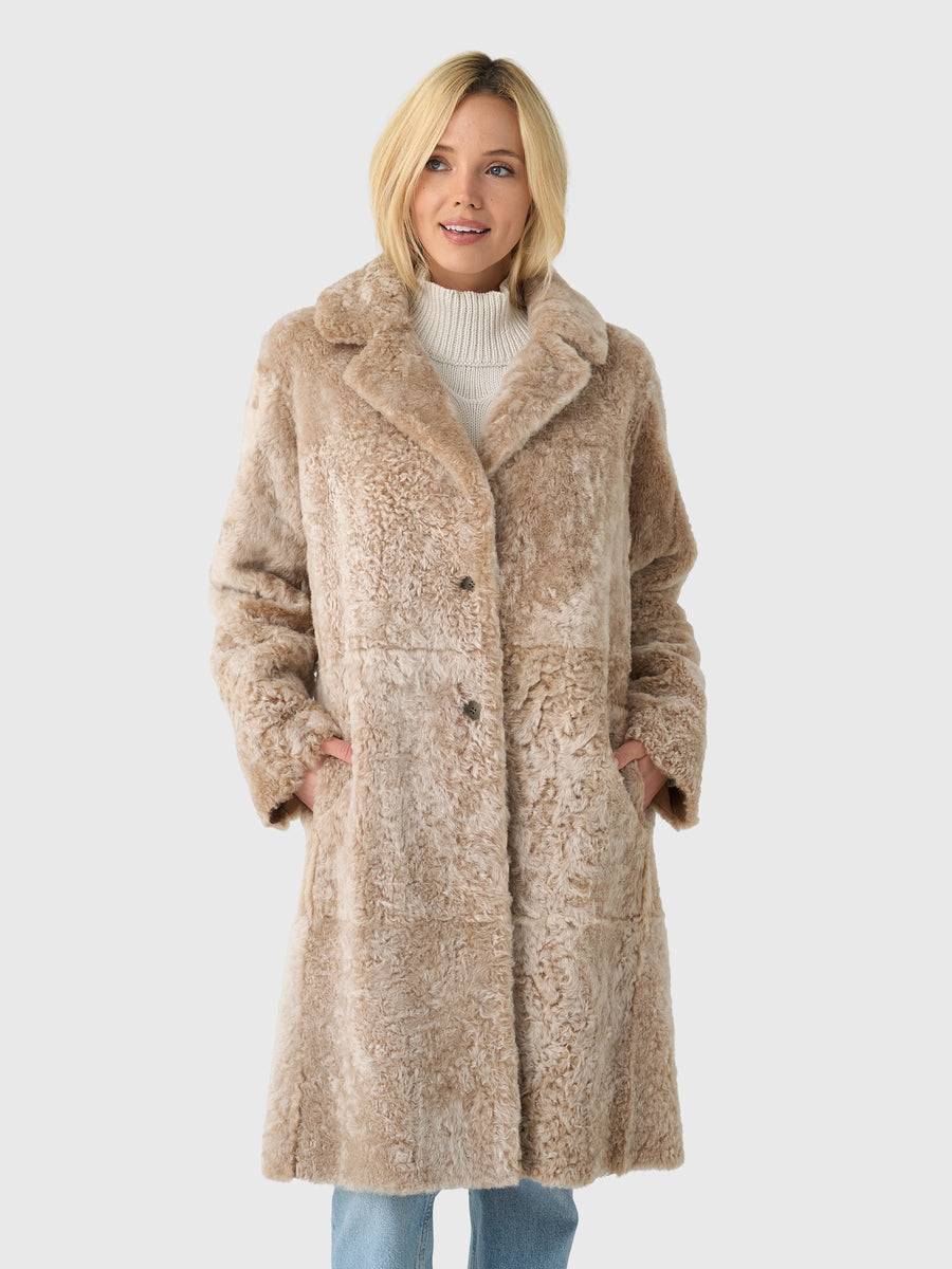 Notch Collar Side Pockets Button Closure Long Silhouette Fully Reversible 100% Lambskin Relaxed Fit Model is wearing size 1 coat. Model's Measurements: Height: 5'9" | Bust: 32C | Waist: 24.5" | Hips: 35" | Dress Size: 2-4 (US)
