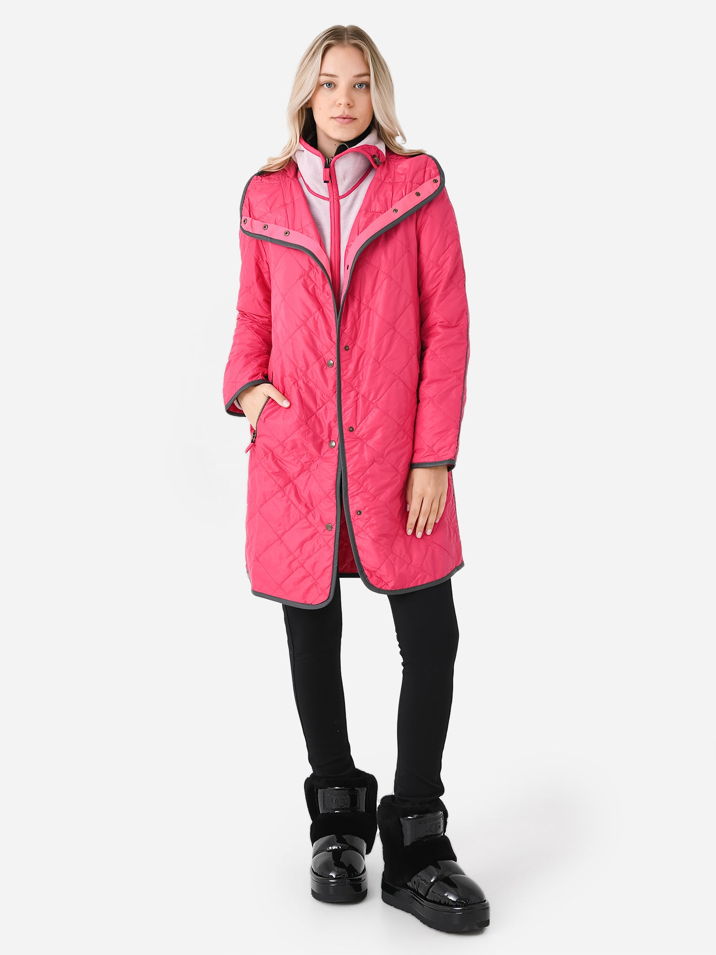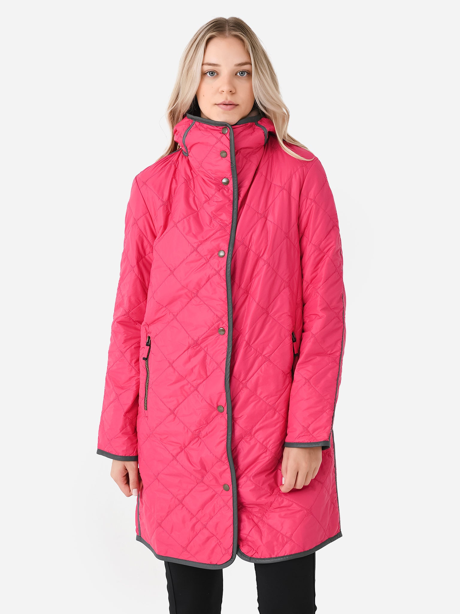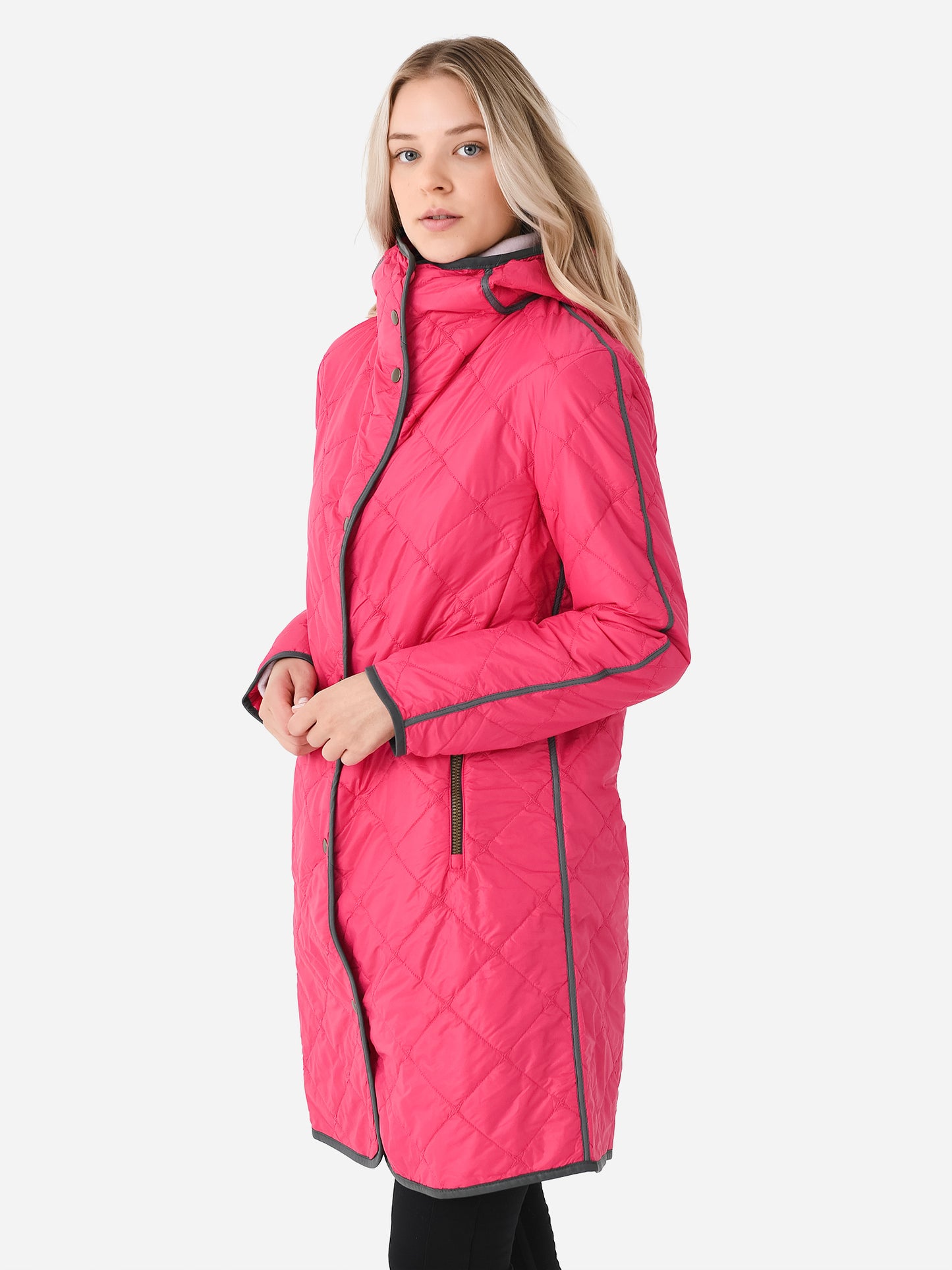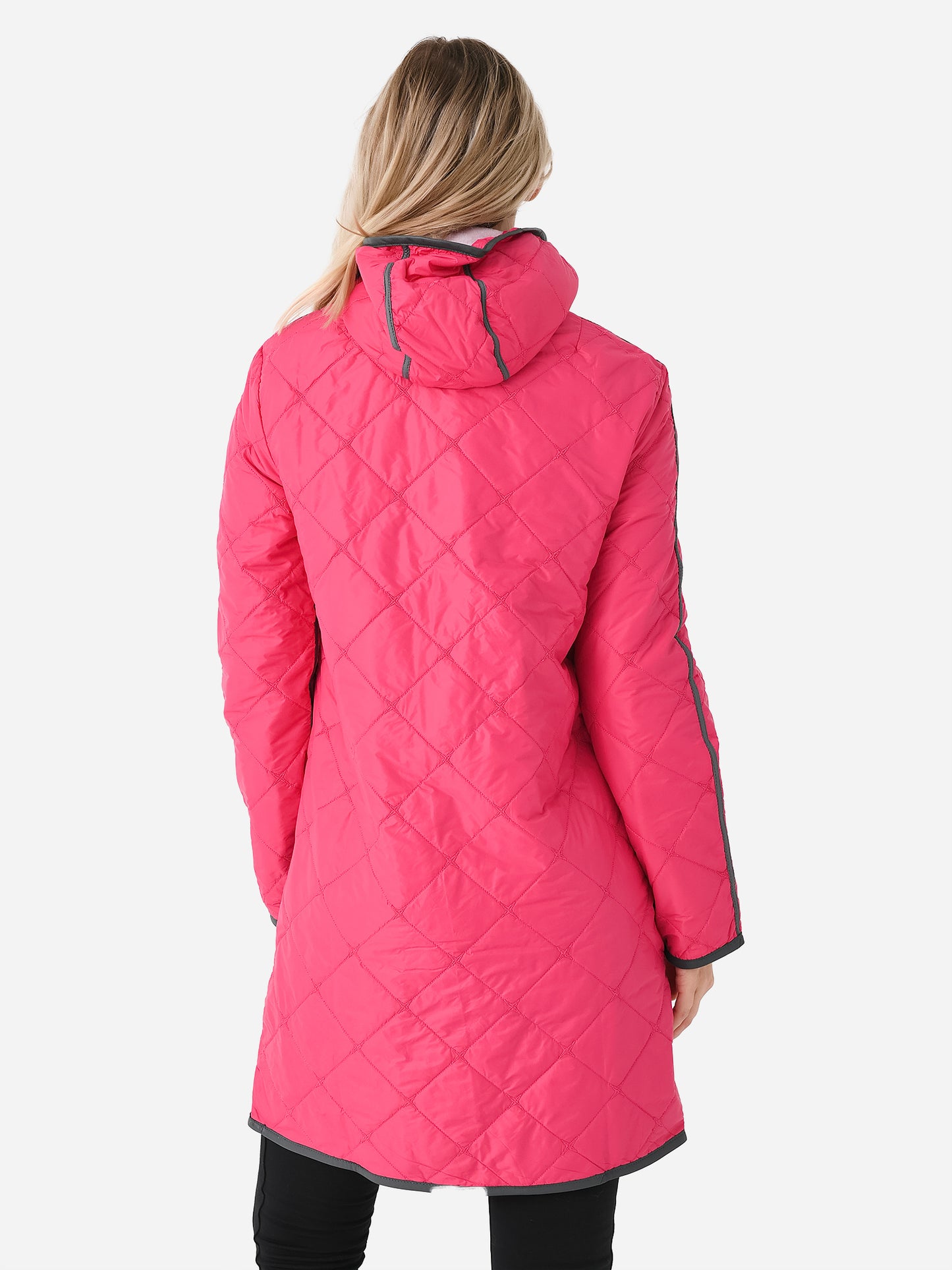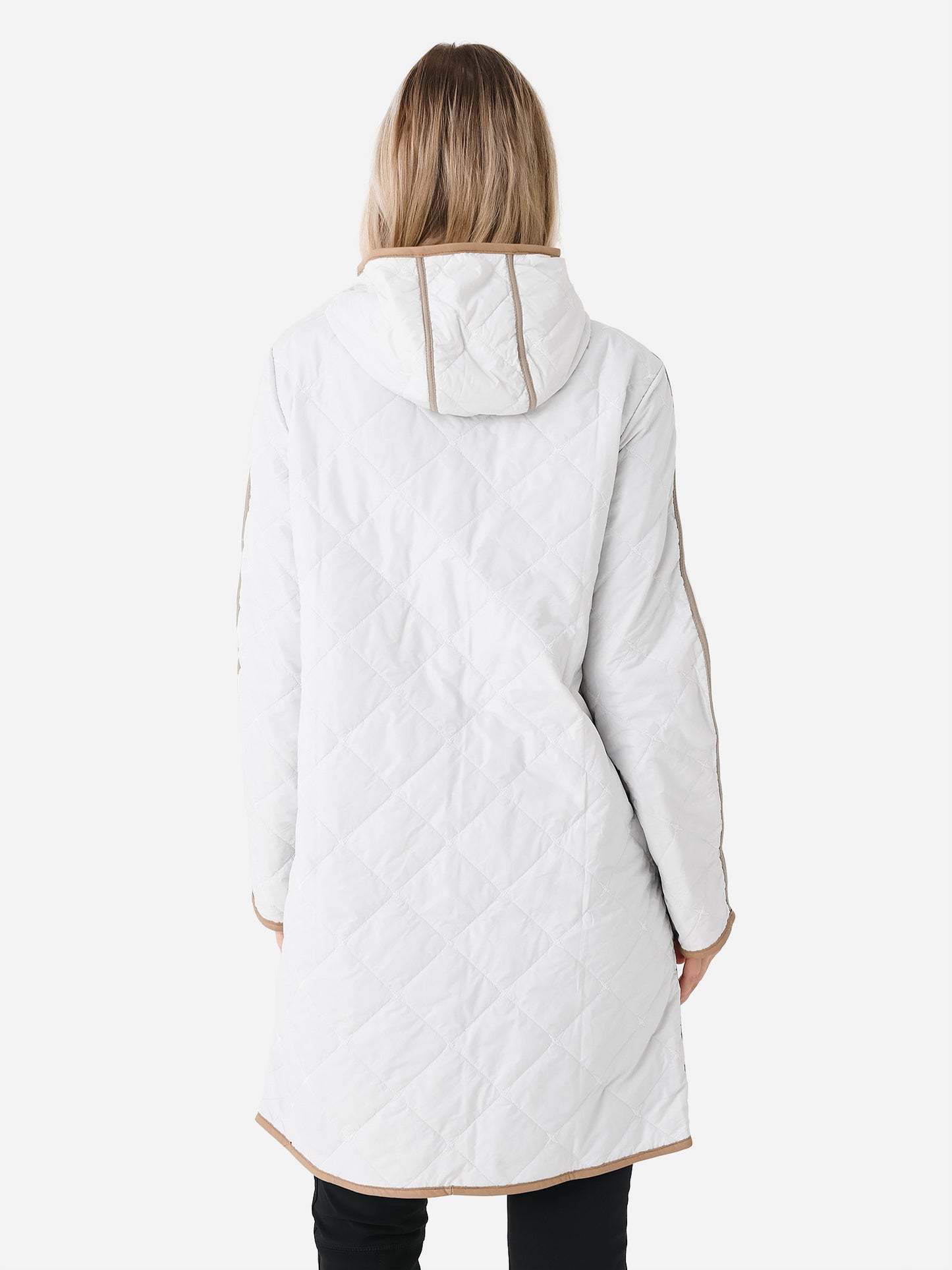 Lightweight down-insulated quilted coat with a long silhouette.