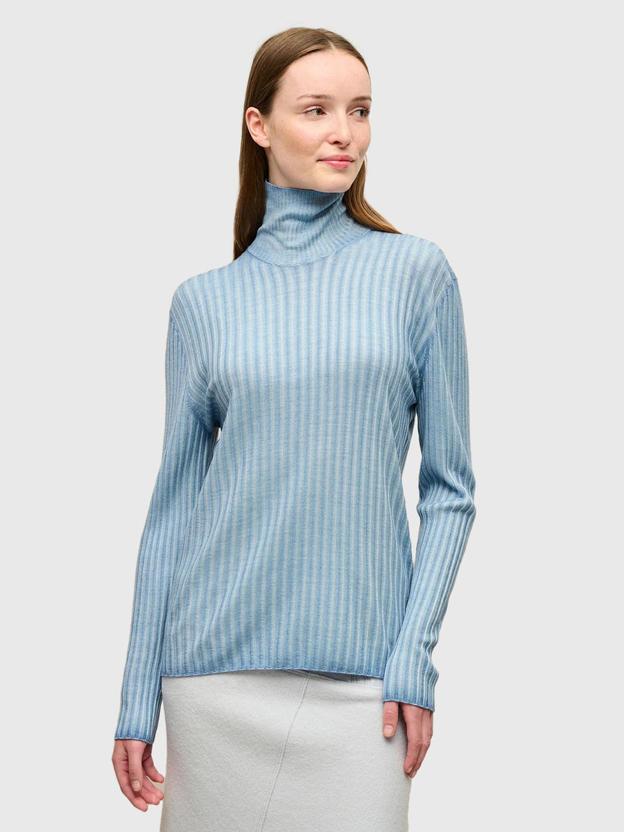 A lightweight turtleneck sweater made from a finely knit wool blend.