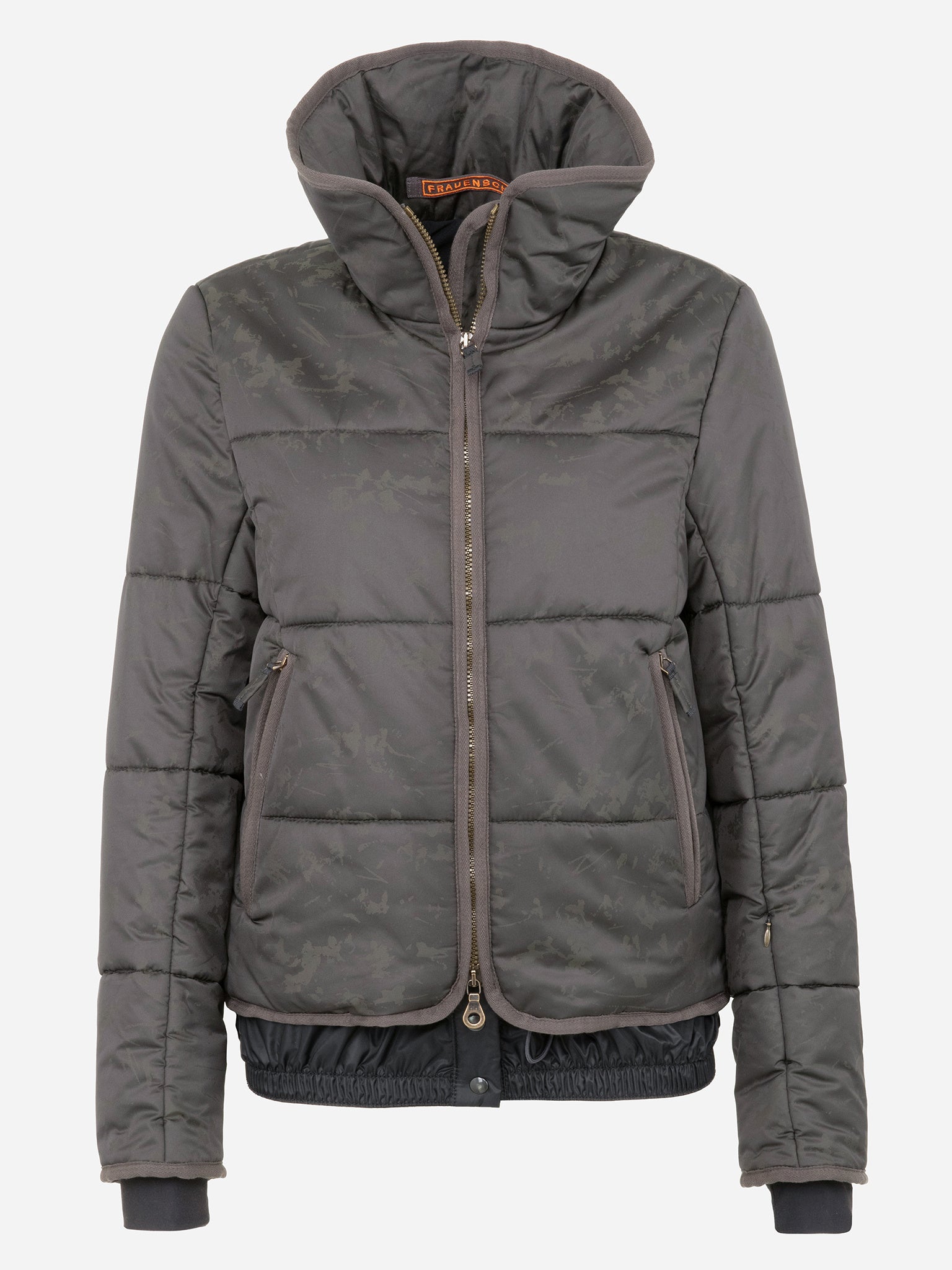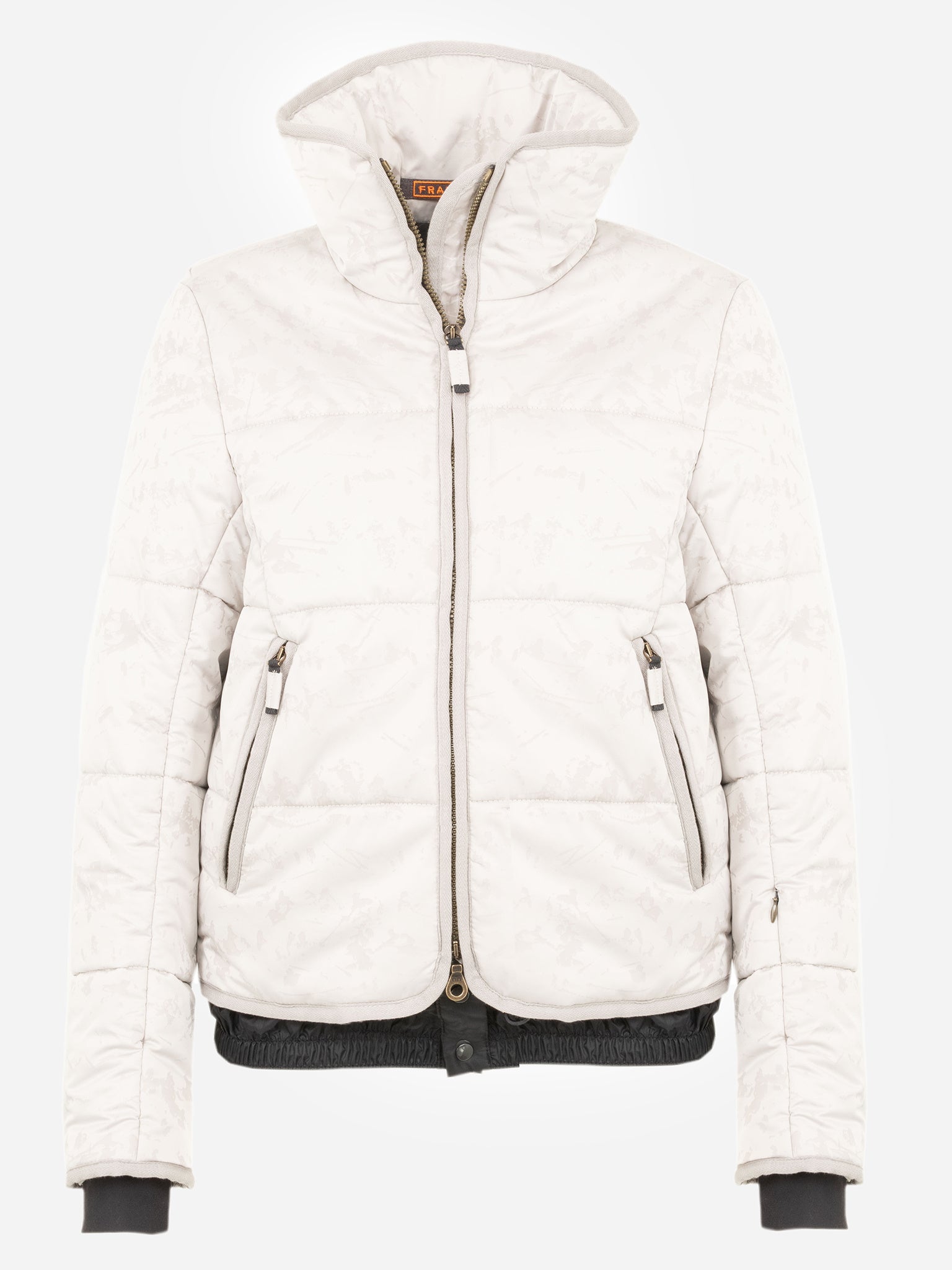Jacquard-material ski jacket with multiple pockets and a flared stand up collar for extra warmth.