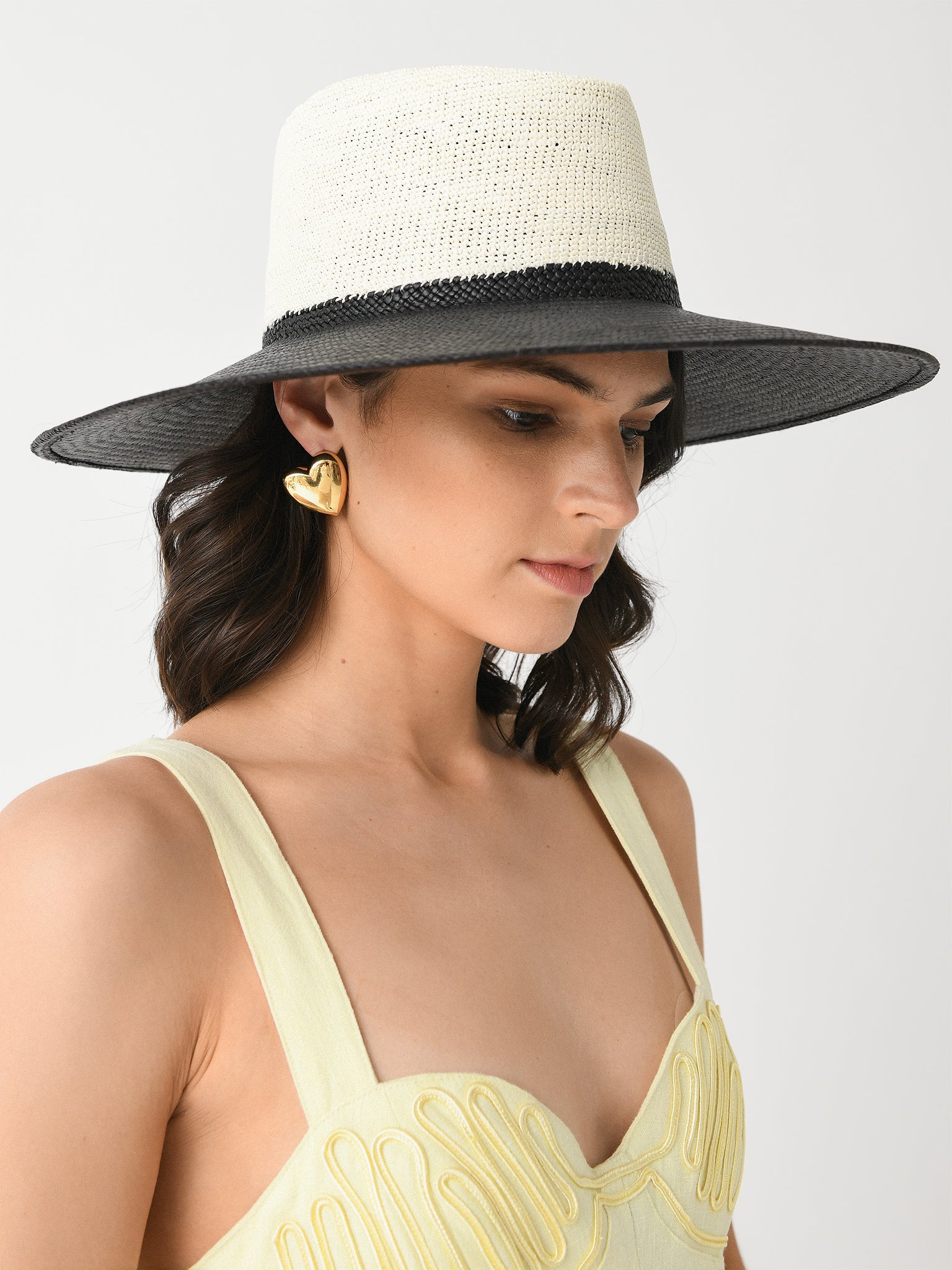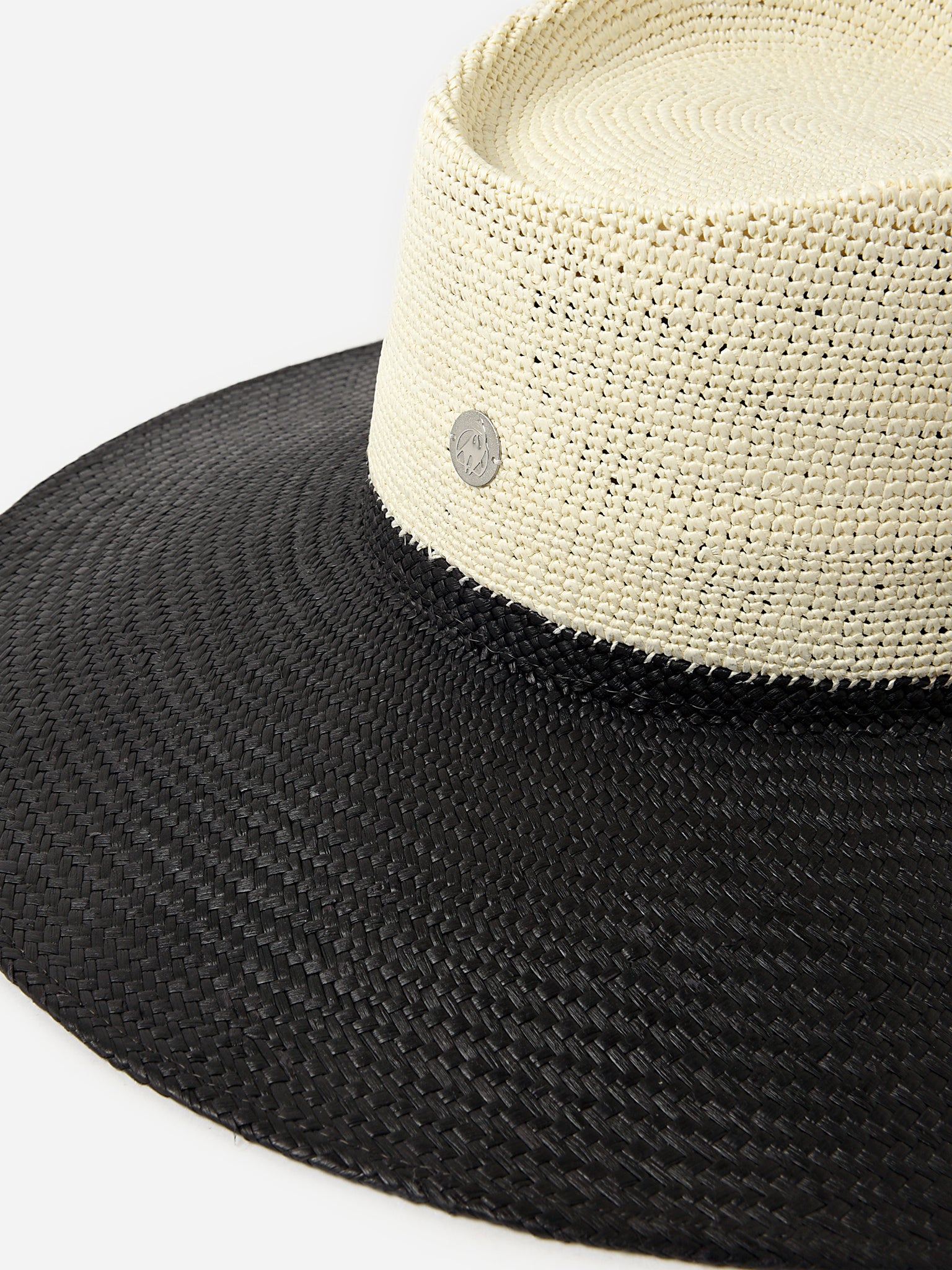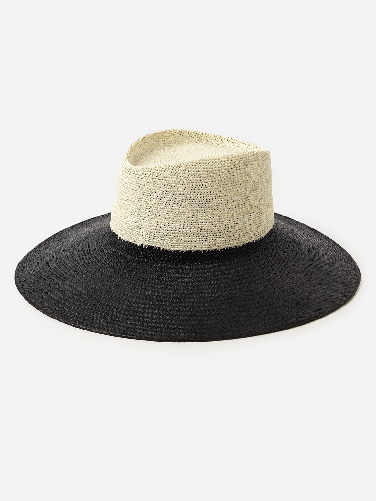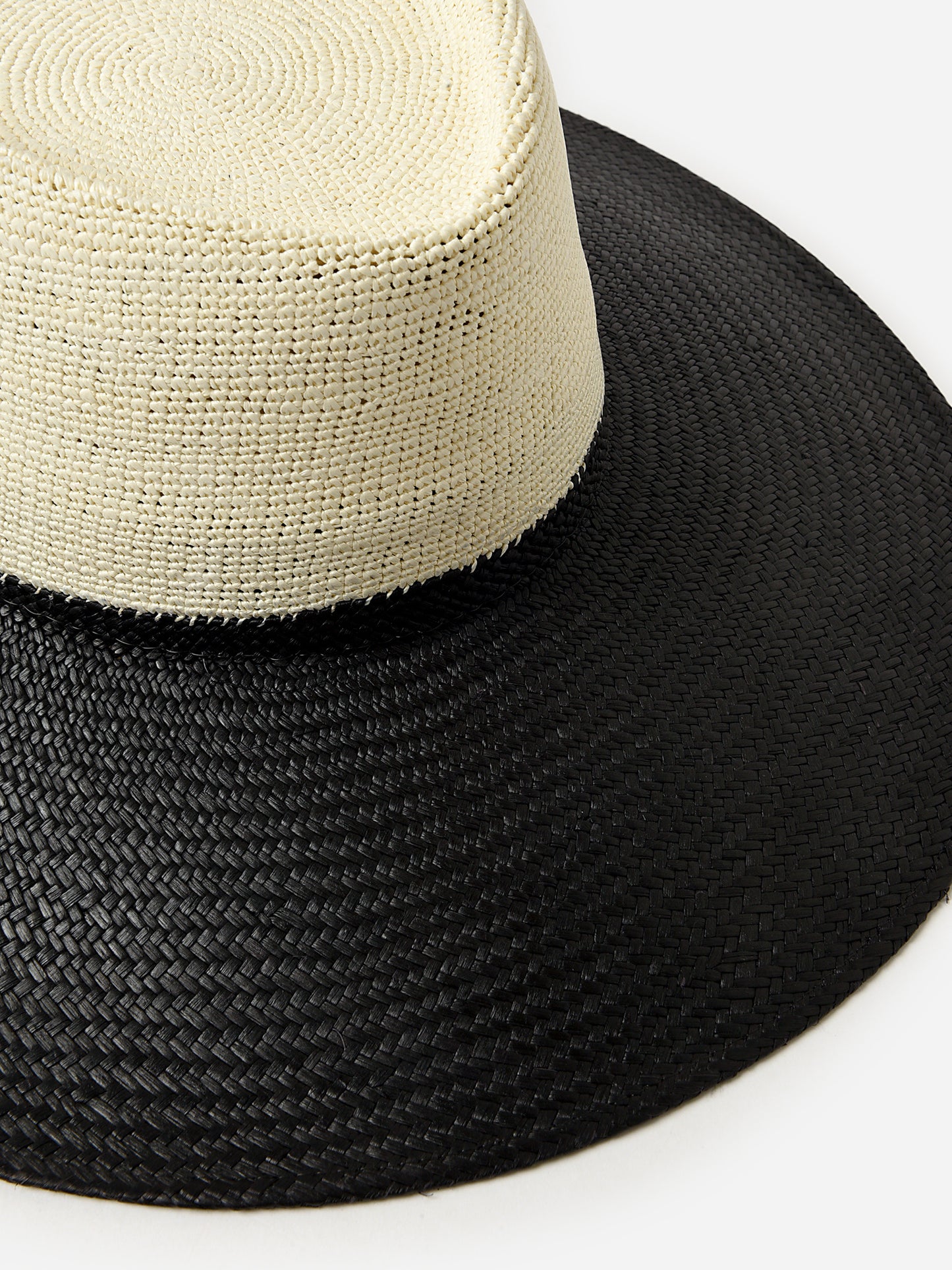 A two-tone colorblock hat with a crocheted crown and handwoven brim.