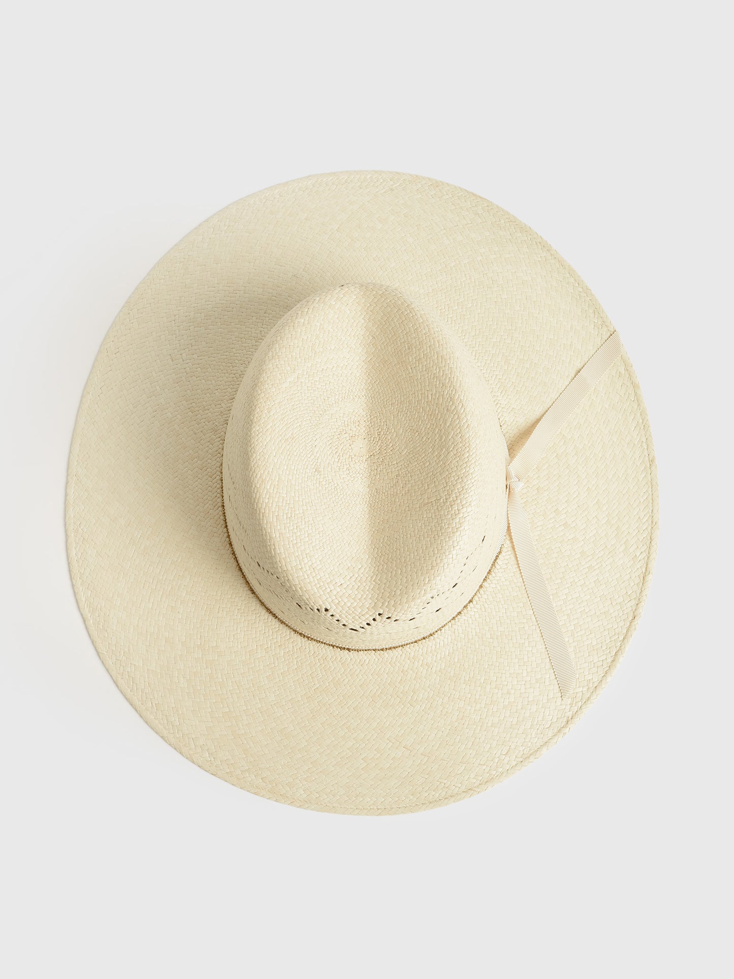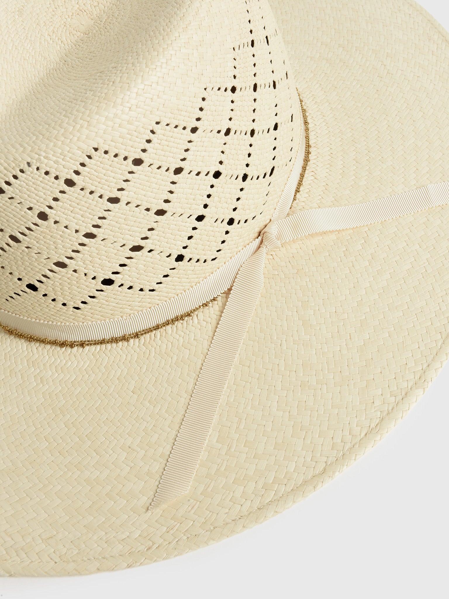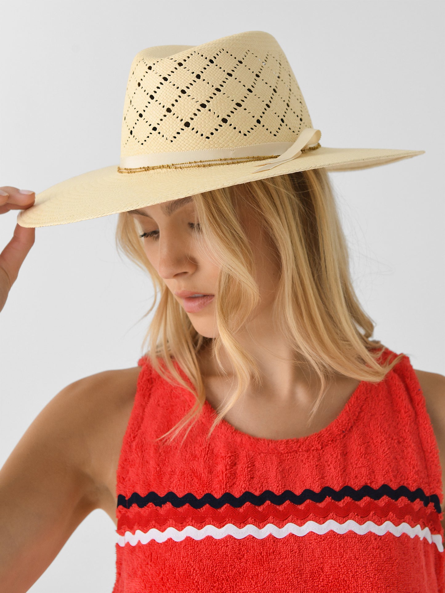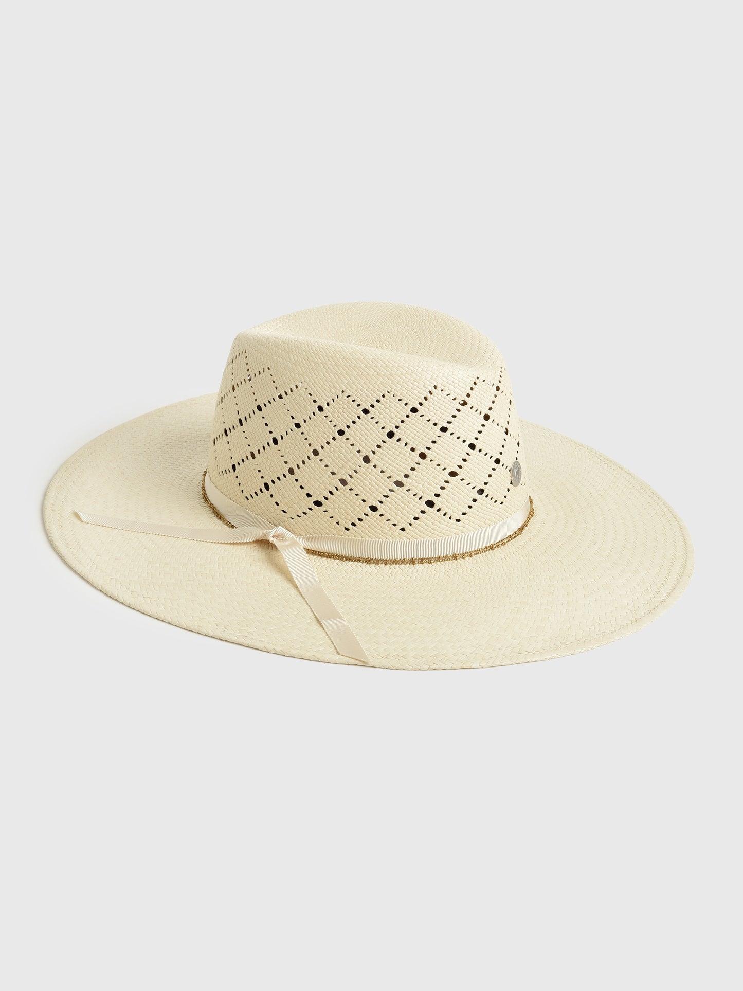 This hat features a diamond-patterned crown and a solid woven brim. It showcases a new crown shape, distinguished by its center crease, and is adorned with a grosgrain ribbon and a delicate brass chain.