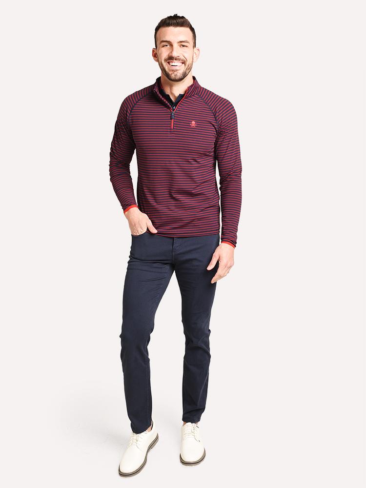 The G/Fore Men's Striped Midlayer 1/4 Zip Sweater delivers warmth, comfort and exceptional mobility whether you're at the gym or the course, this midlayer will keep your performance high swing after swing.