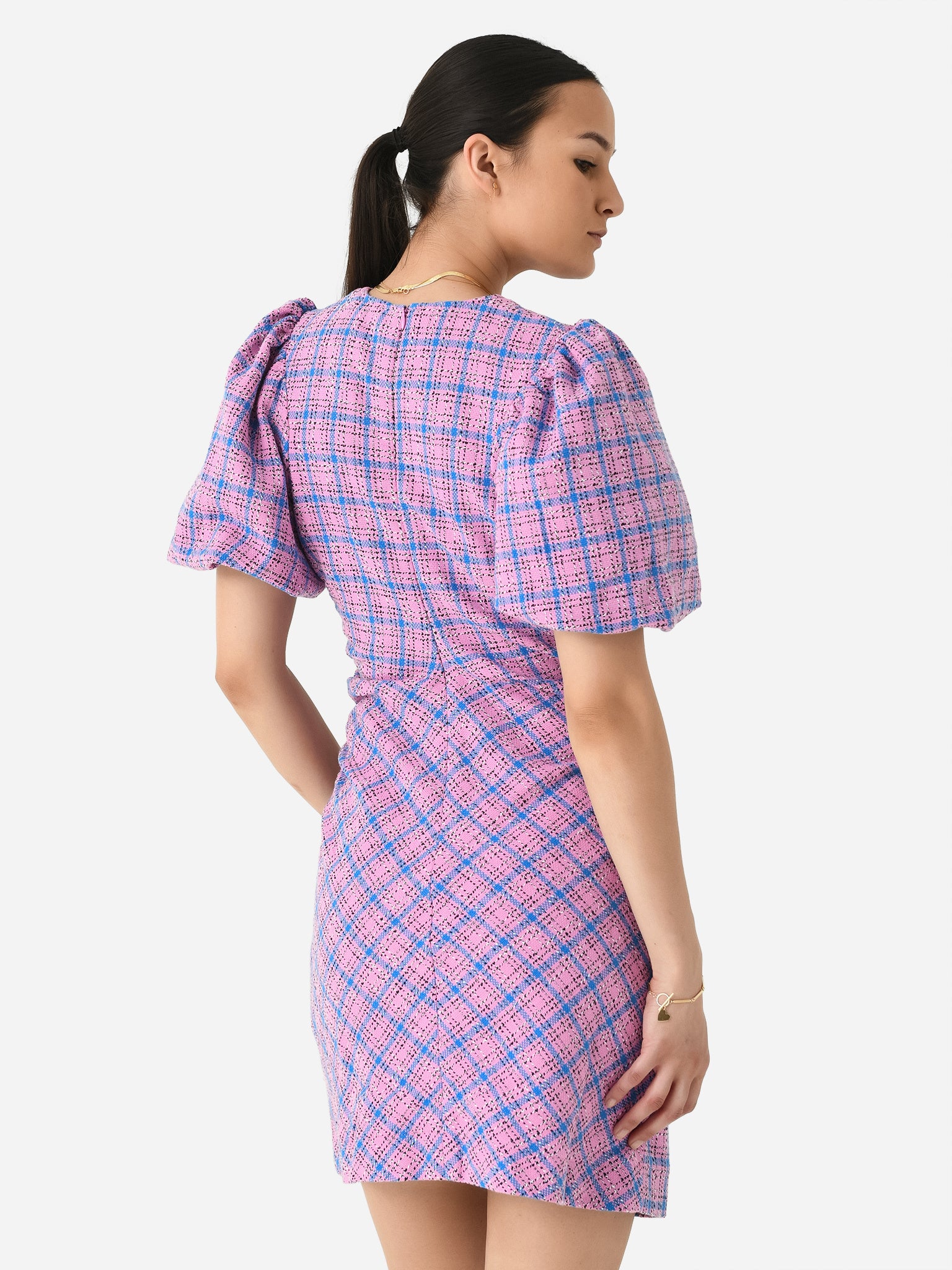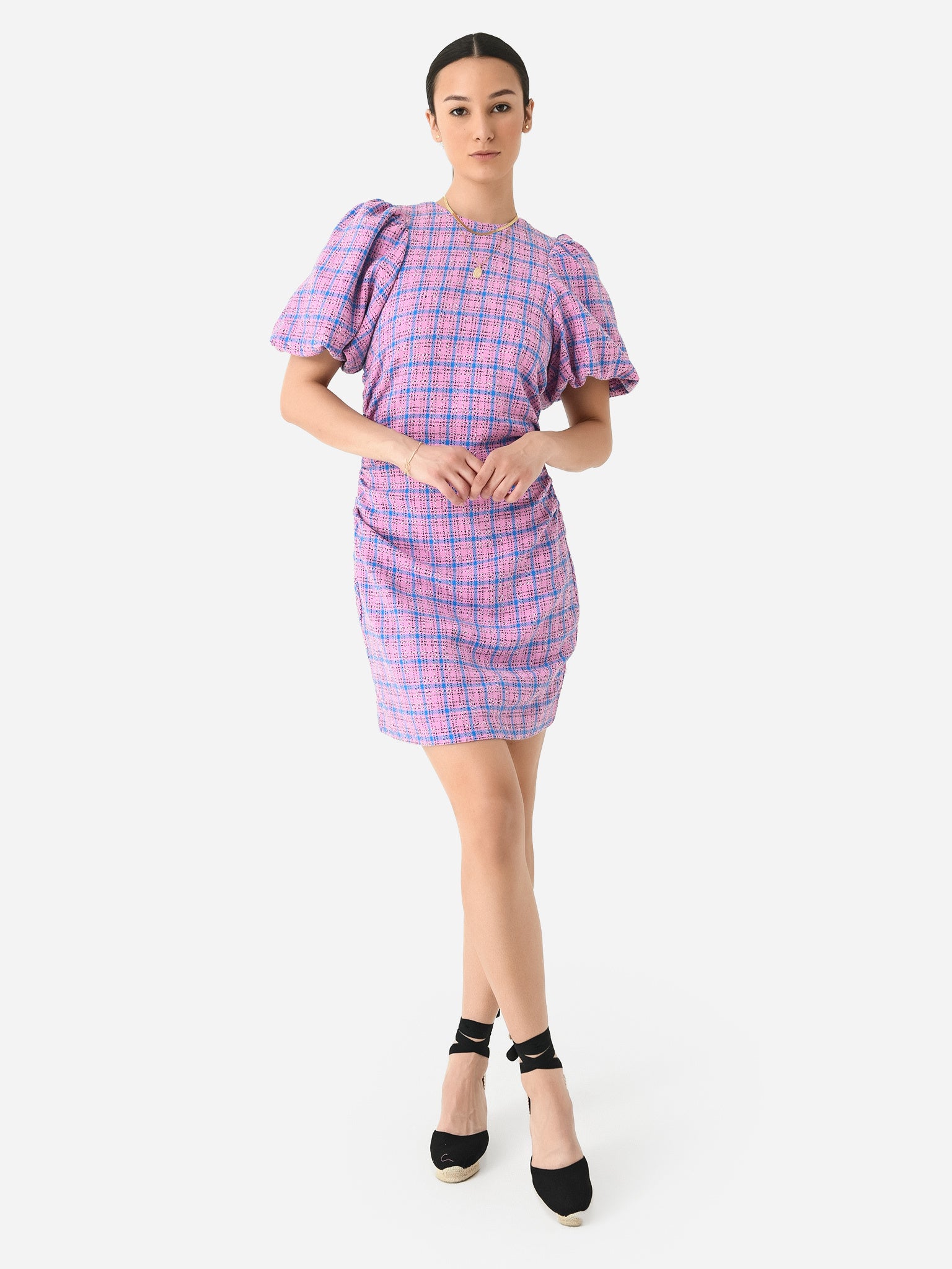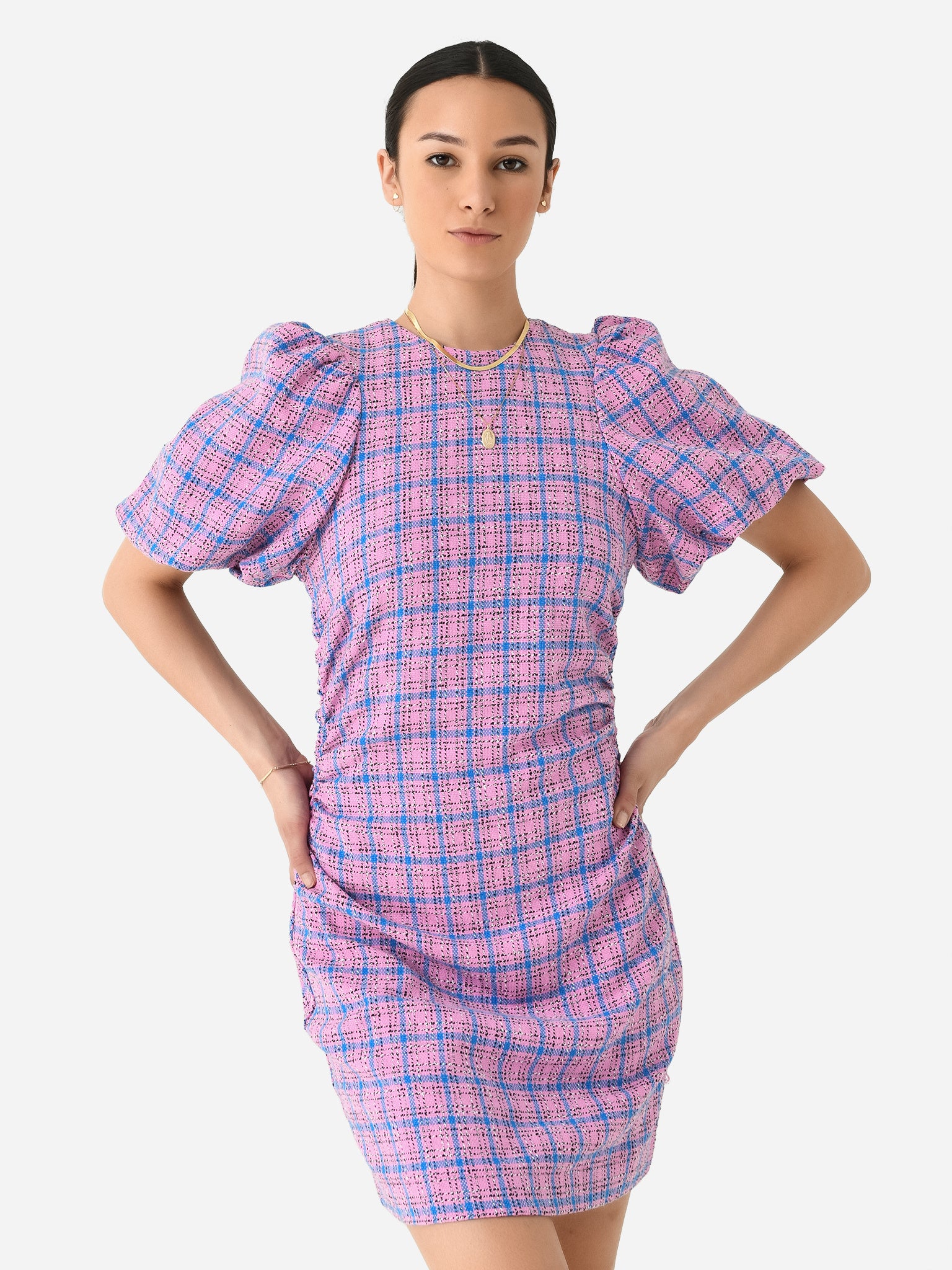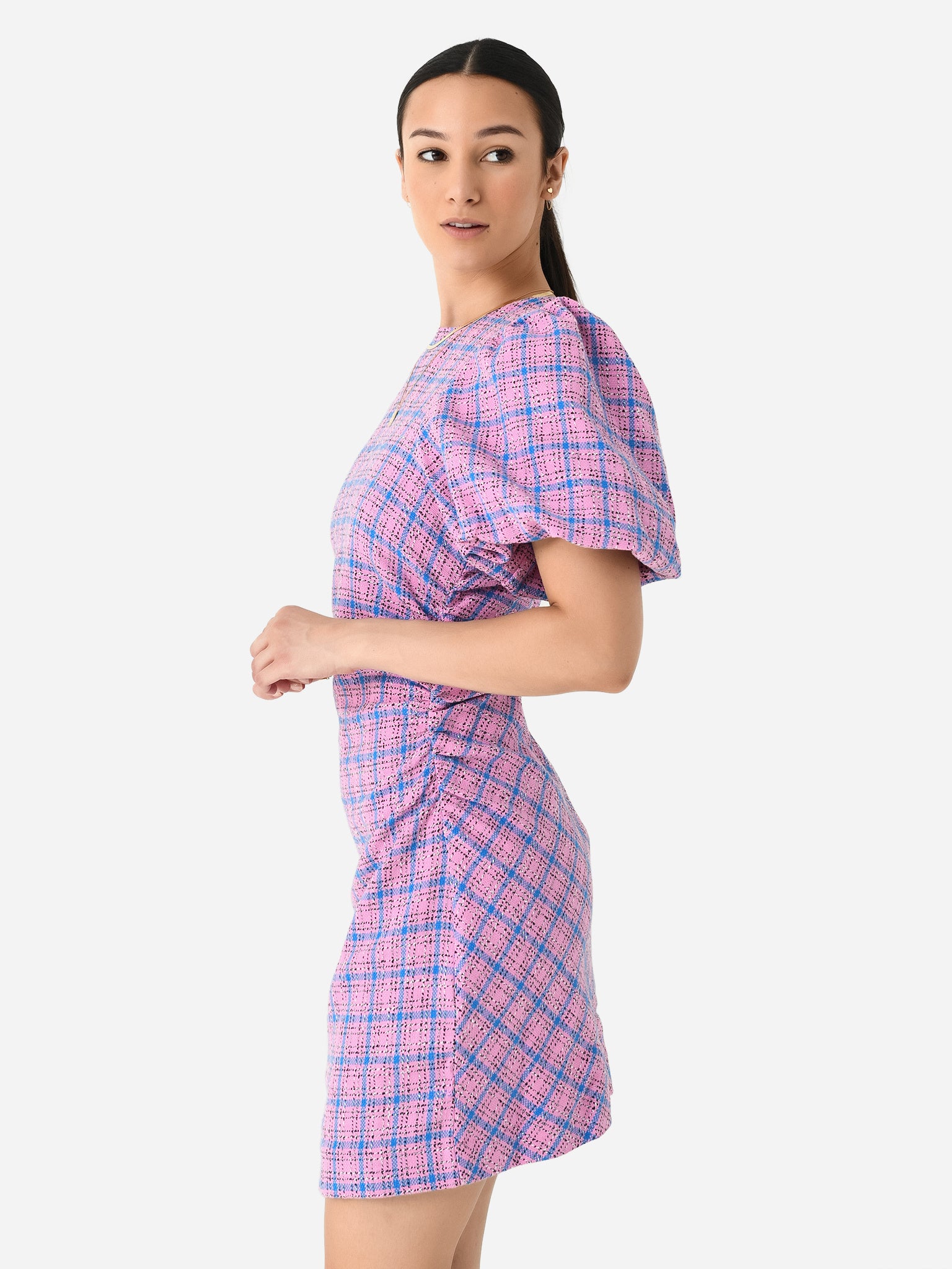 Checkered mini dress featuring short puff sleeves and gathered side ruching.