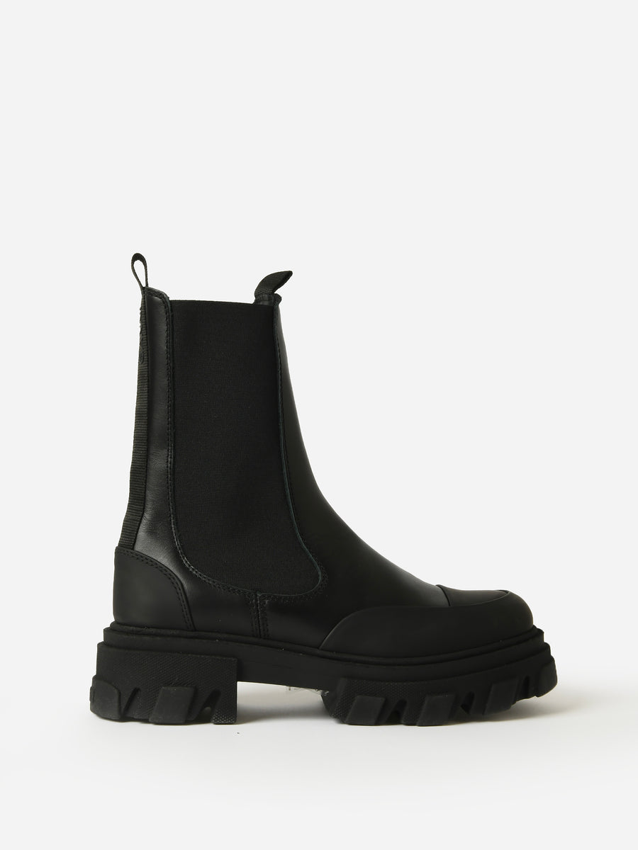 Leather Chelsea boot with a chunky cleated sole and mid-height silhouette.