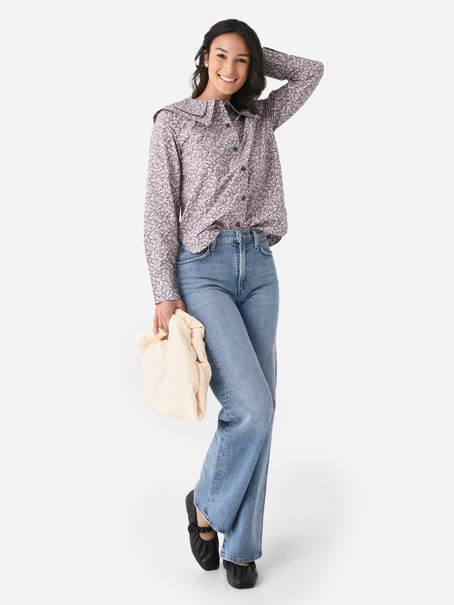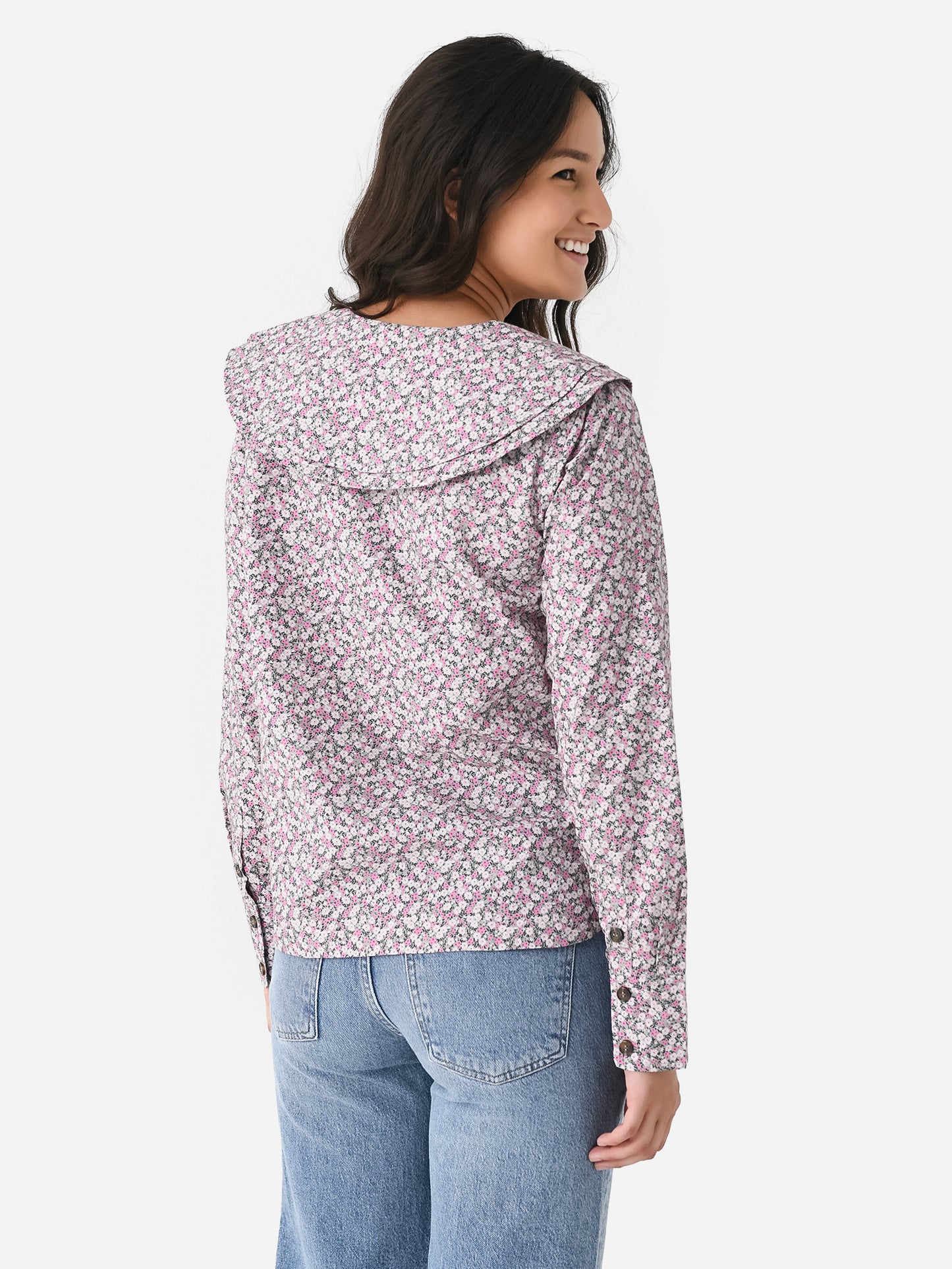 Floral-printed button-down shirt featuring a unique double-layered collar.