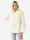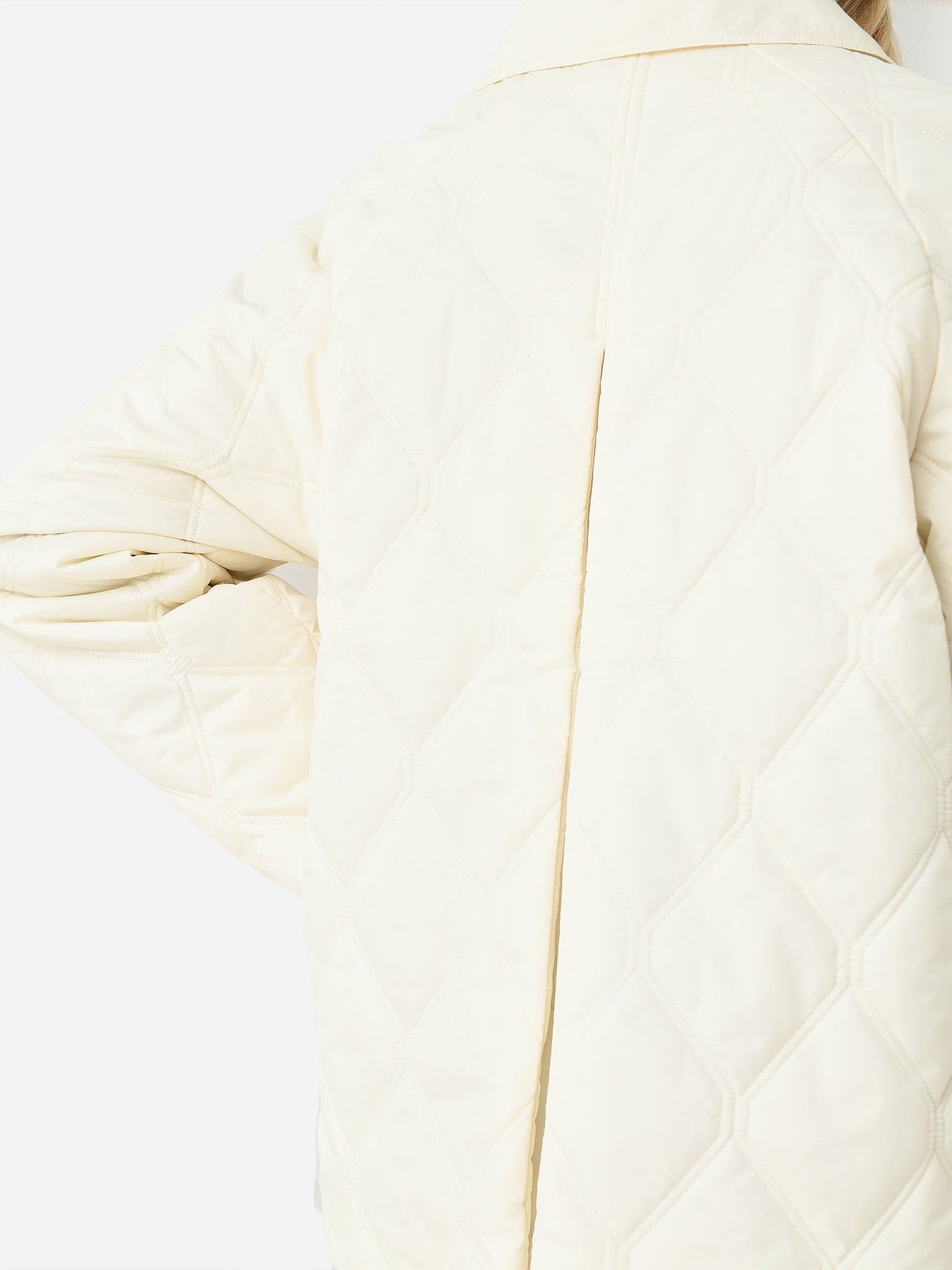 A lightly quilted jacket made from recycled ripstop fabric with a large collar and asymmetrical button closure.