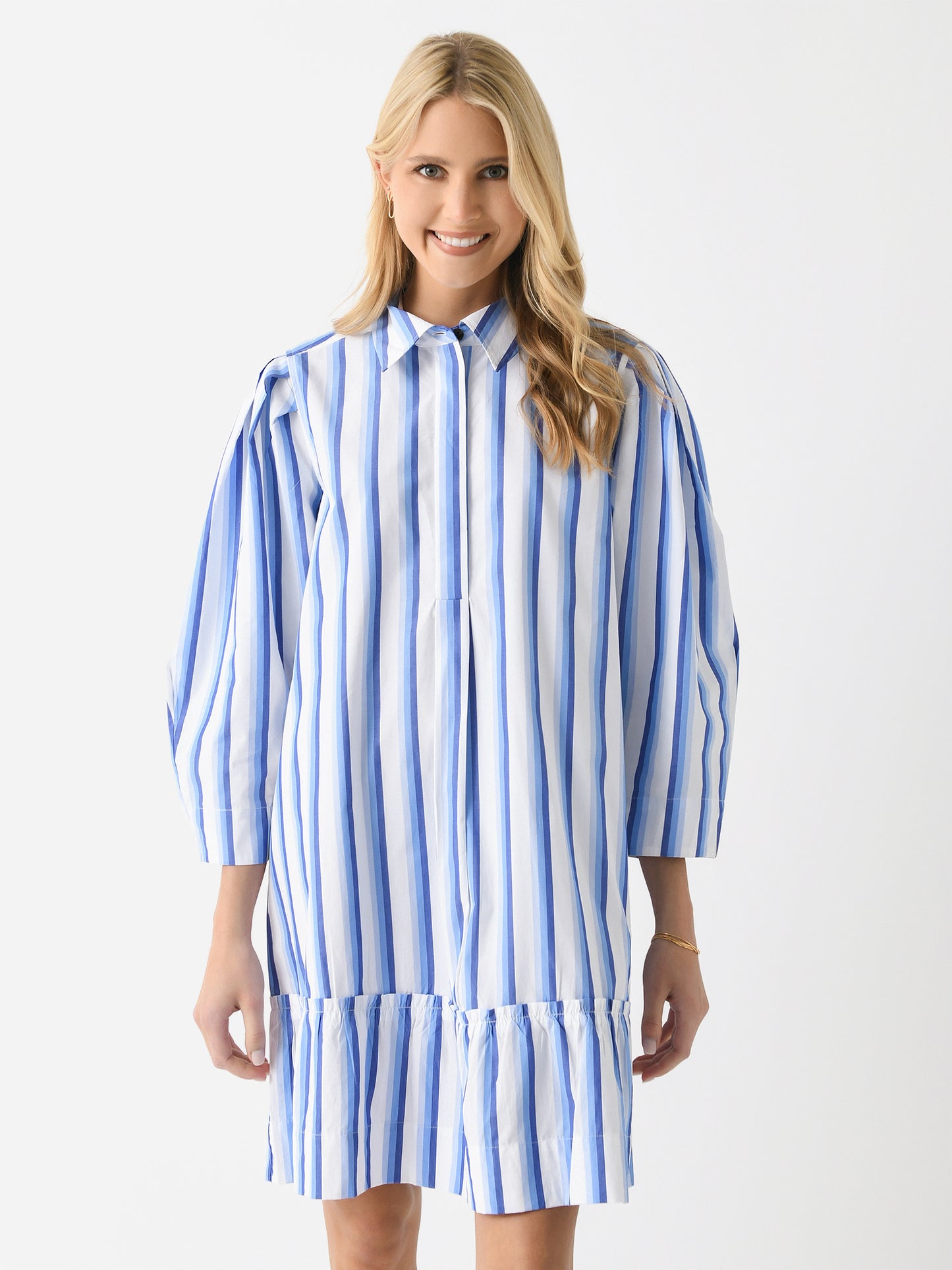 An elevated shirt dress with a hidden placket and ruffle hem.