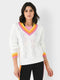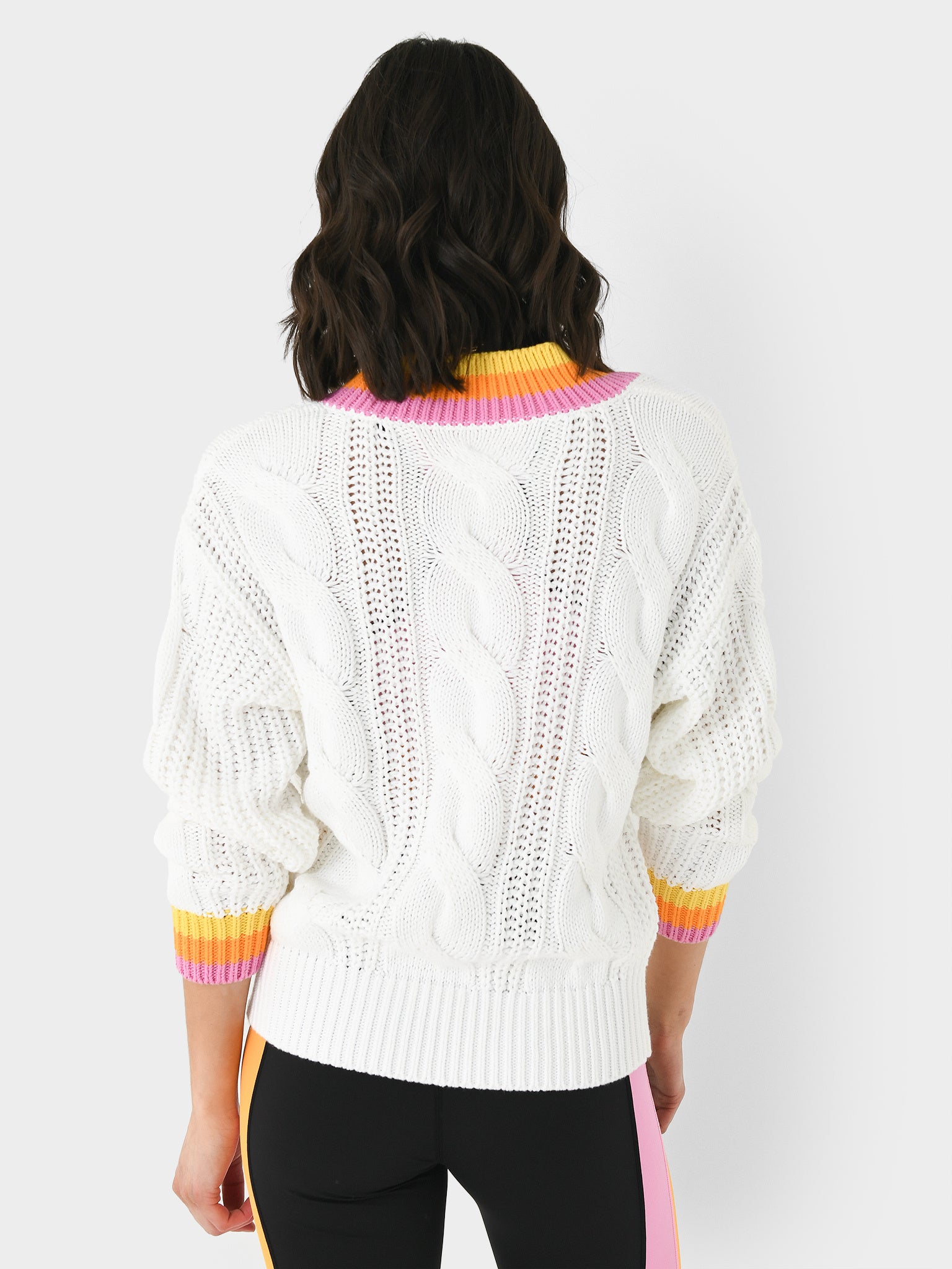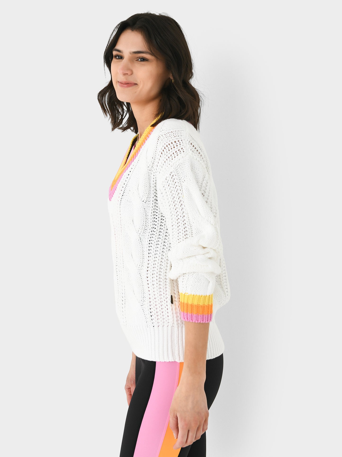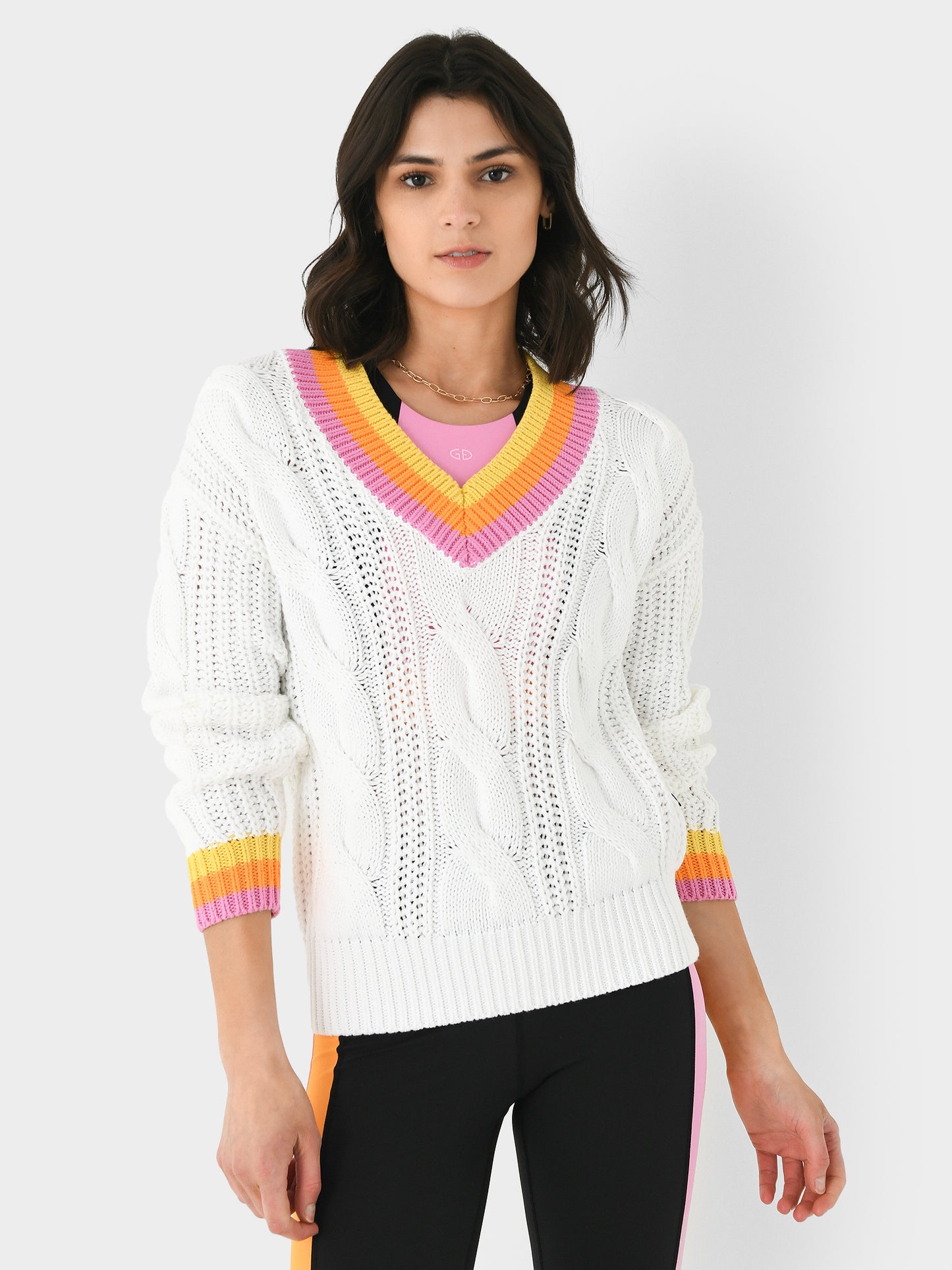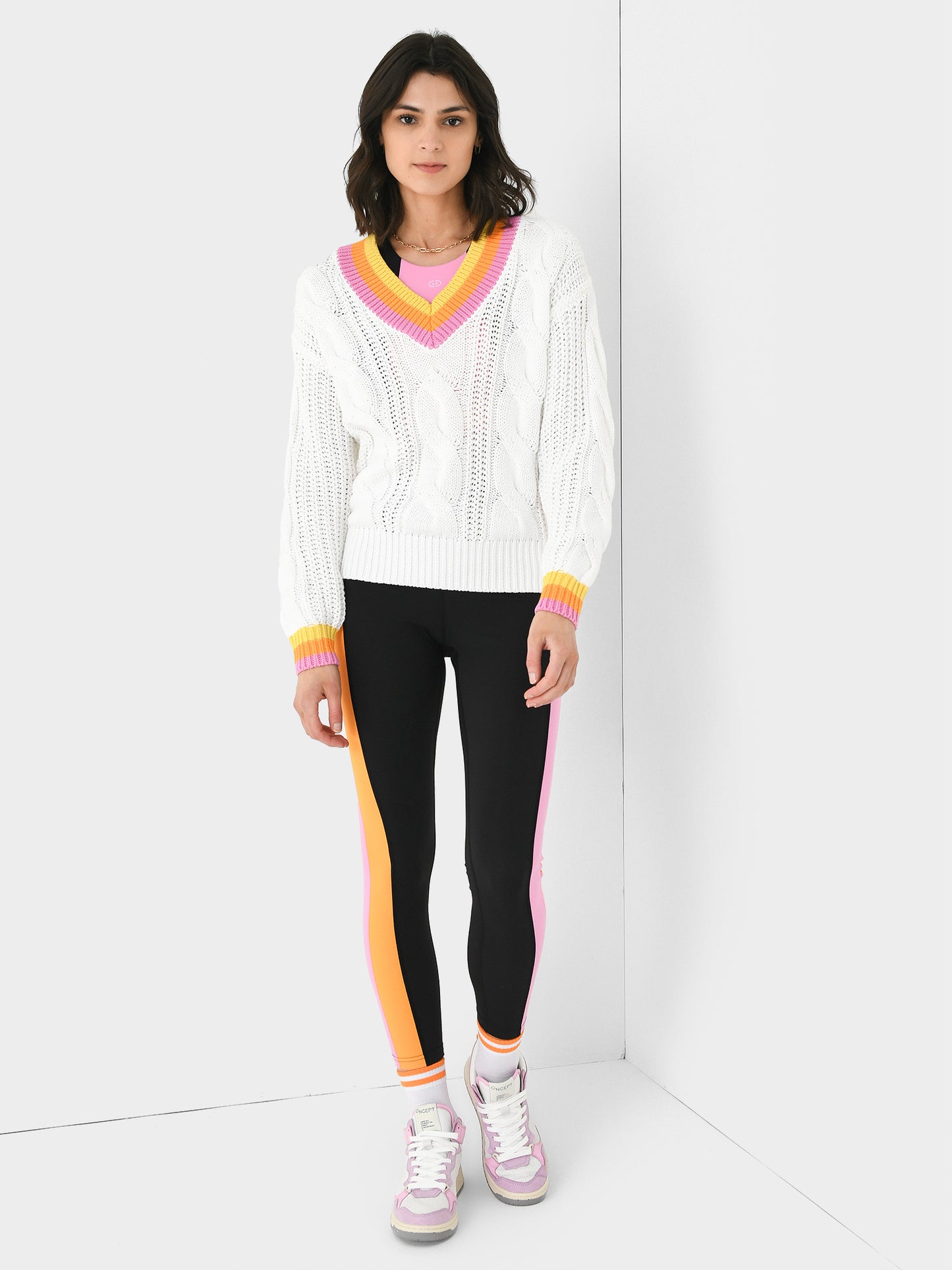 A sporty v-neck sweater featuring bright color-block ribbed trims and a chunky knit construction.