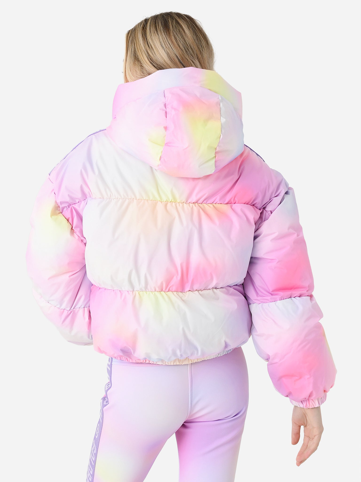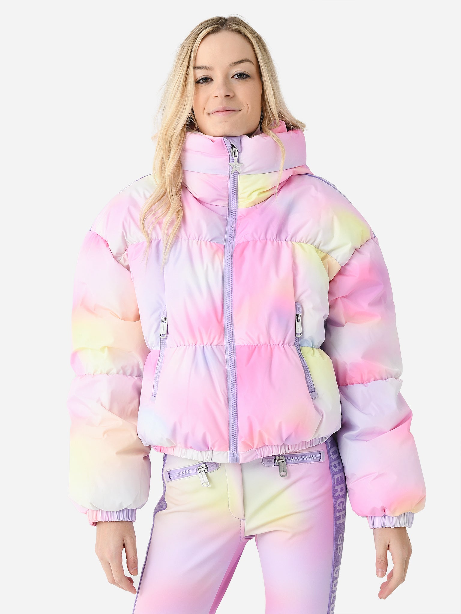 A colorful pastel jacket with warm, down insulation, a detachable snow skirt, and a waterproof finish.