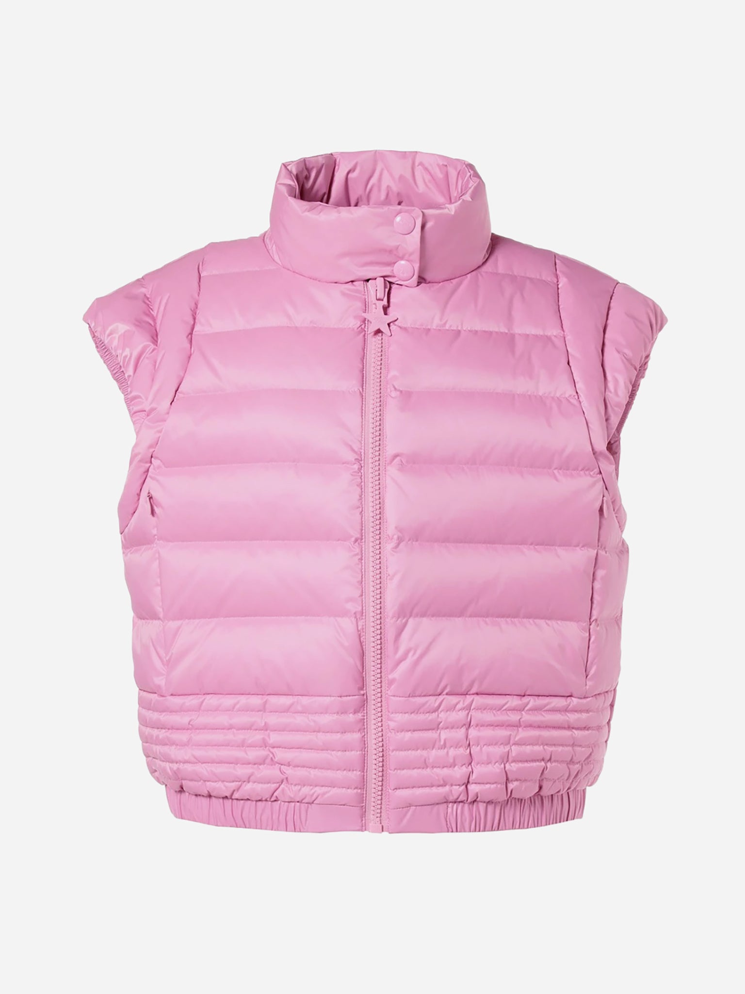 A quilted vest with cap sleeves, a water-repellent finish, and down insulation.