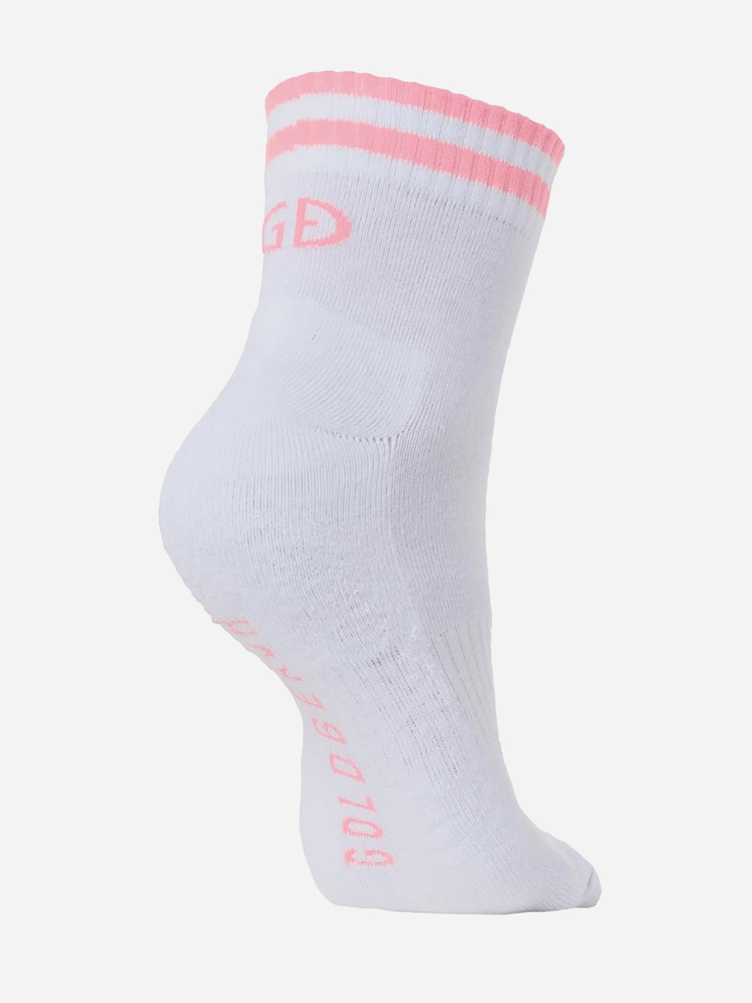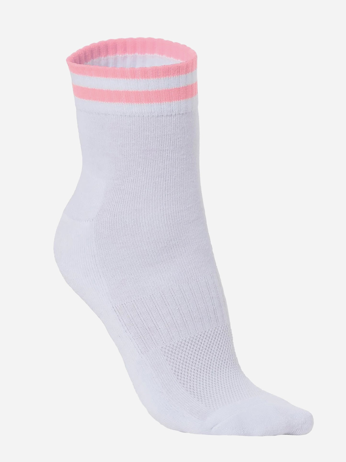 A pair of sporty crew socks with breathable mesh panels and contrast stripe details.