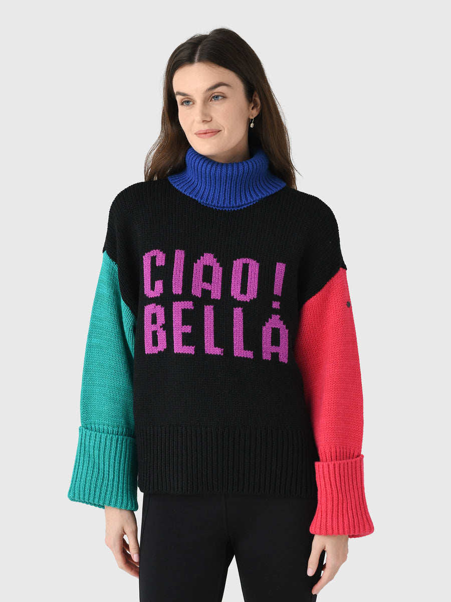 Turtleneck Dropped Shoulder Intarsia Knit Graphic Ribbed Neckline, Cuffs and Hem Knit Fabrication 50% Merino Wool. 50% Acrylic Relaxed Fit