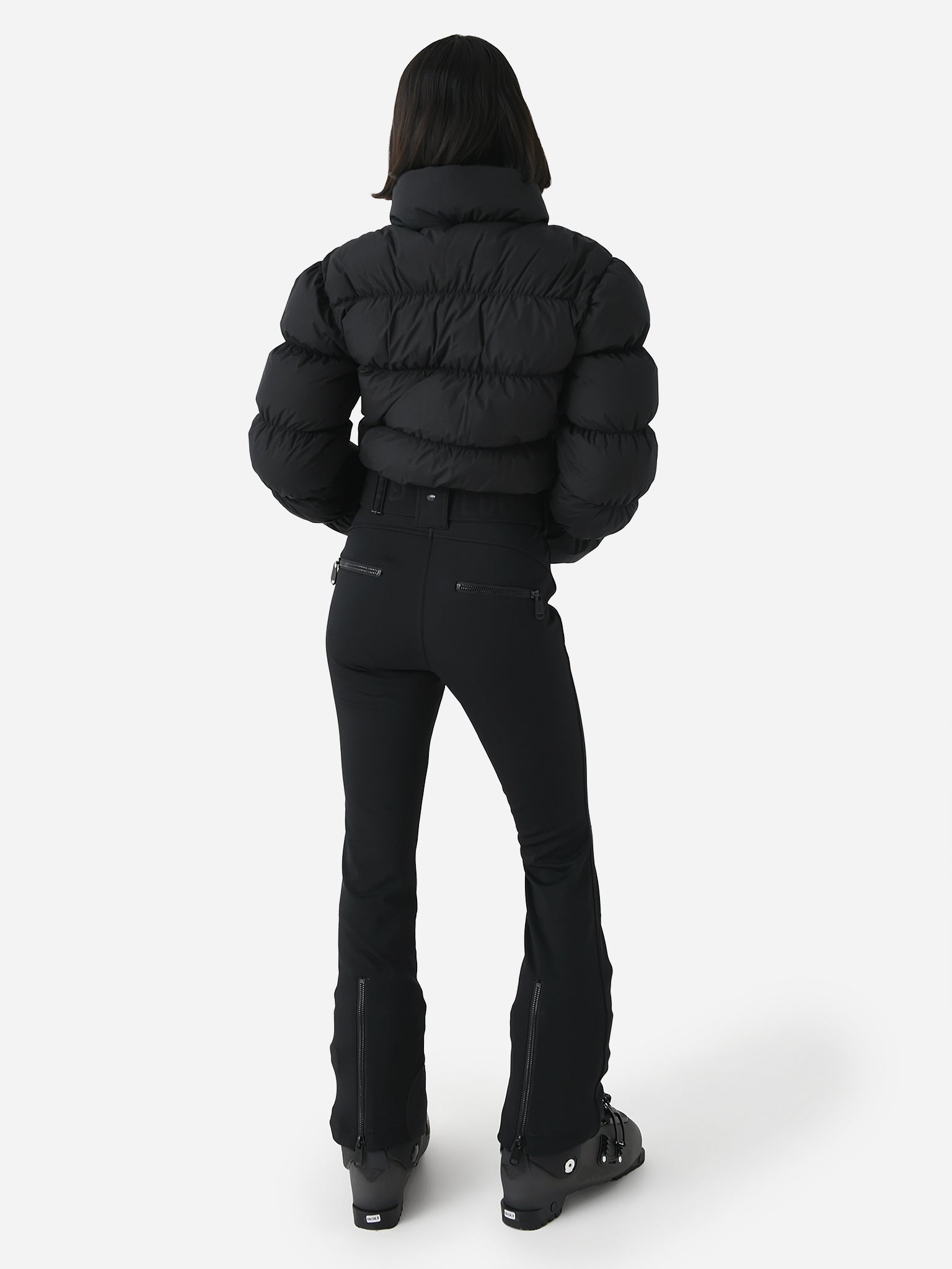 A waterproof ski suit with a down-insulated top, elastic belt, and multiple zipper pockets.