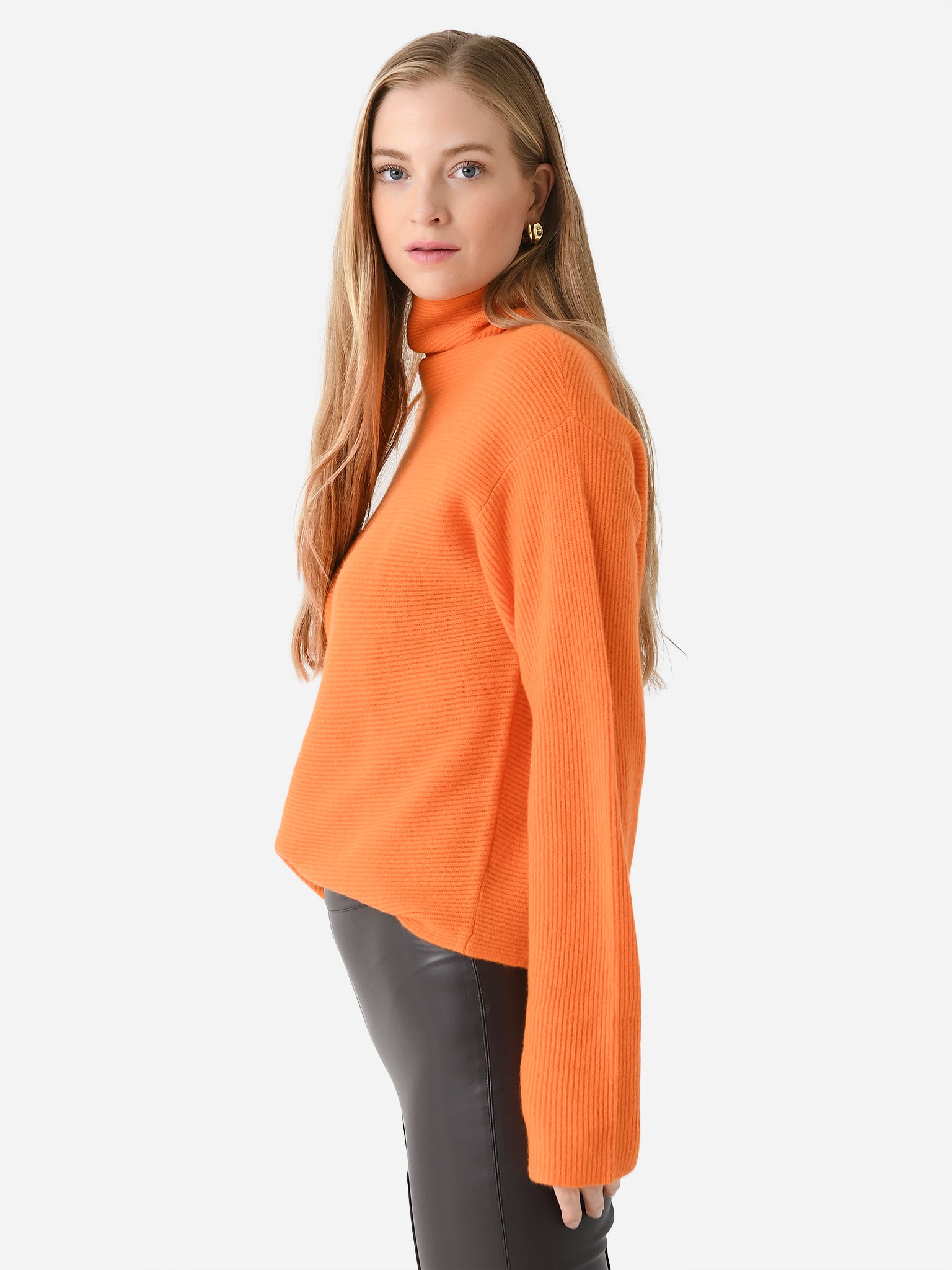 A cozy cashmere ribbed knit turtleneck with a slightly oversized silhouette.