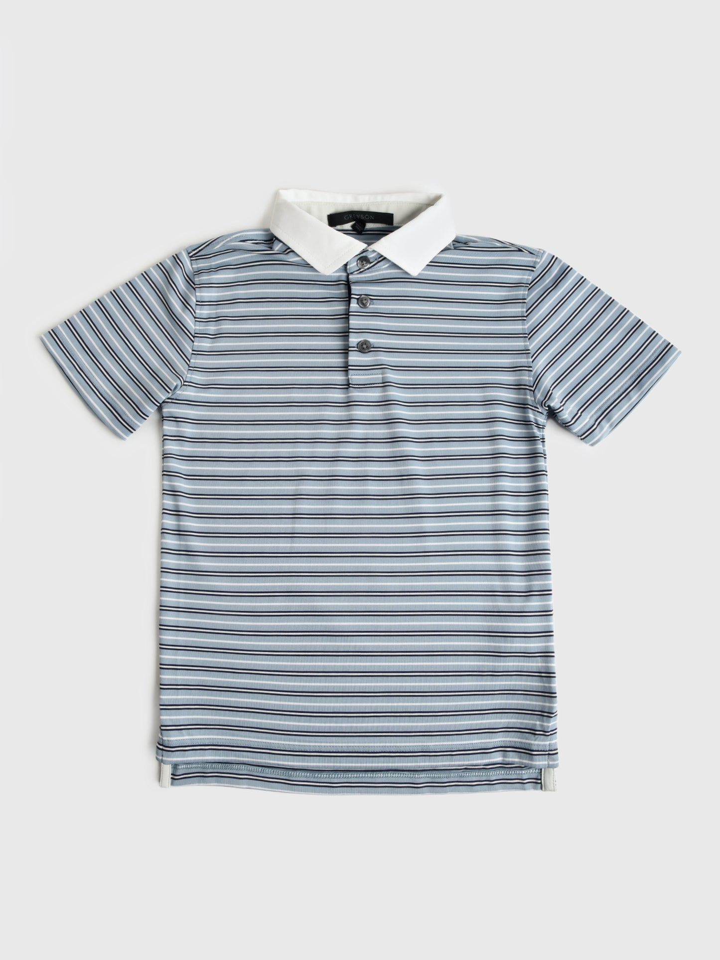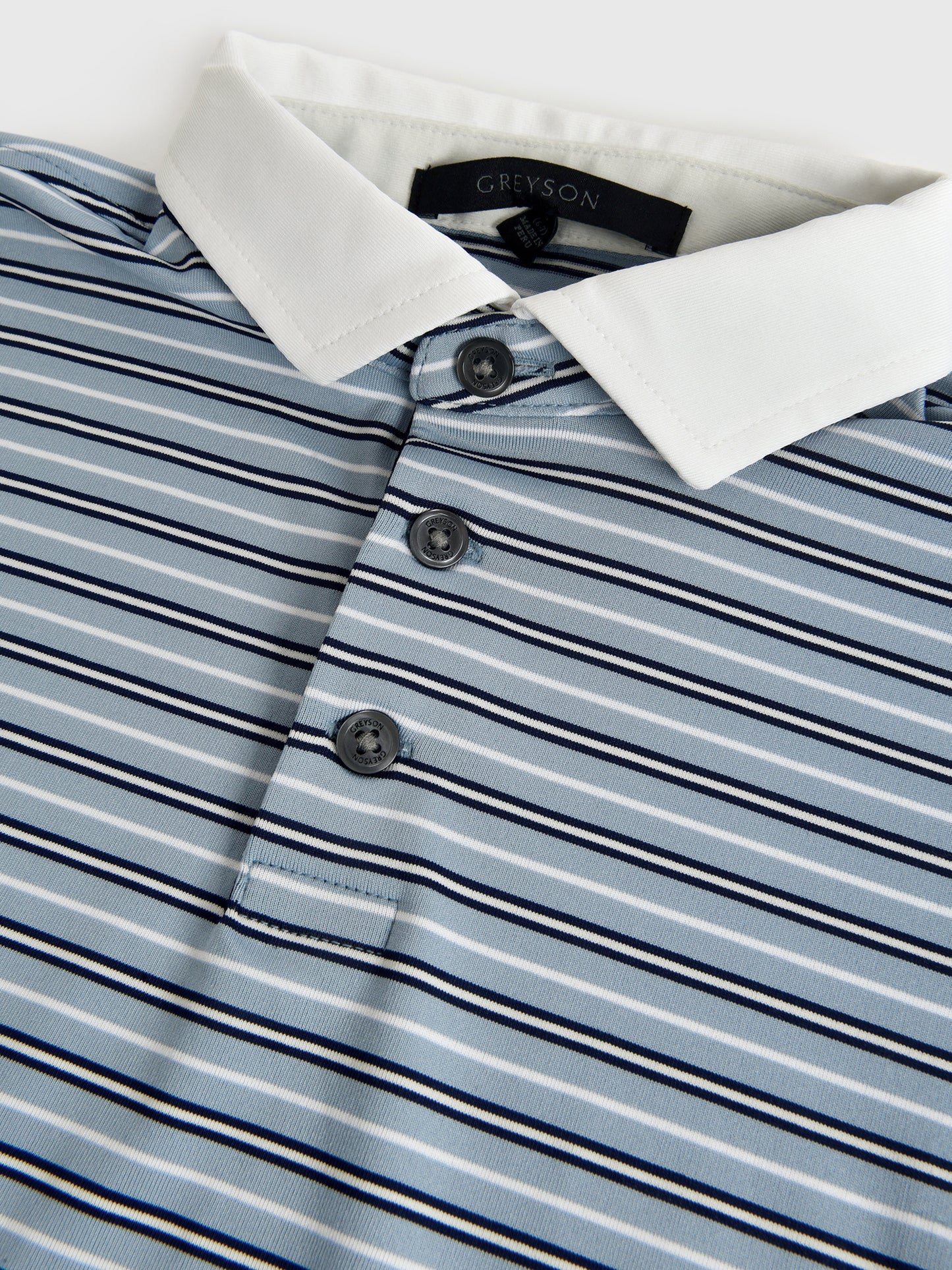 This breathable polo is made from silky performance fabric and features a multi-colored stripe print with a contrast collar.