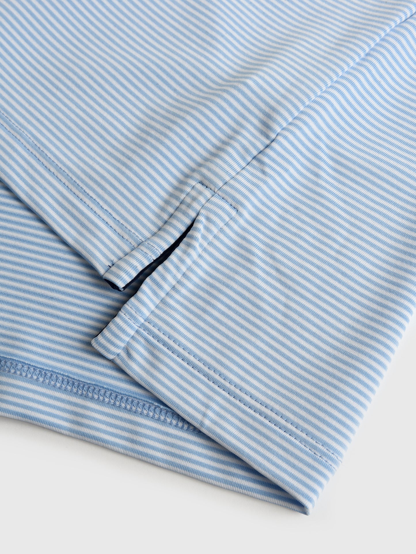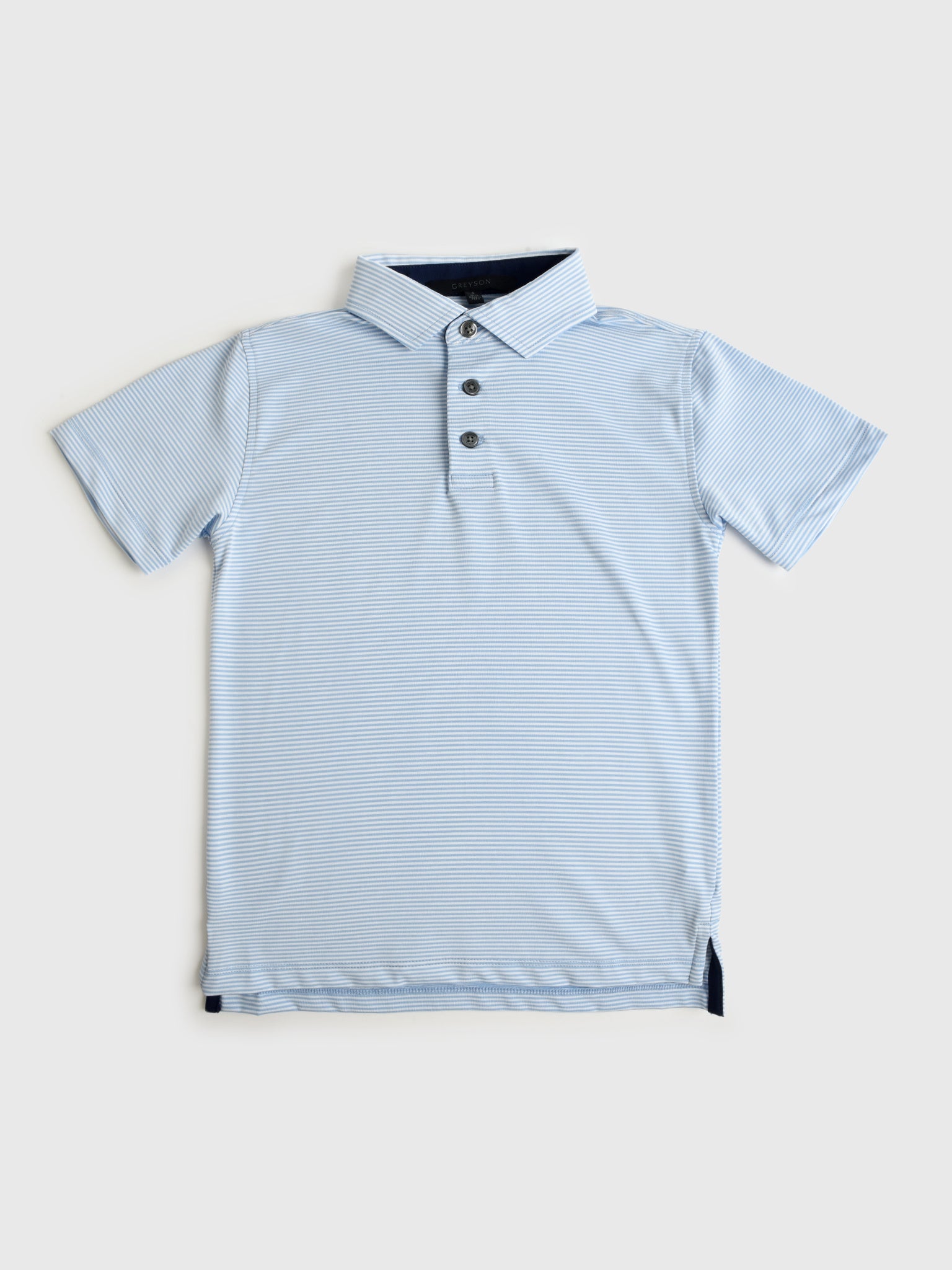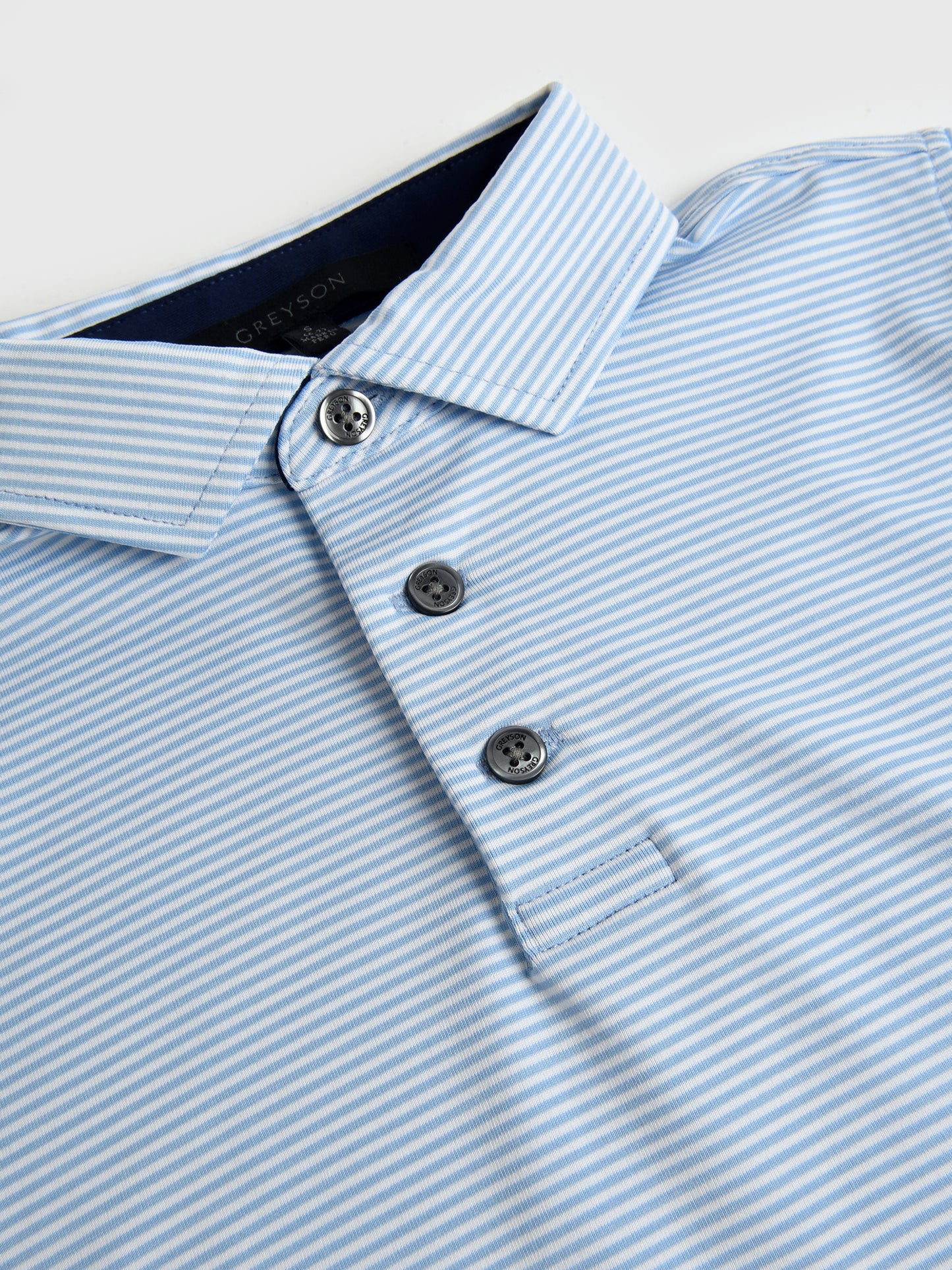 This performance polo, made from breathable sateen fabric with a mini feeder stripe print, will keep him feeling fresh and looking sharp.