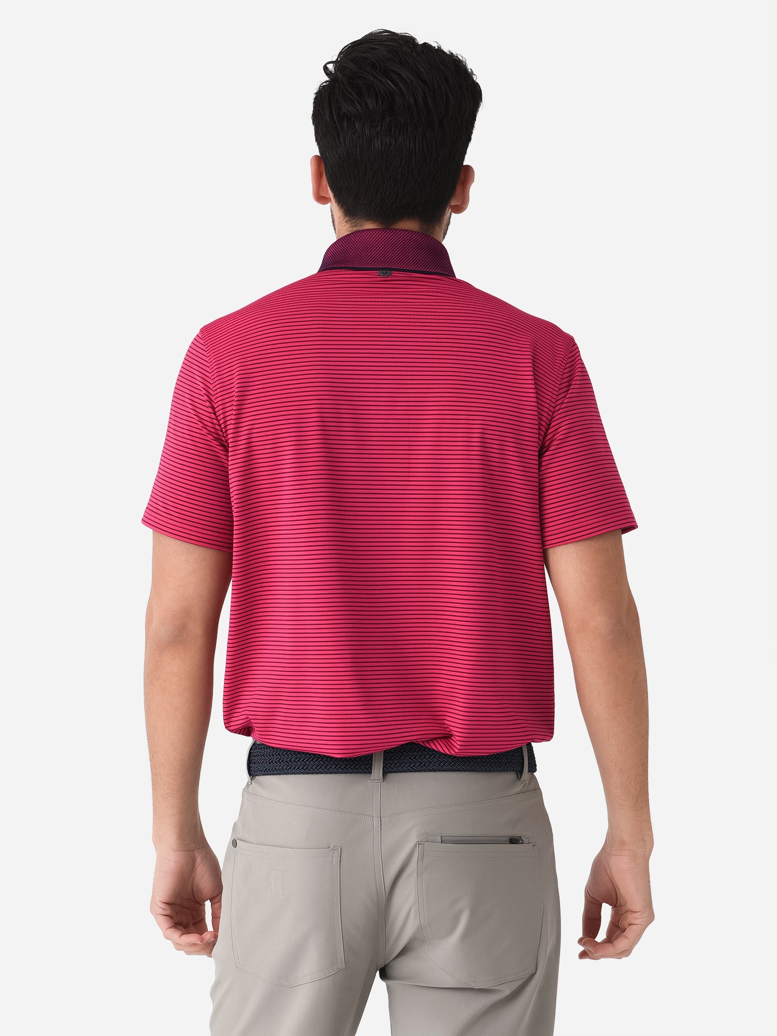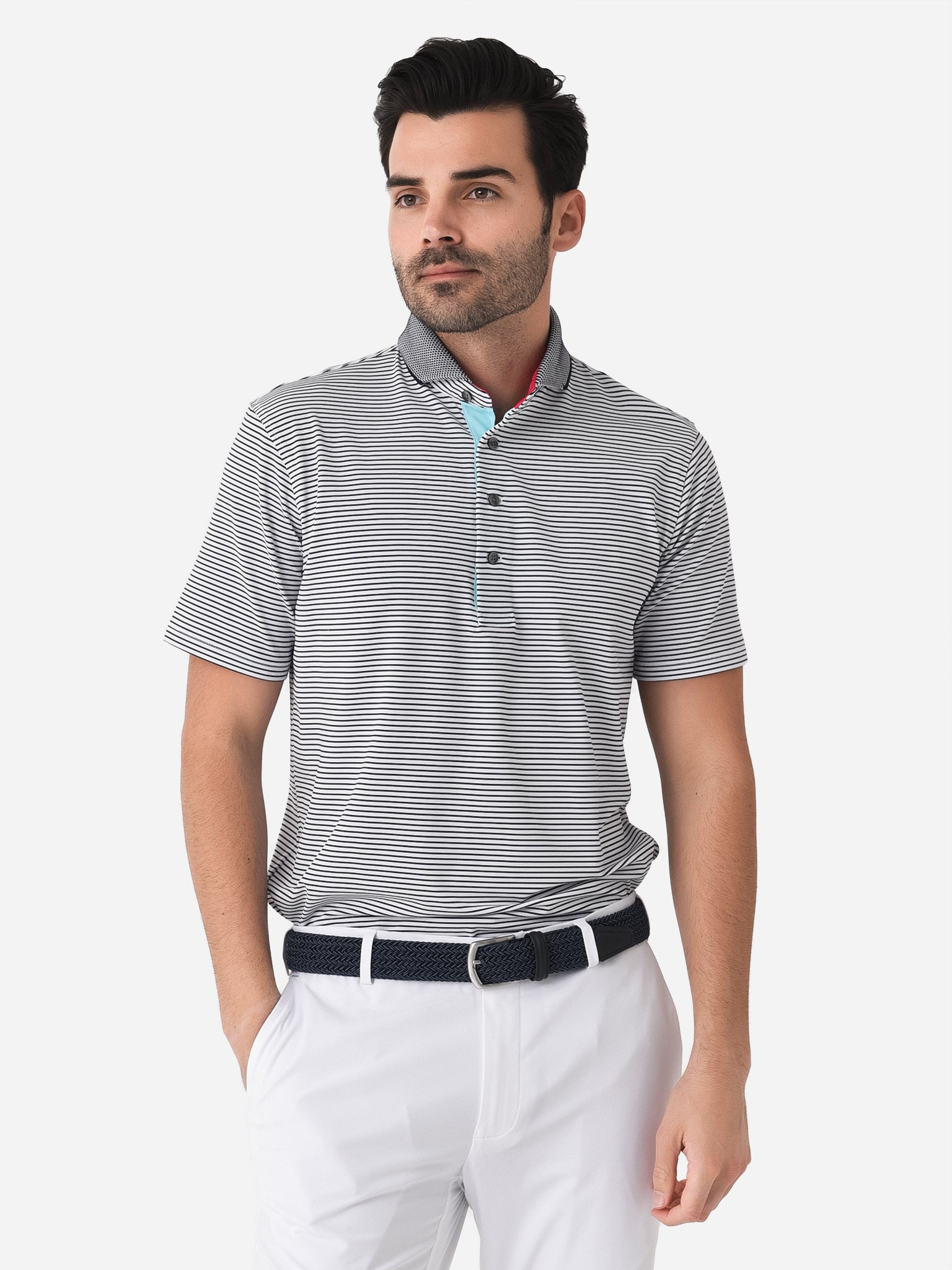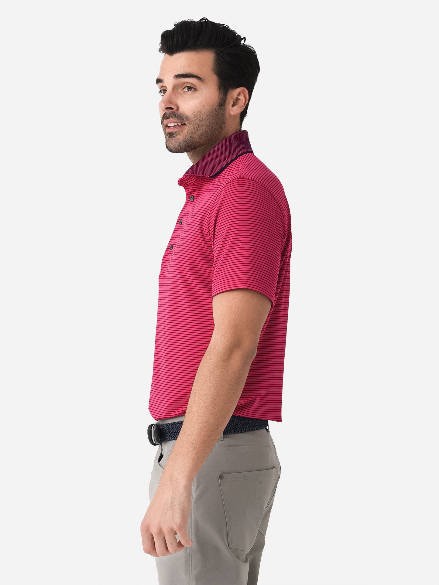 Striped performance polo featuring a cutaway collar and four-button placket.