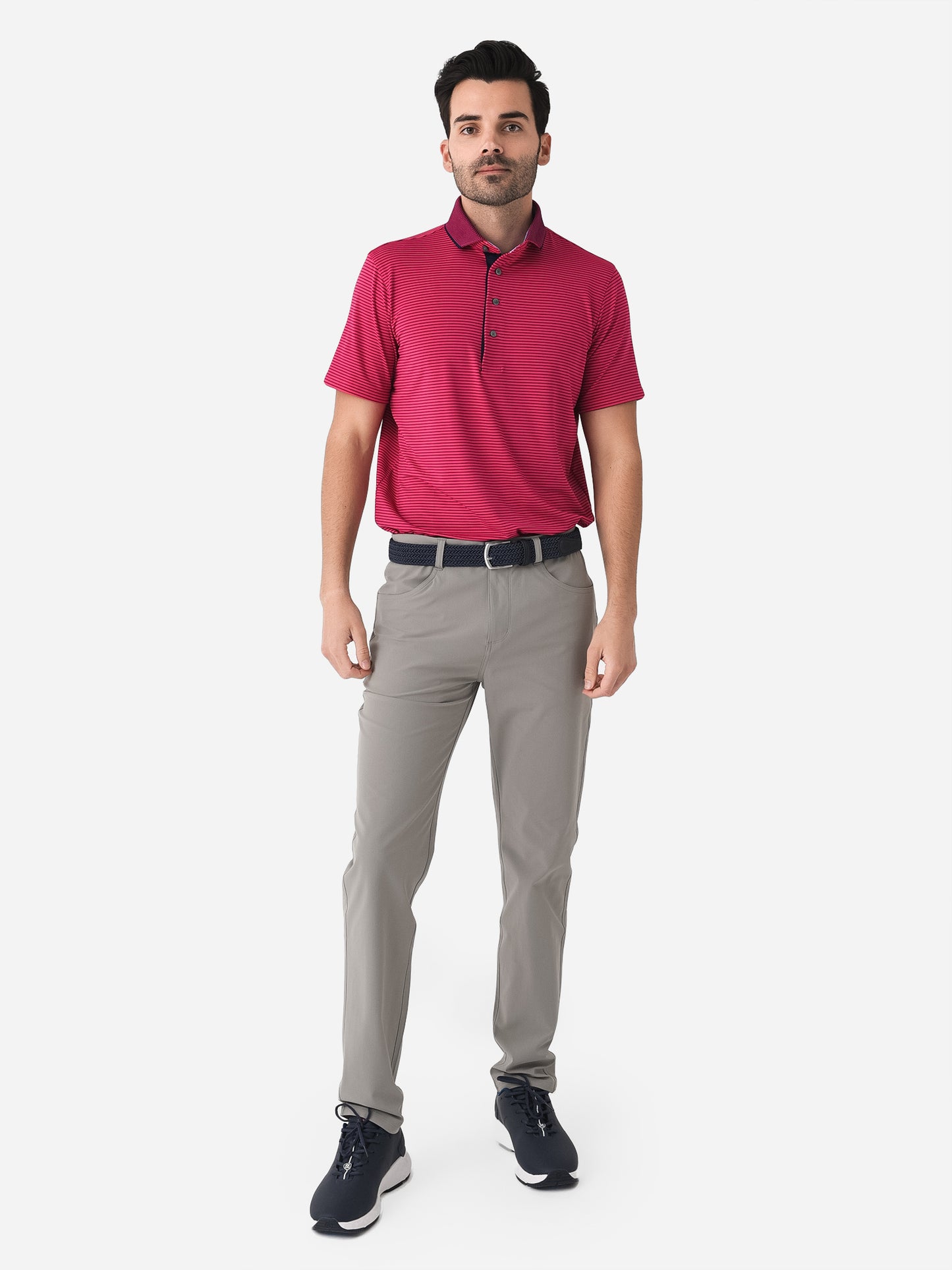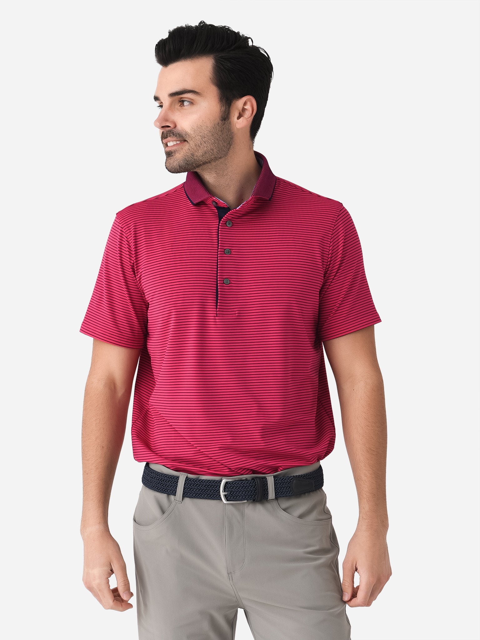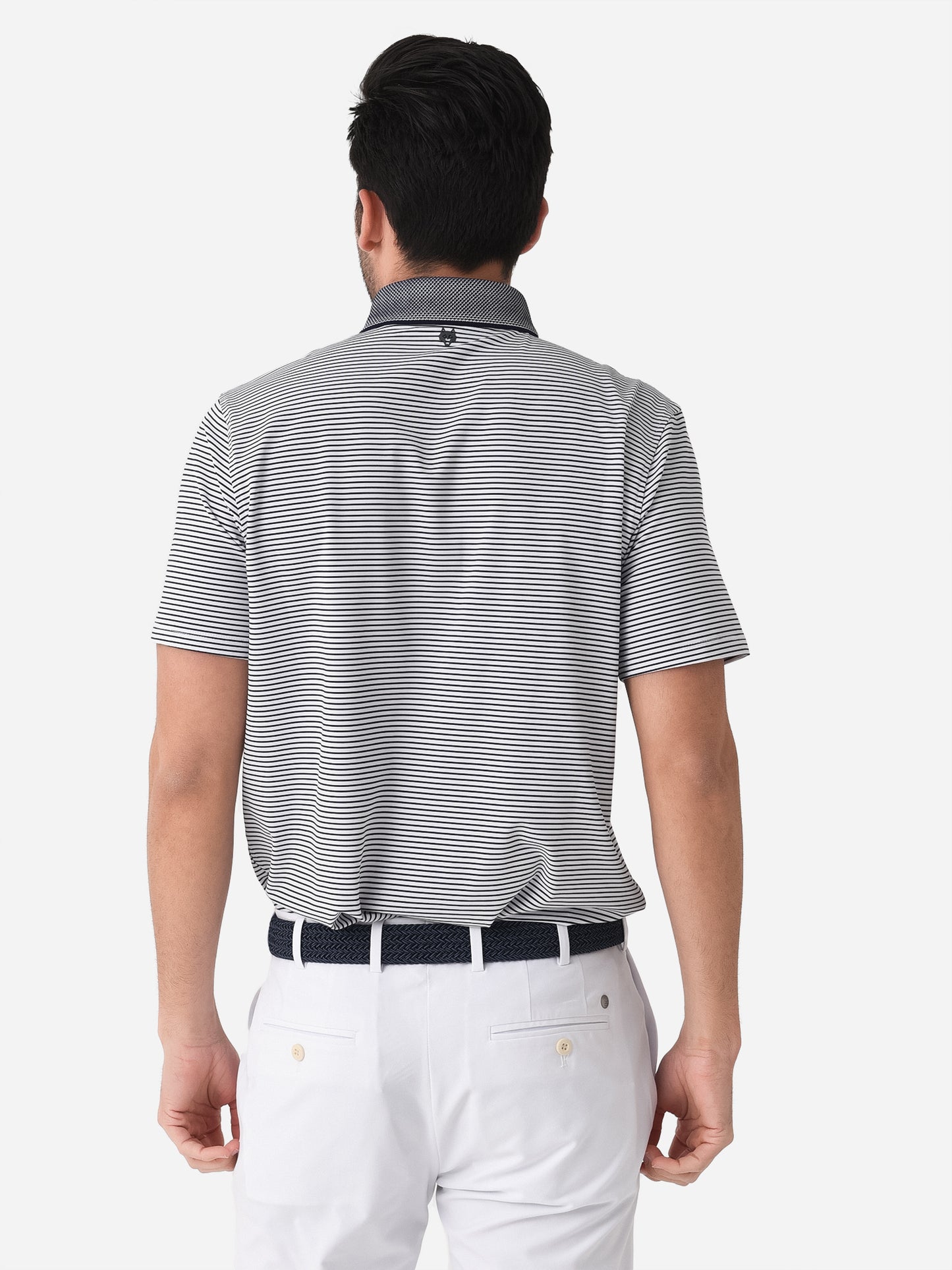 Striped performance polo featuring a cutaway collar and four-button placket.