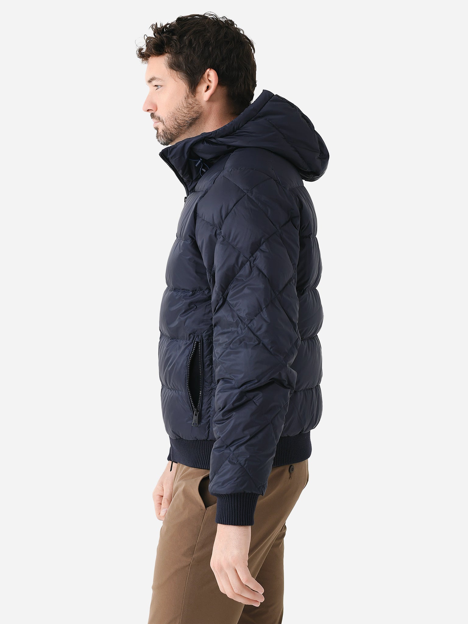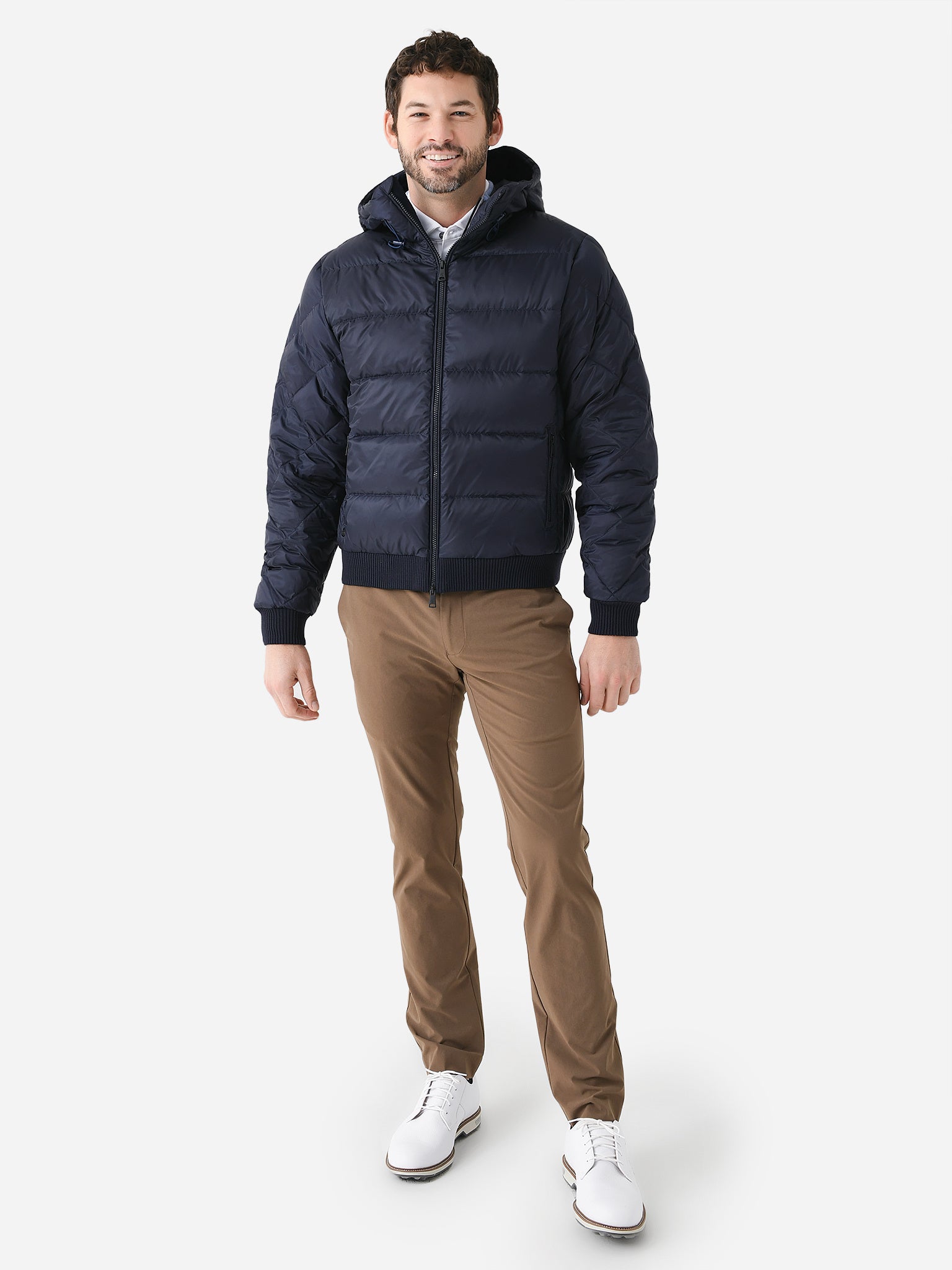 This lightweight yet ultra-warm hooded jacket features an innovative construction with thermal down insulation.