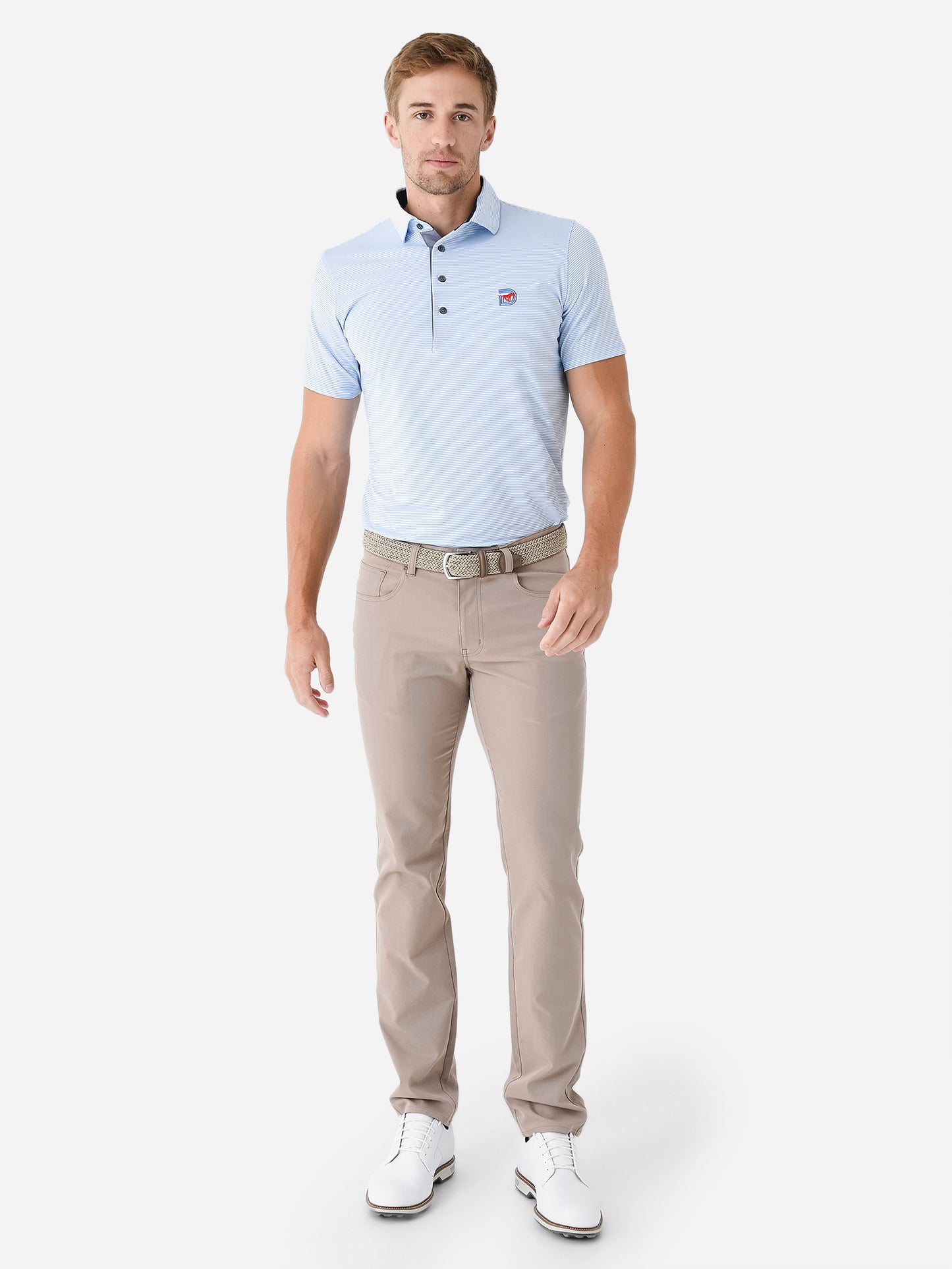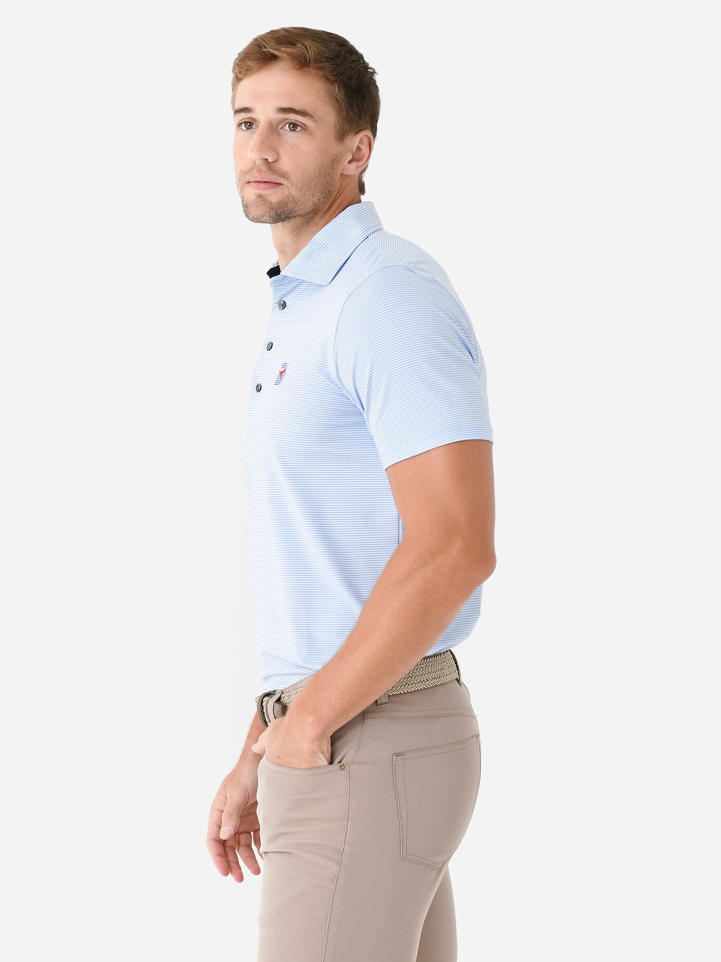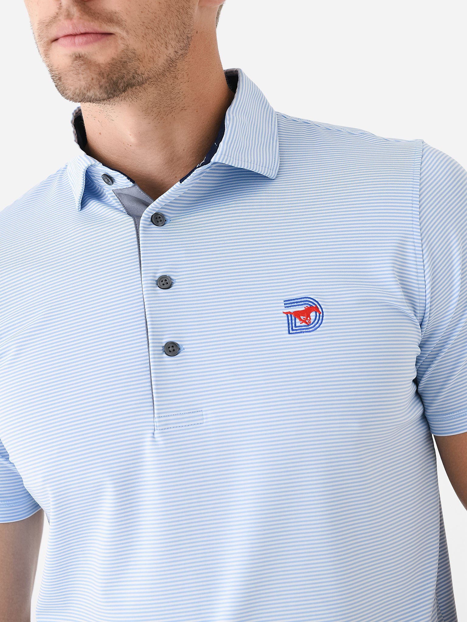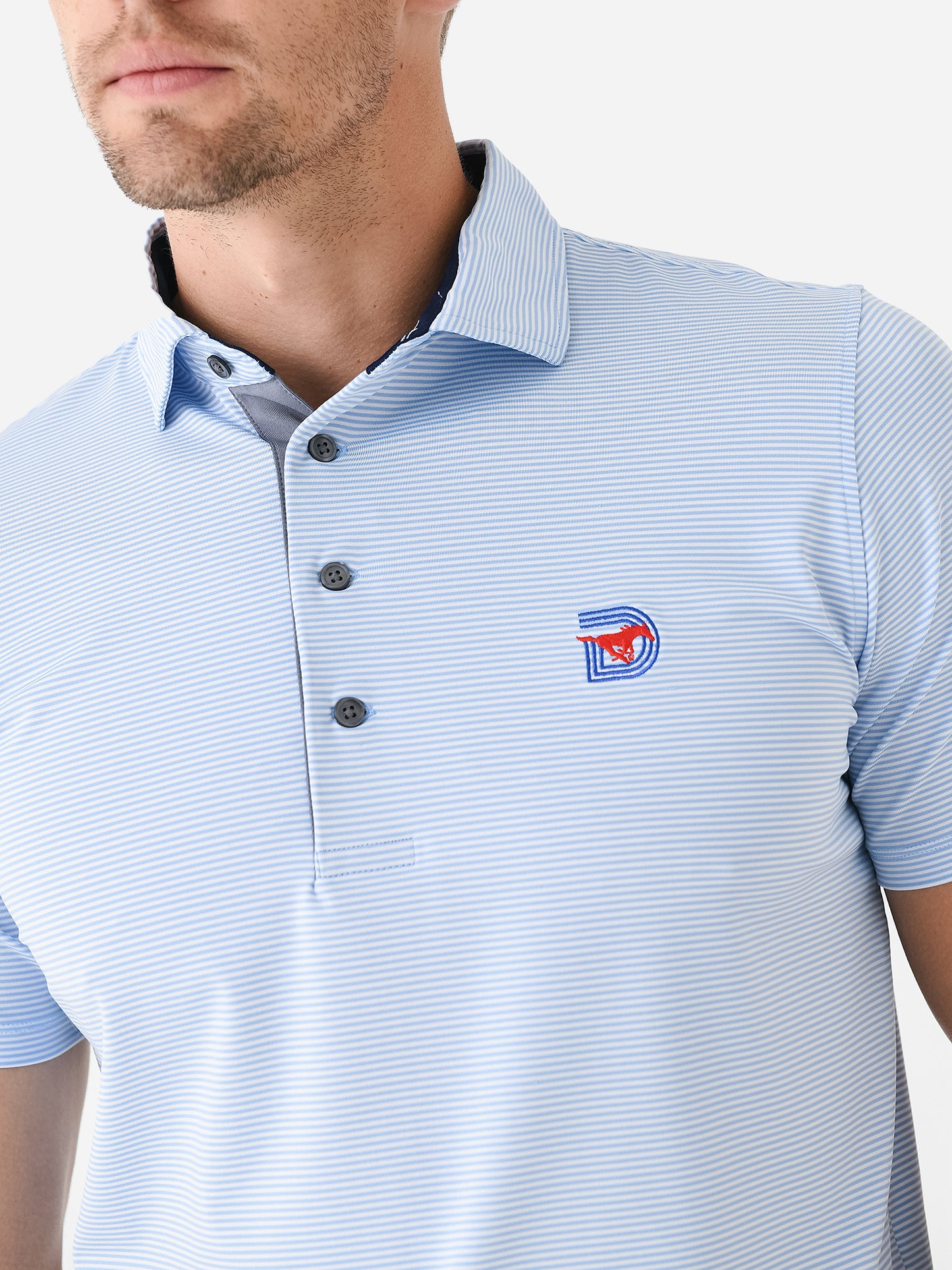 A breathable four-button performance polo featuring an embroidered SMU logo and novelty stripe print.