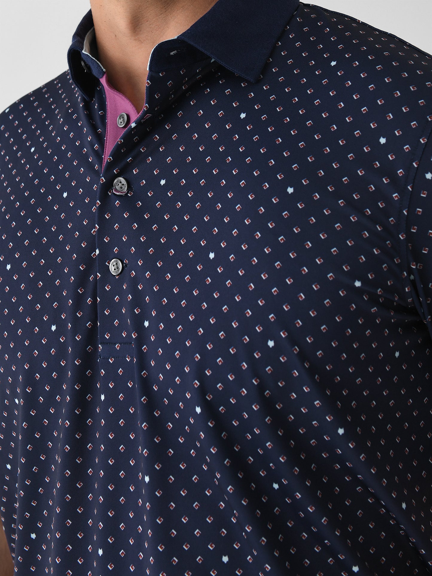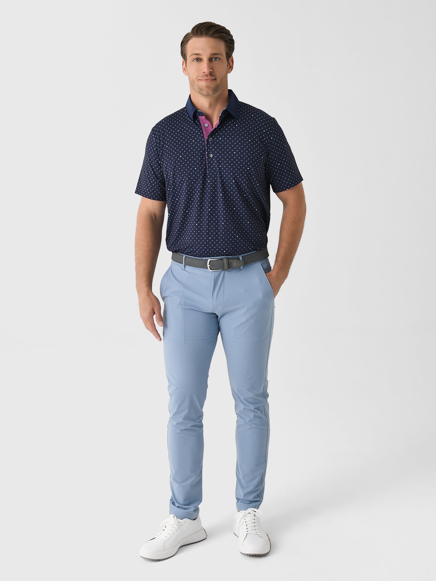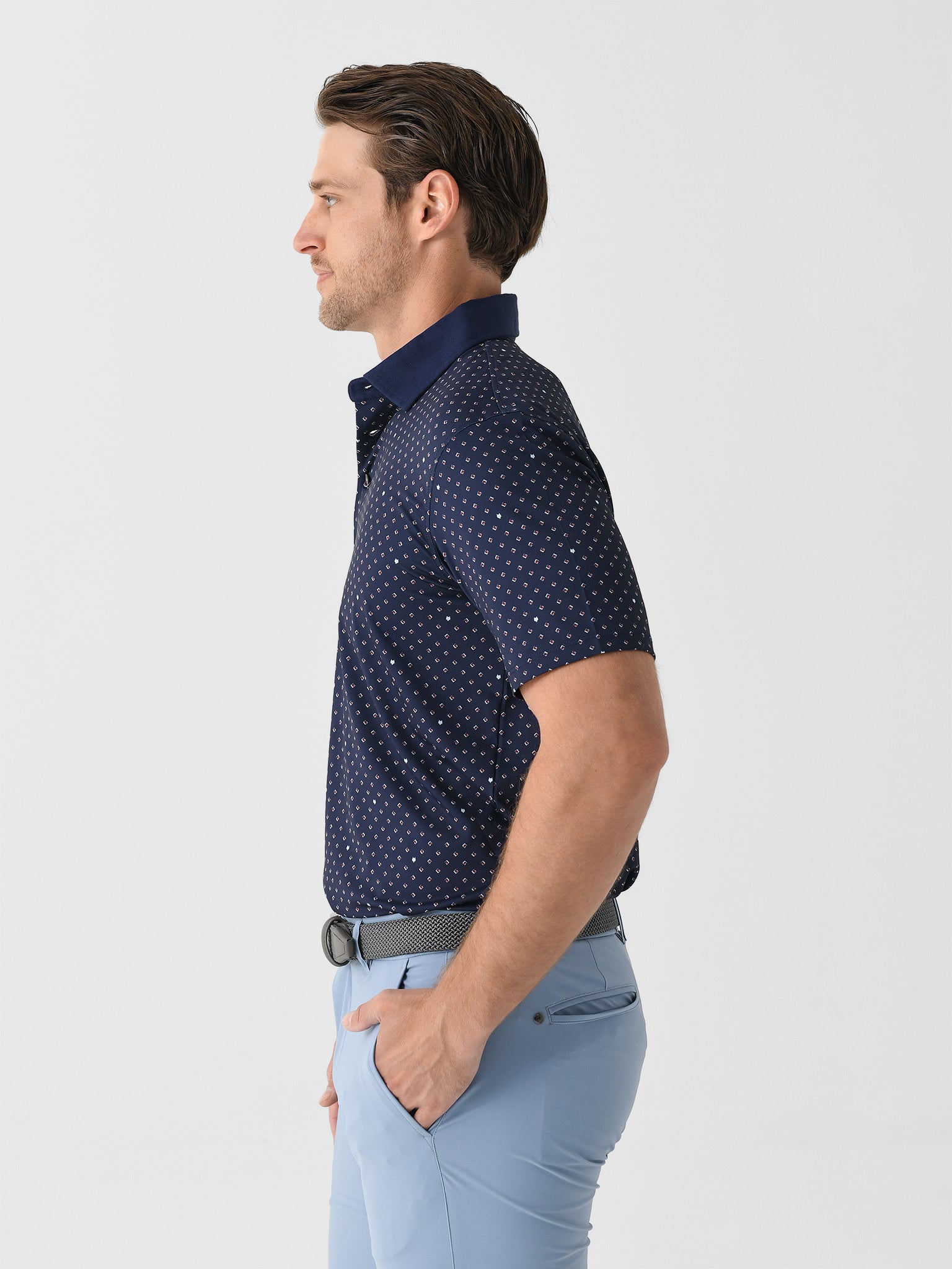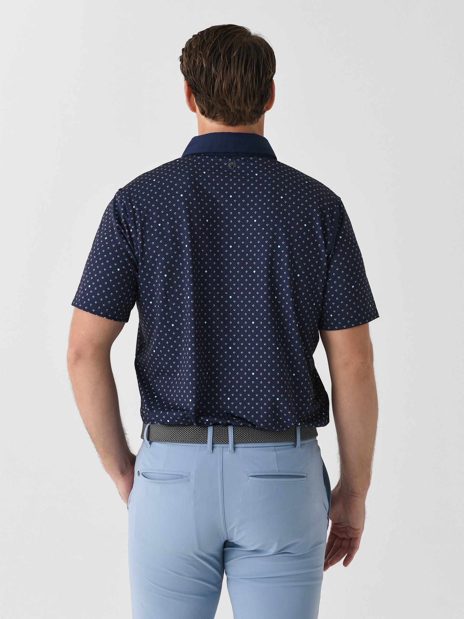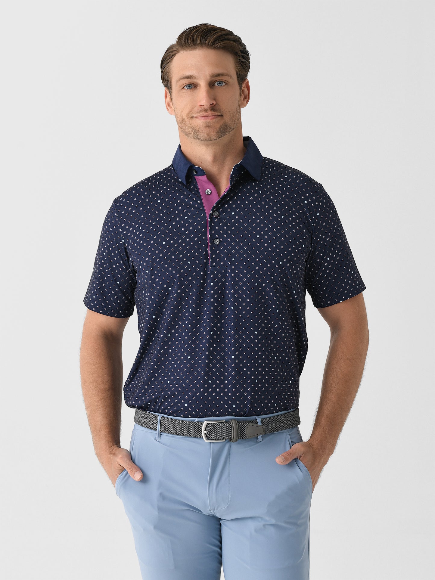 A lightweight polo made from silky performance fabric with comfortable four-way stretch and a custom Greyson print.
