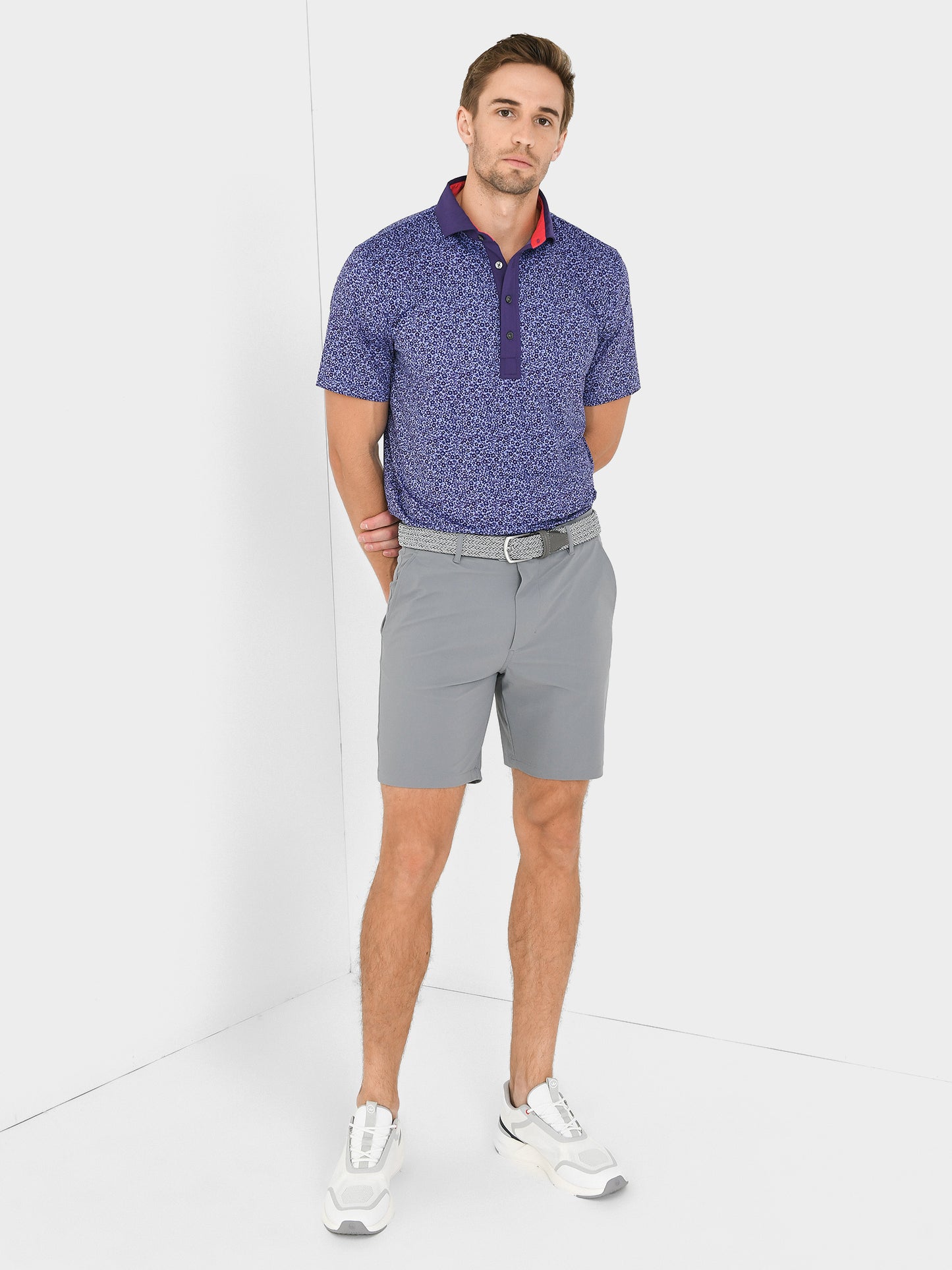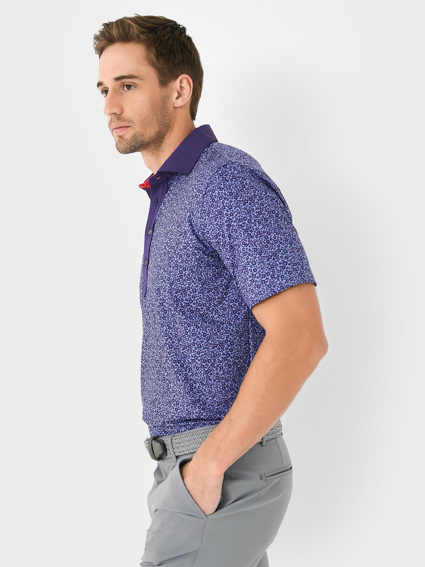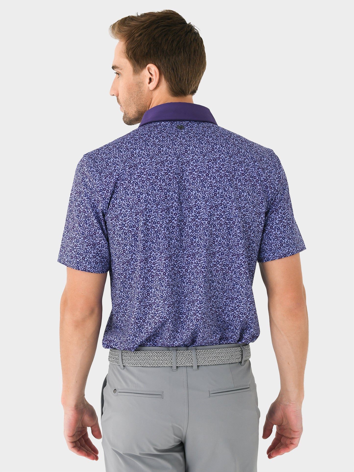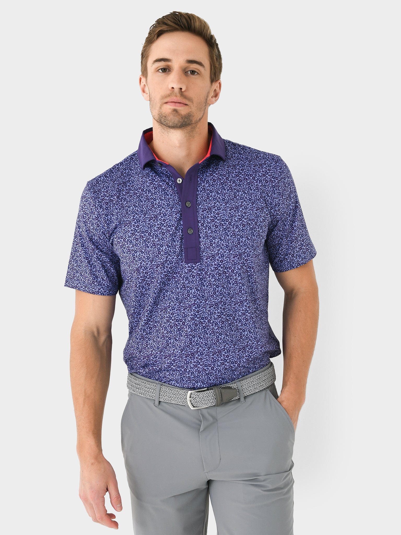 A lightweight polo made from breathable performance fabric with sun protection technology and a custom floral print.
