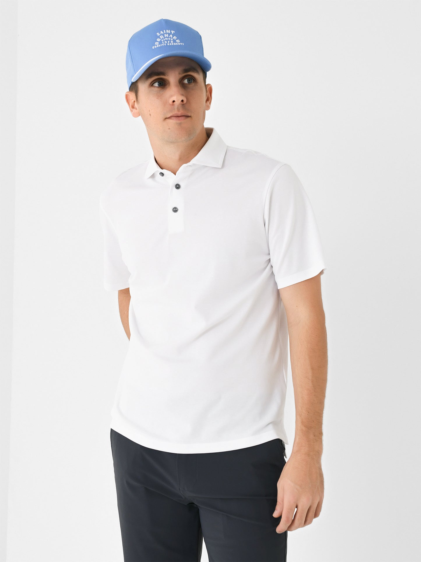 - Model is wearing size Medium polo.