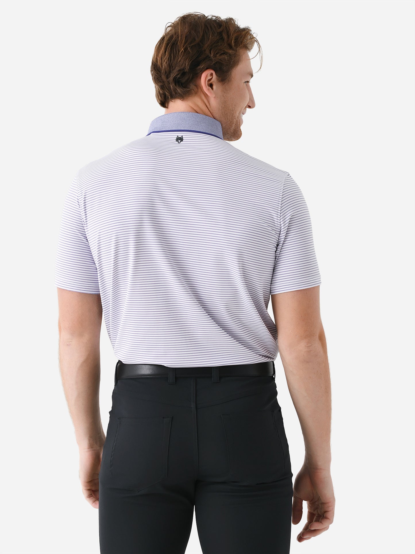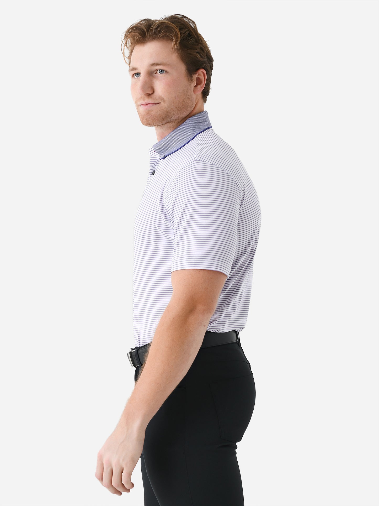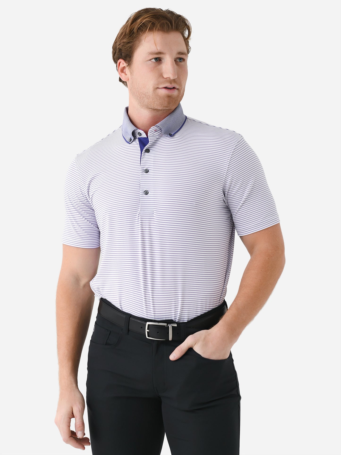 A striped performance polo made from anti-odor fabric with a contras collar and four-button placket.
