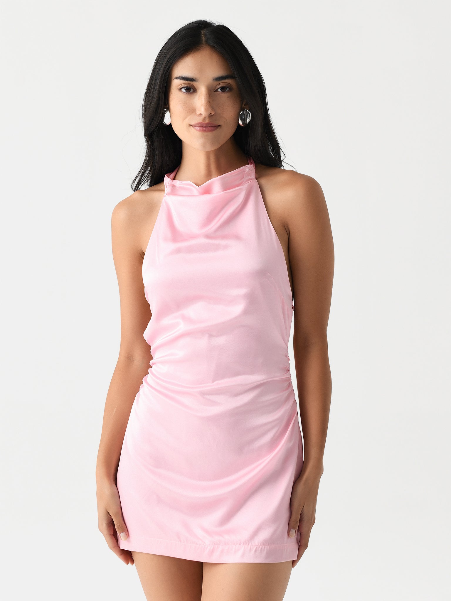 A halter neck mini dress made from stretchy satin fabric with a feminine open-back design and self-tie detail.