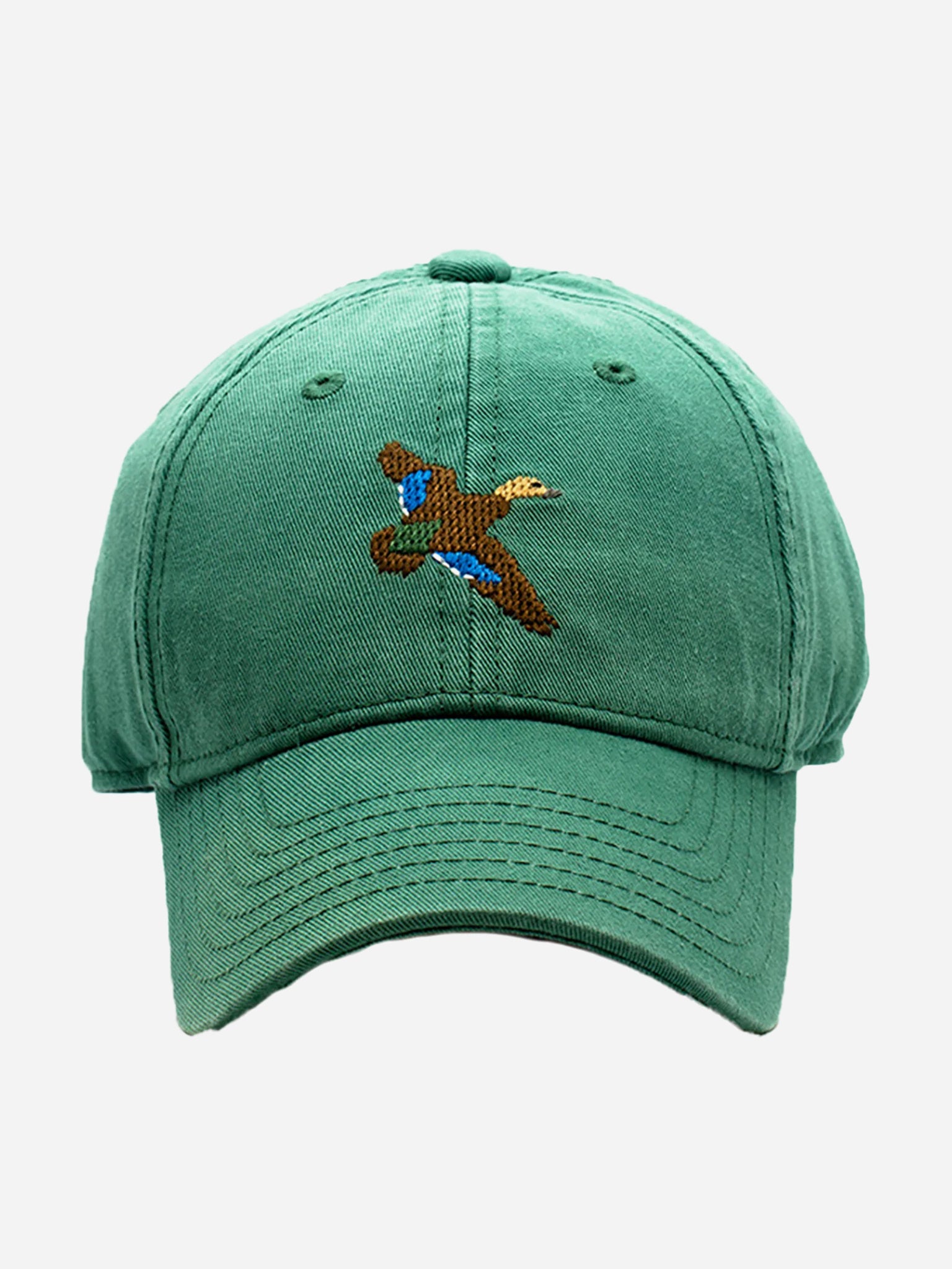 Pre-washed canvas hat with an embroidered needlepoint duck motif.