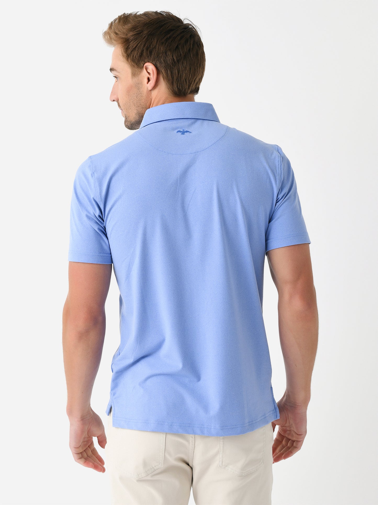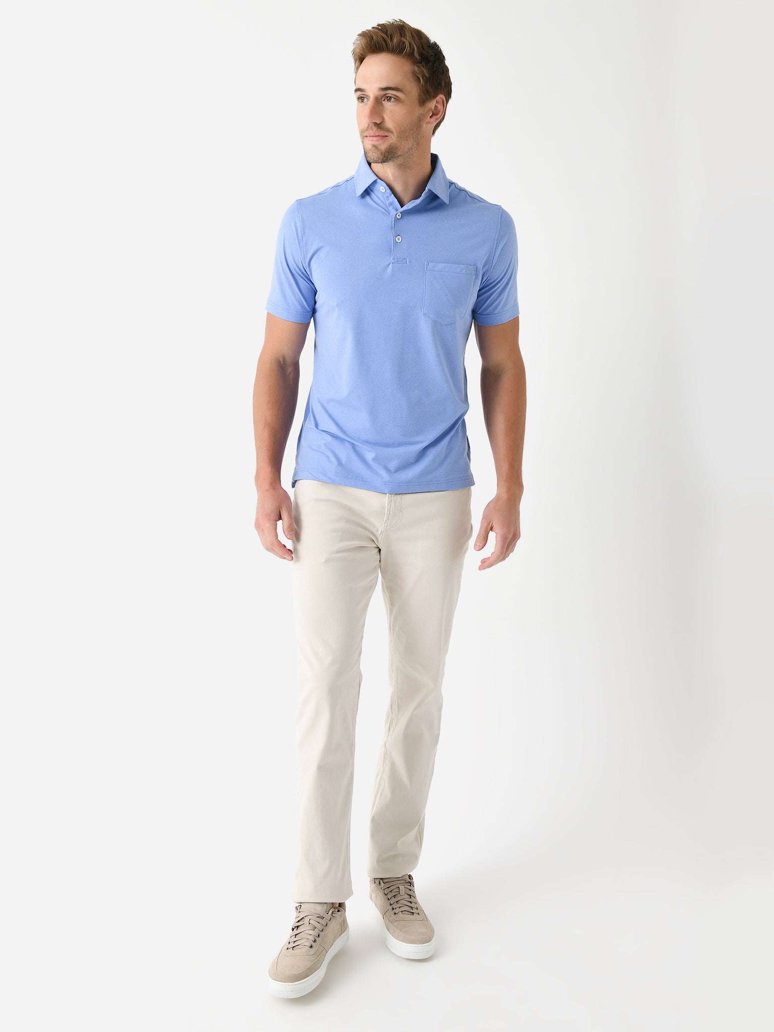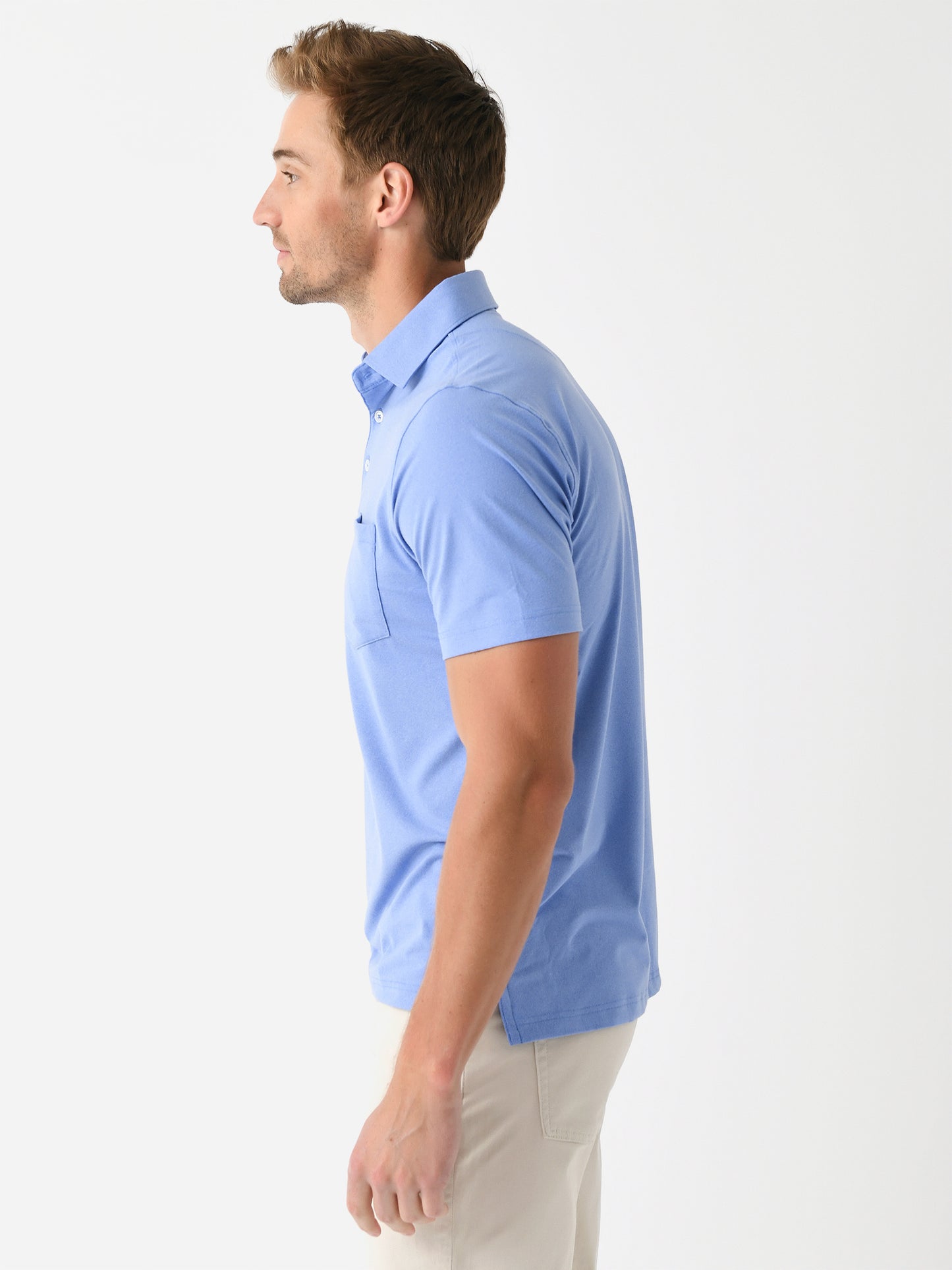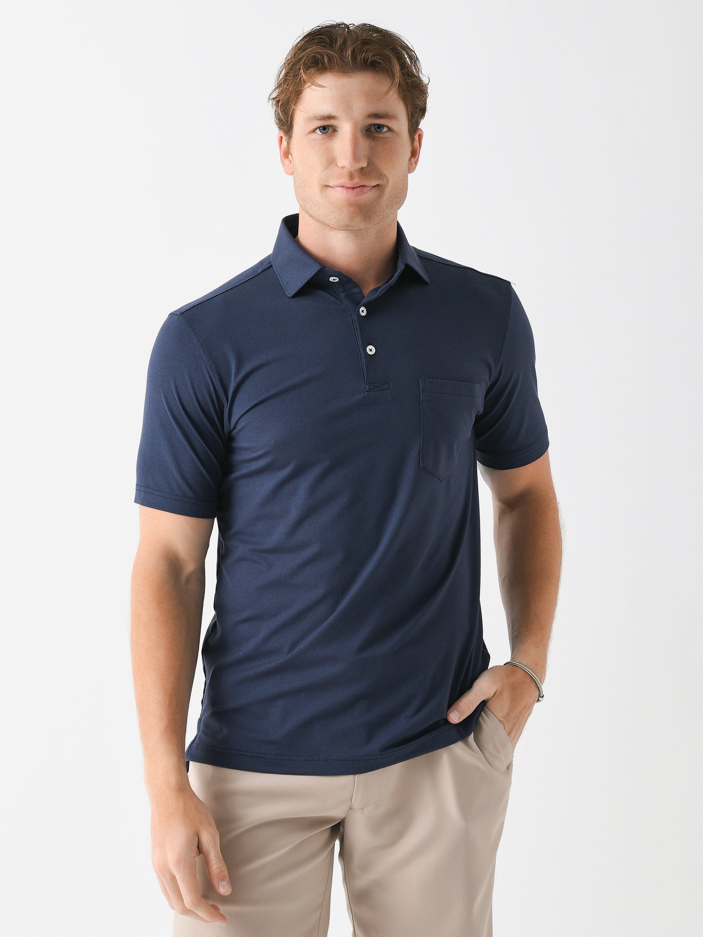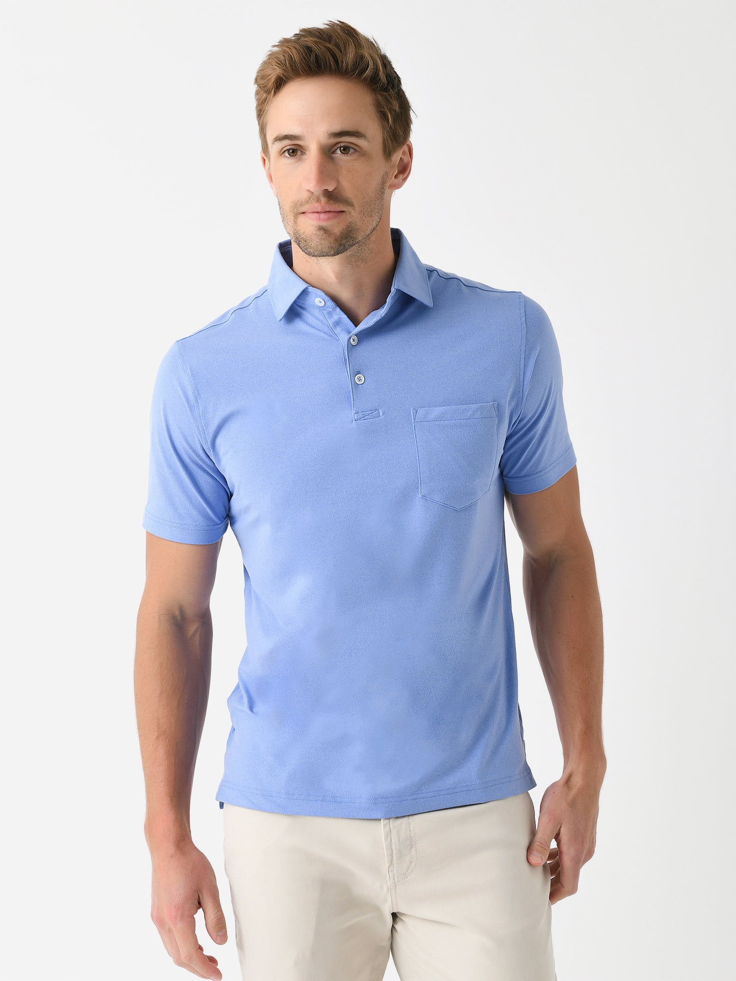 A breathable performance polo with a structured collar and three-button placket with a chest pocket.