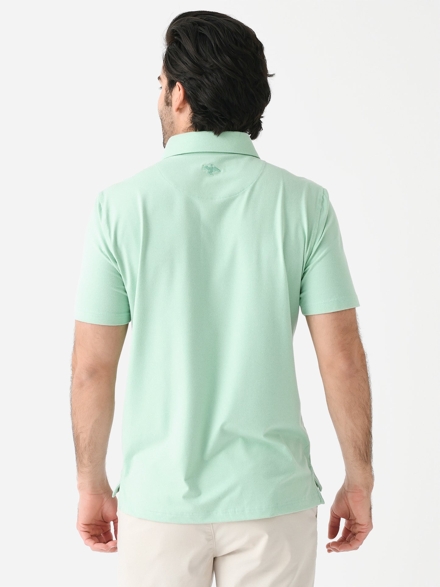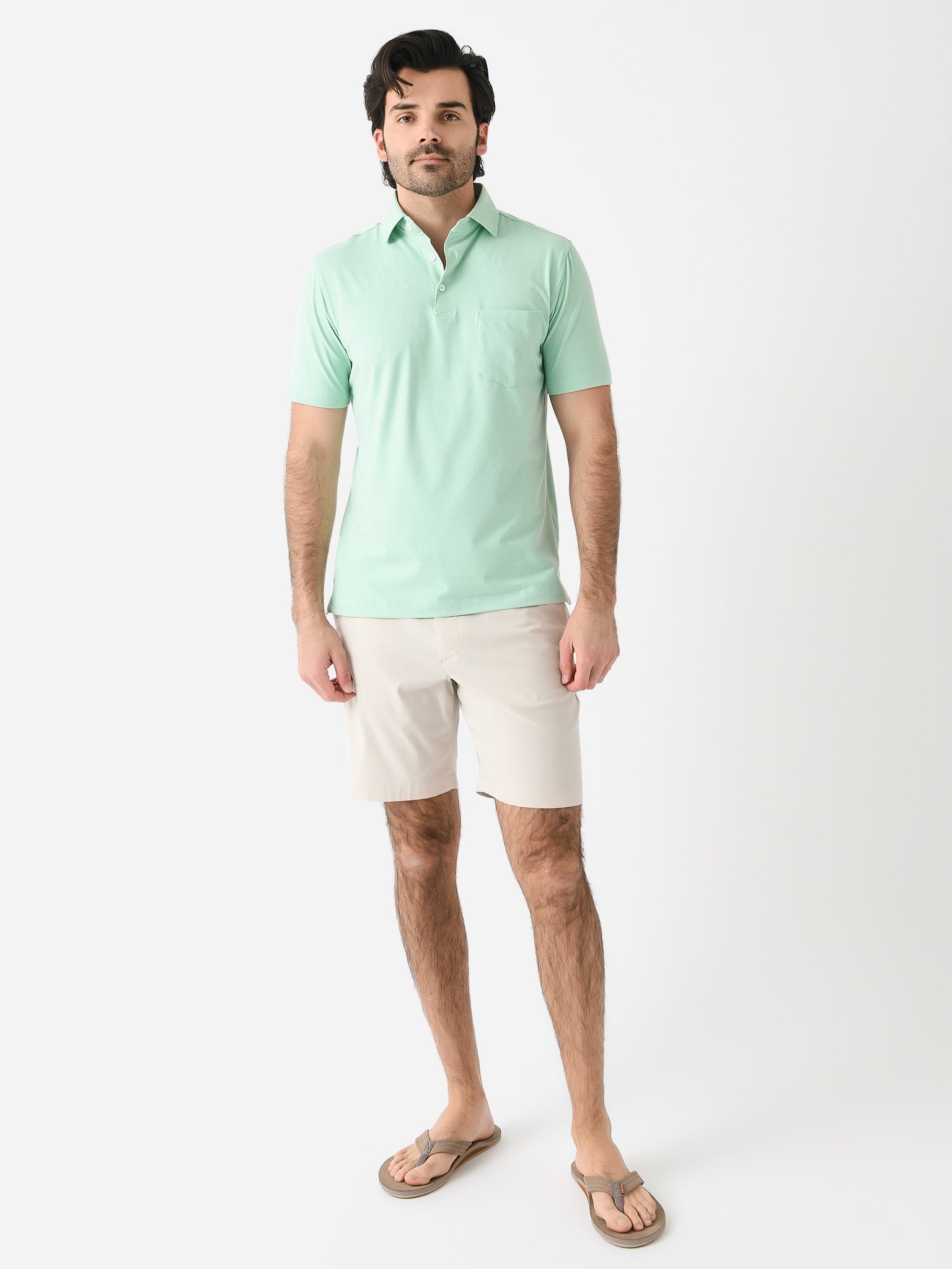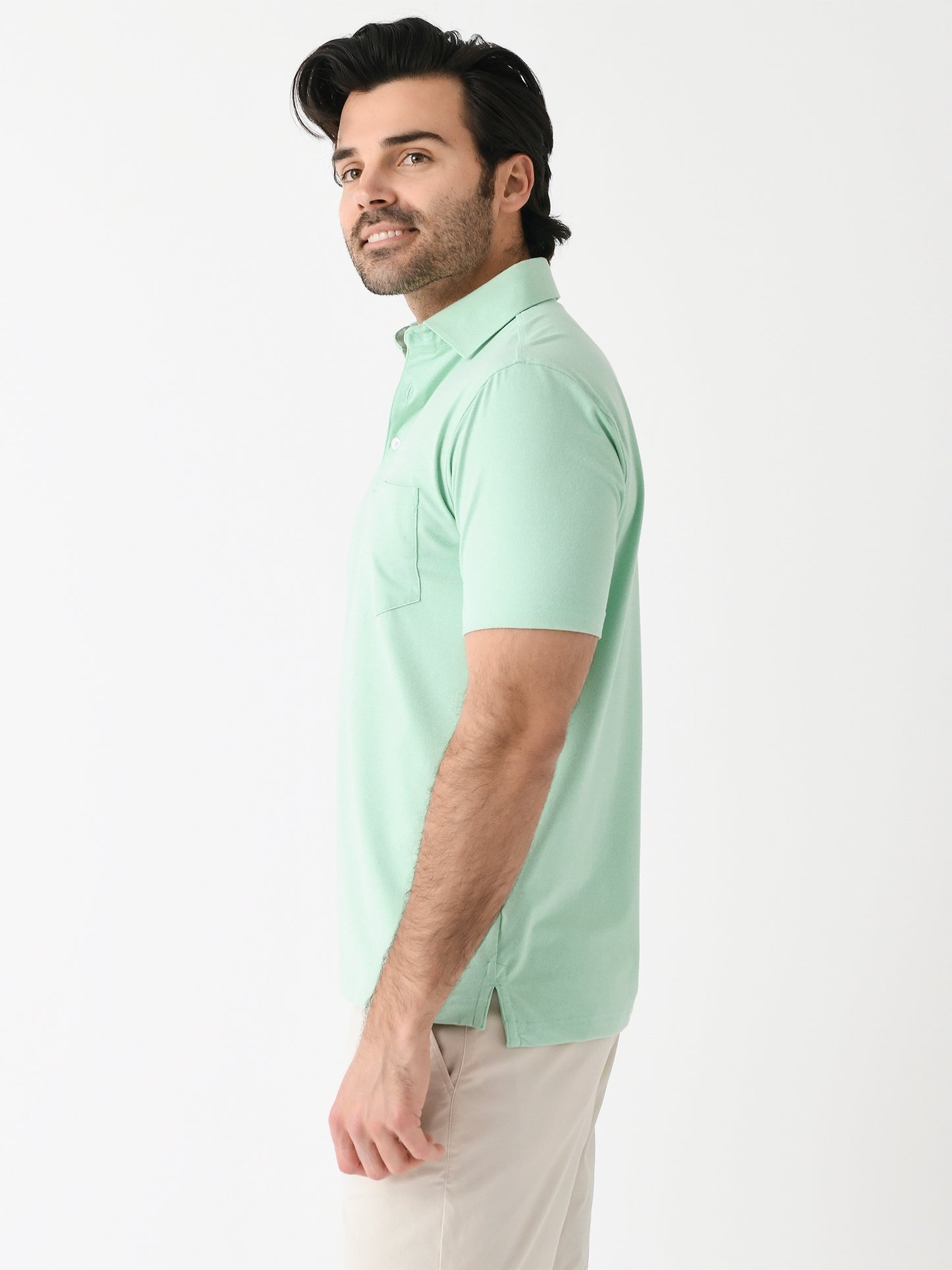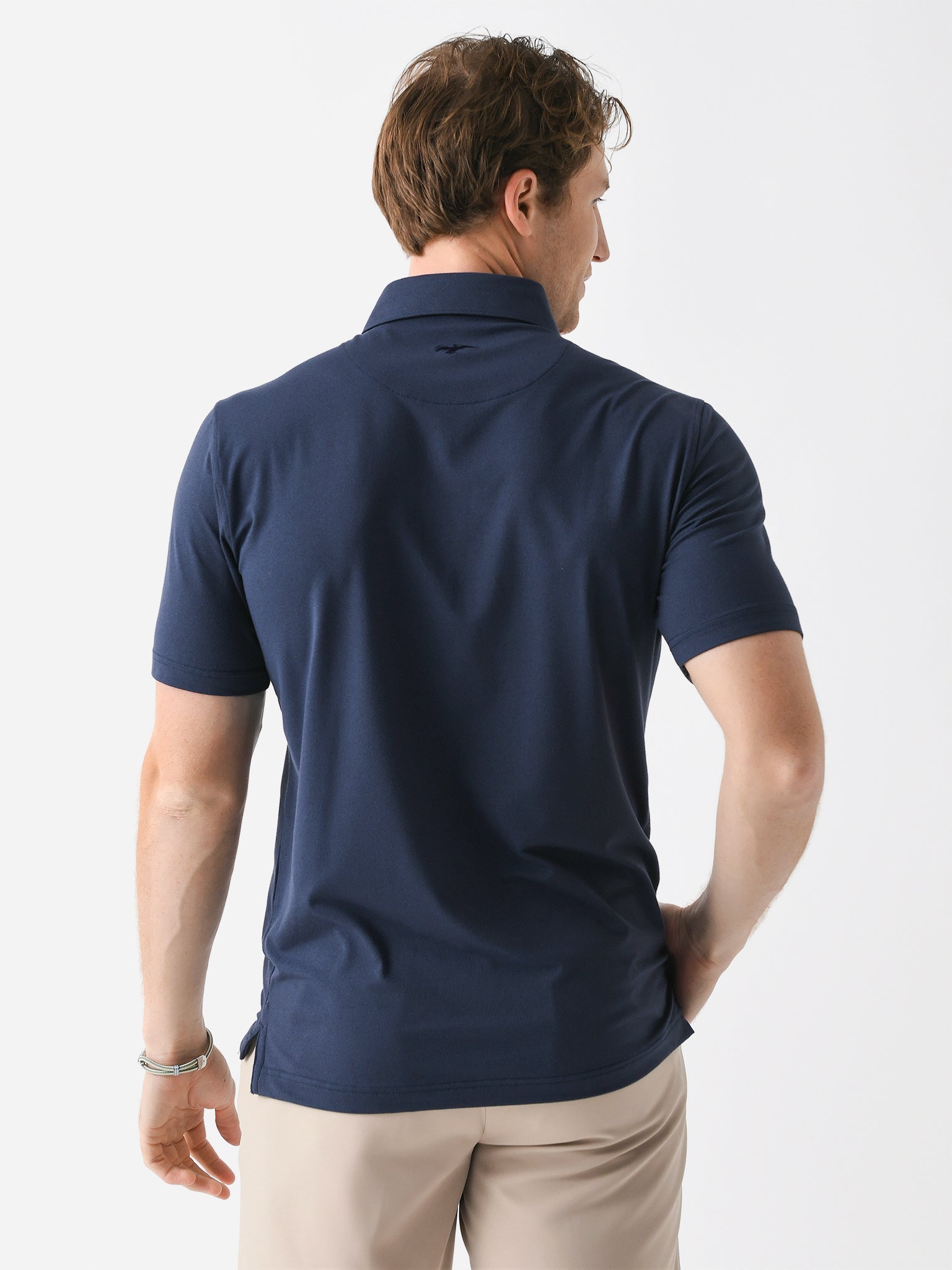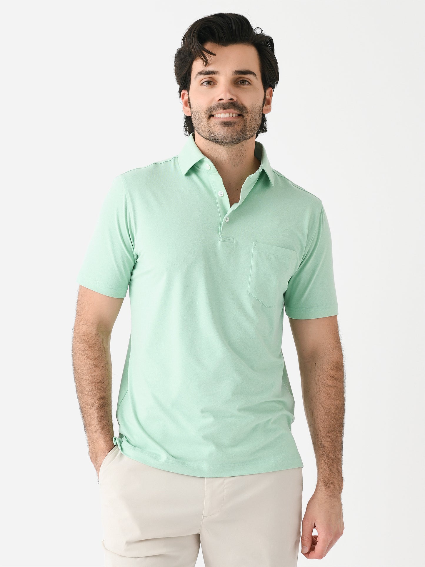 A breathable performance polo with a structured collar and three-button placket with a chest pocket.