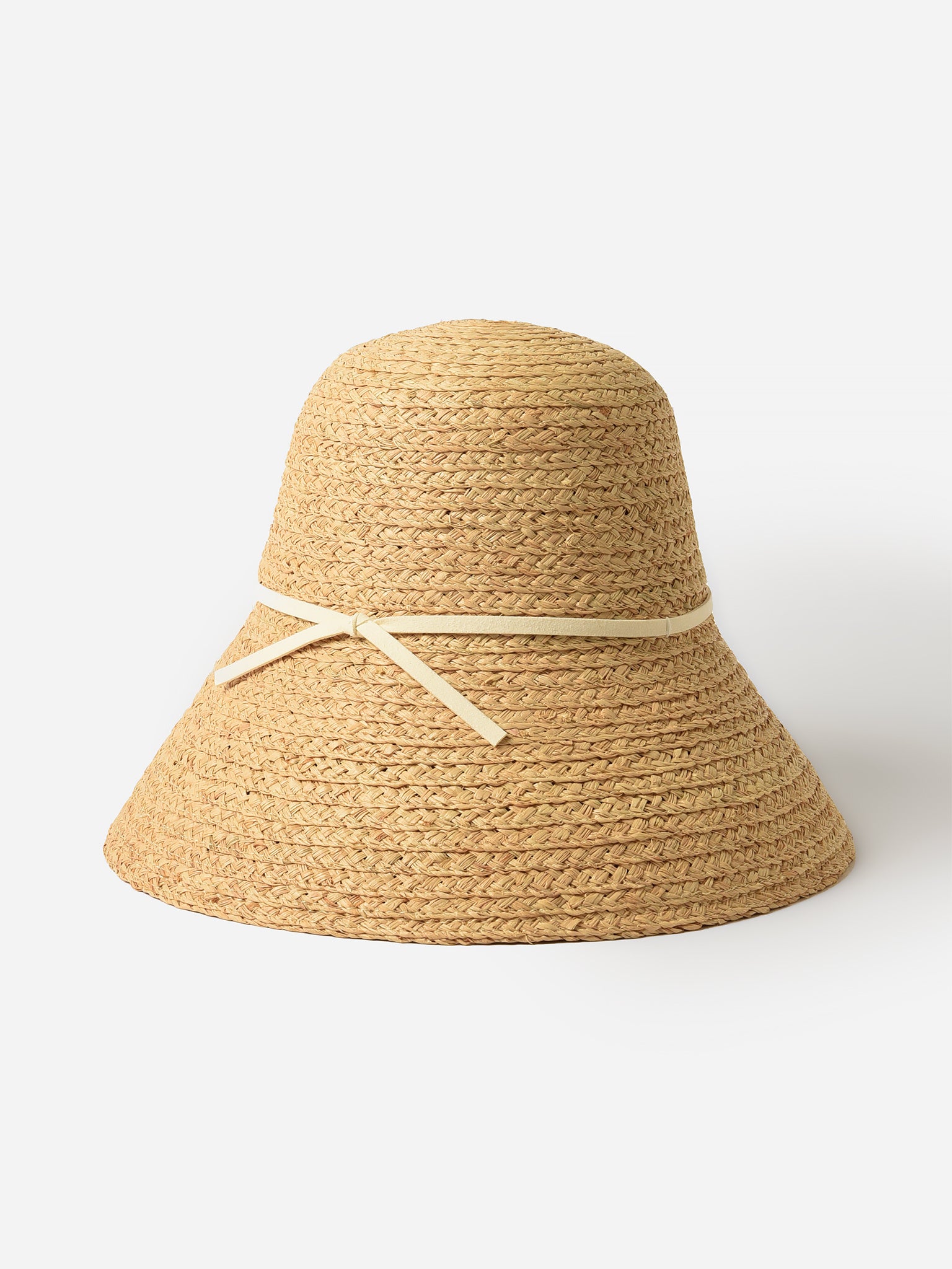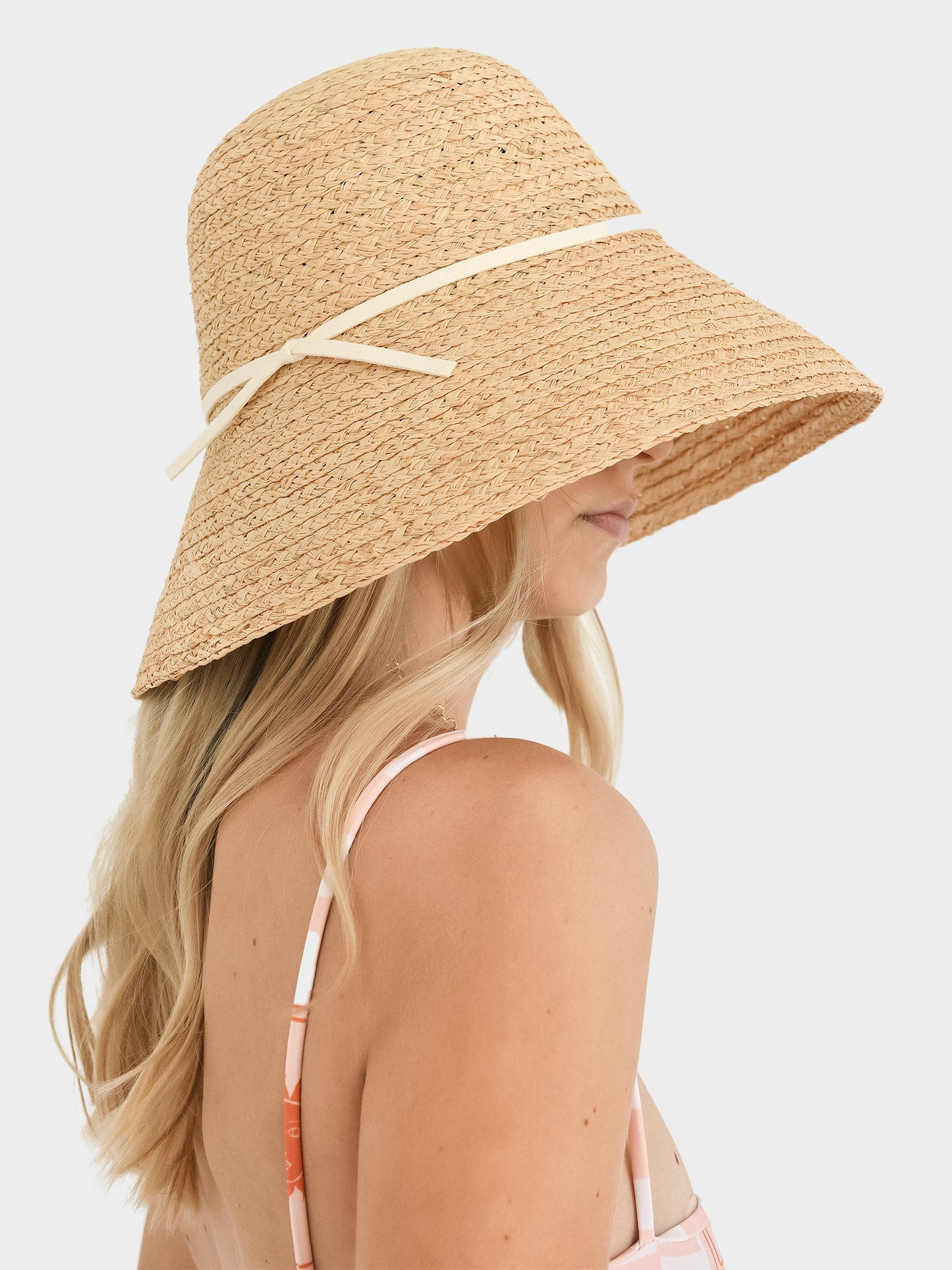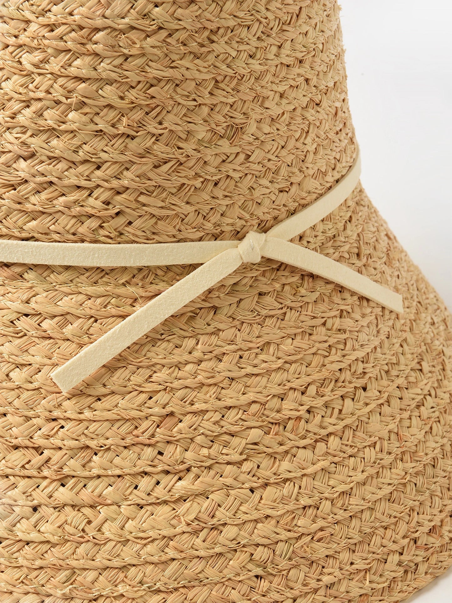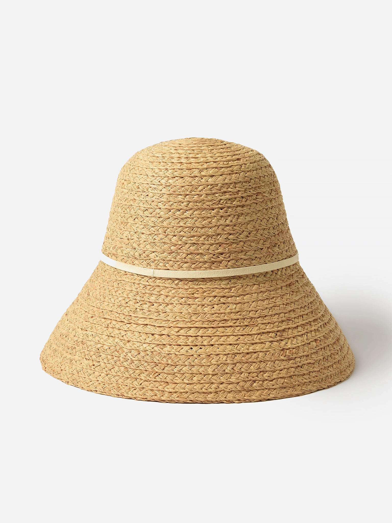 A rounded bucket hat made from woven raffia with a contrast band.