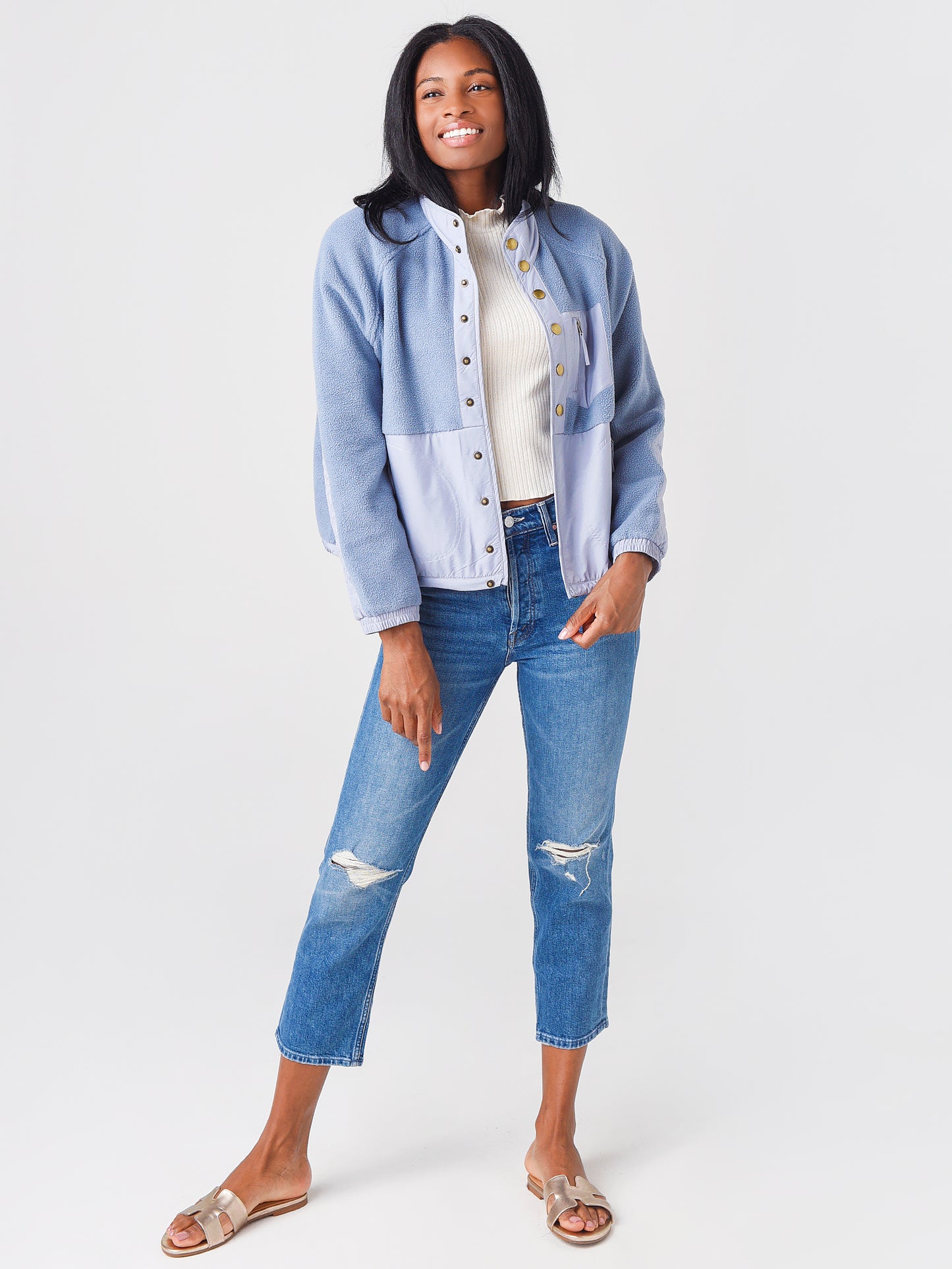 - Model is wearing size Small jacket.