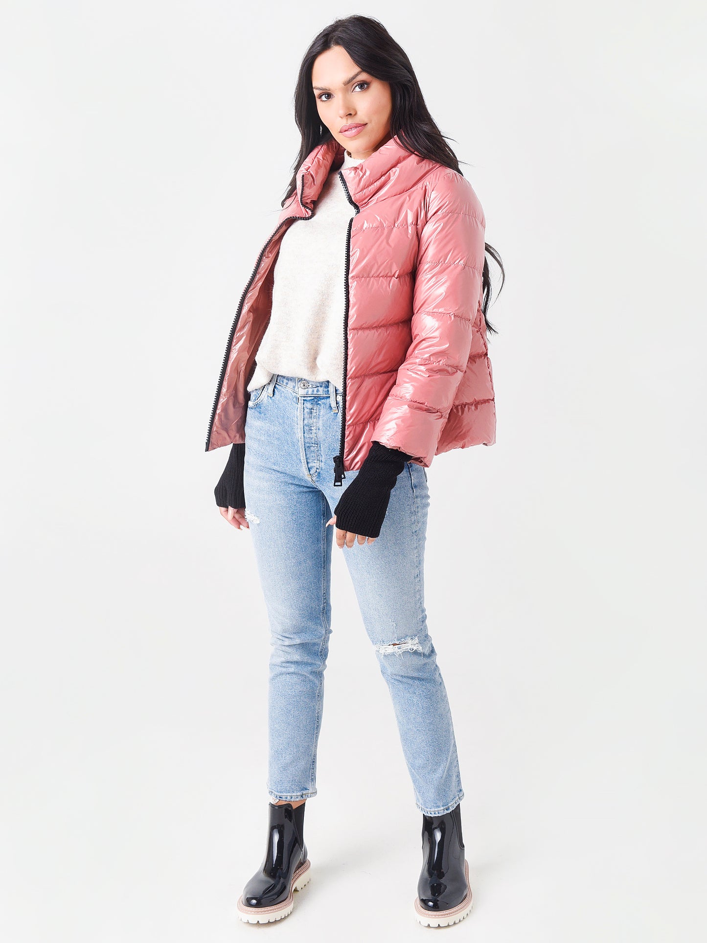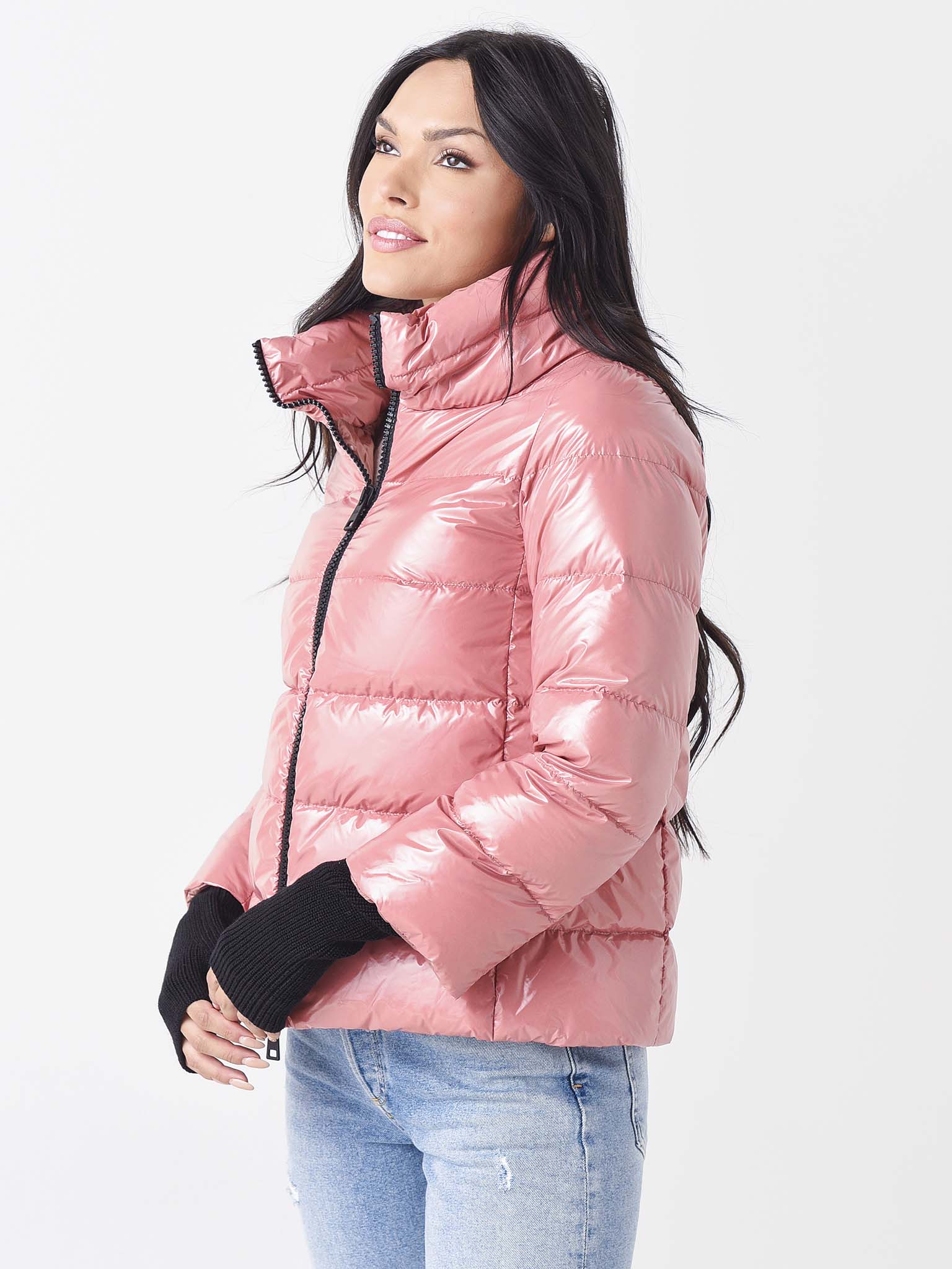 Quilted, down-injected jacket with a water-resistant lacquer-style finish.