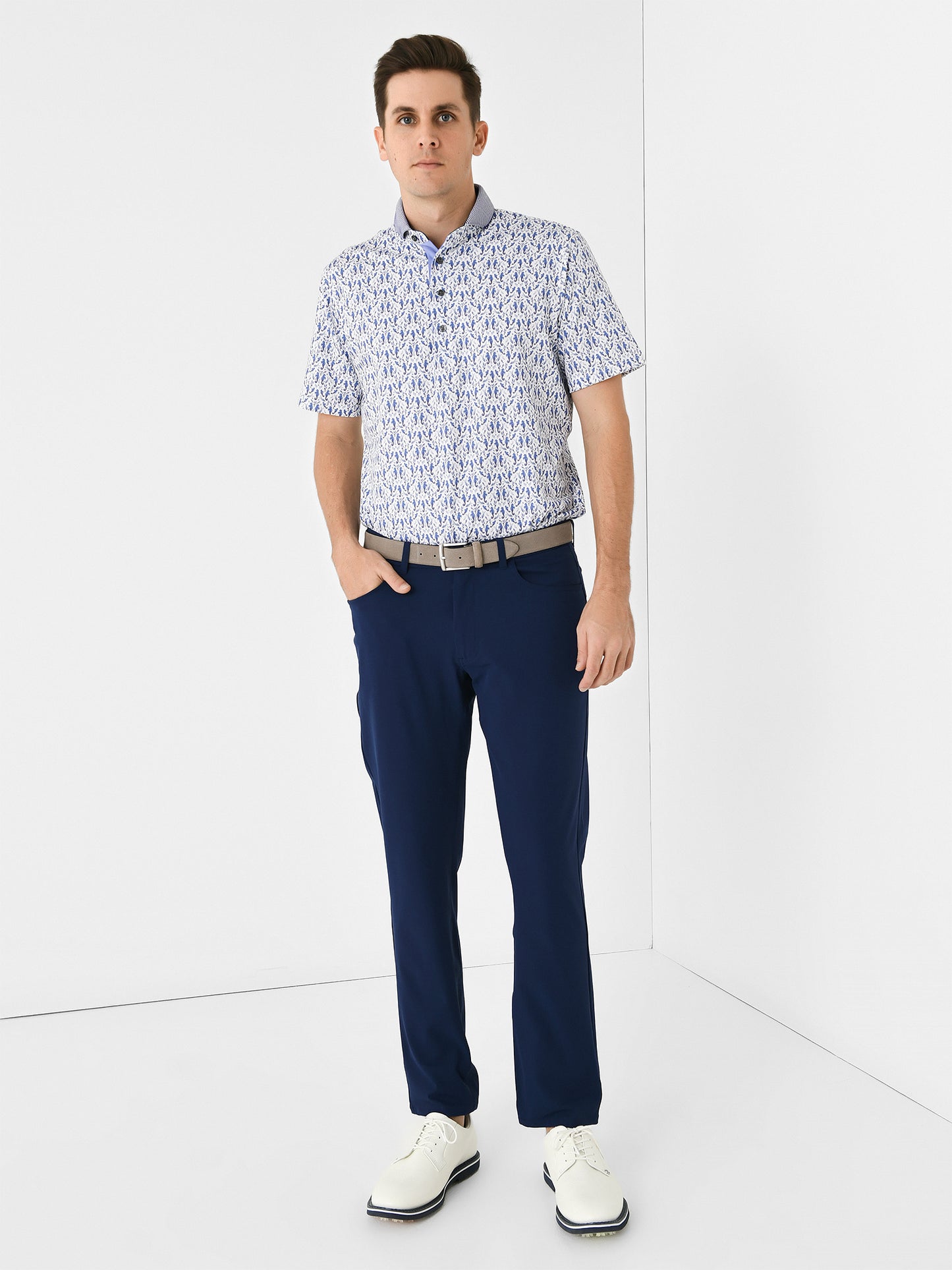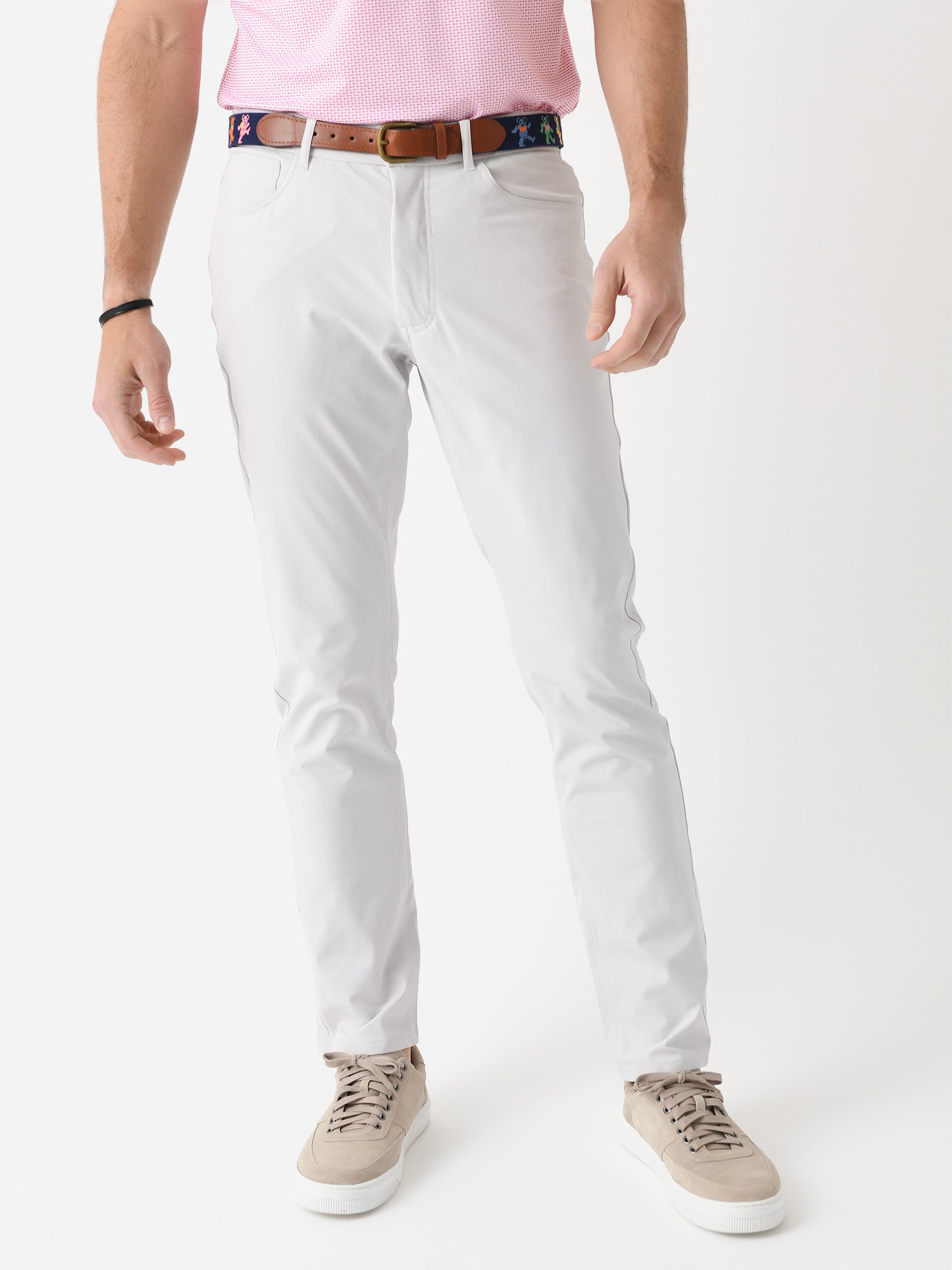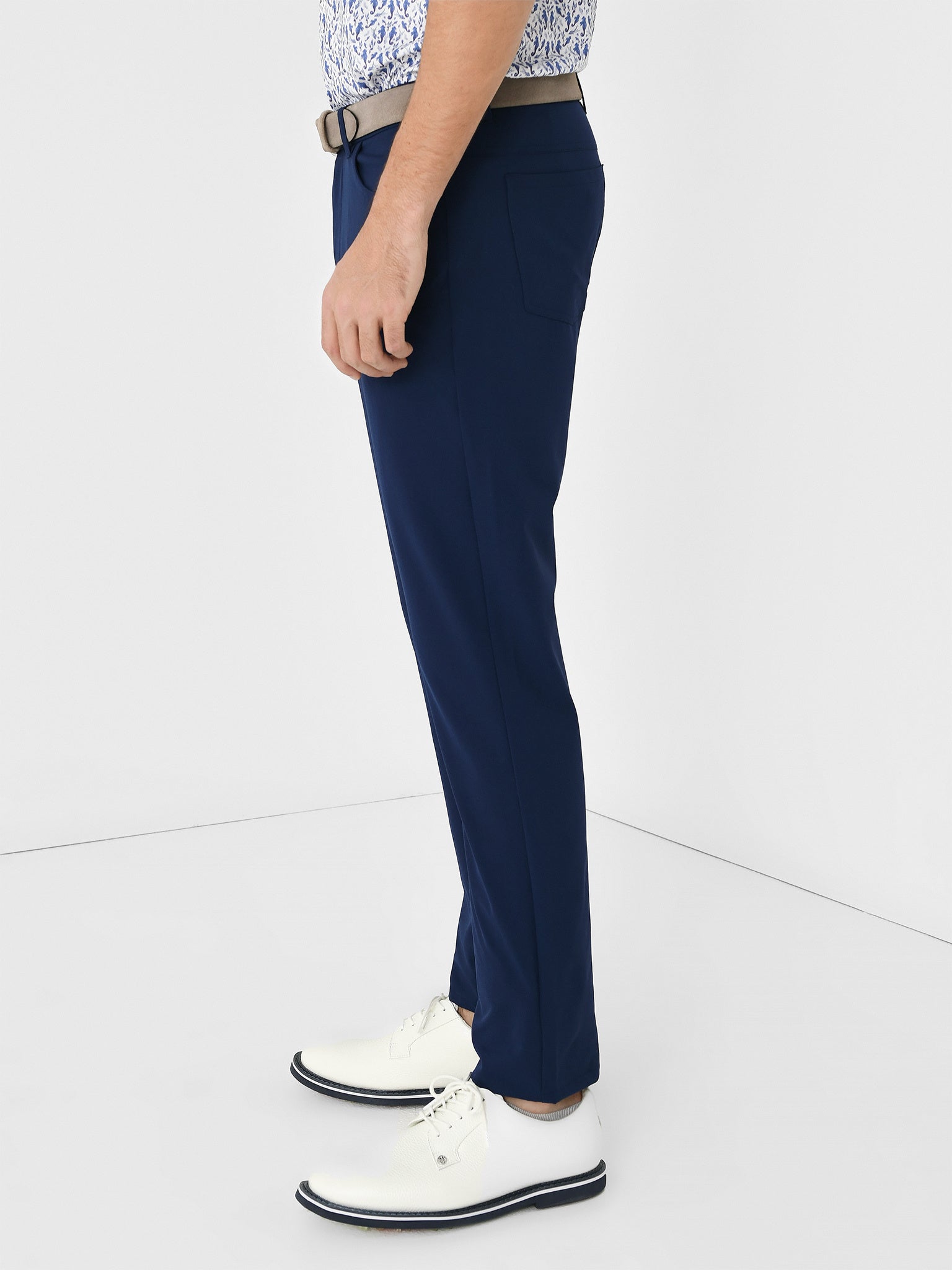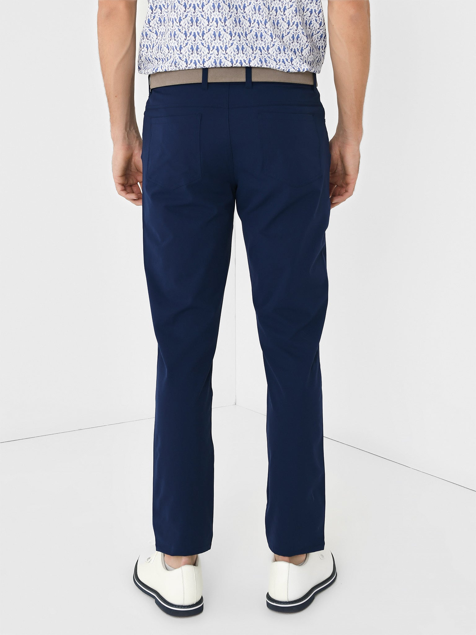 A moisture-wicking pant made from a breathable woven performance fabric with a modern five-pocket design.