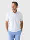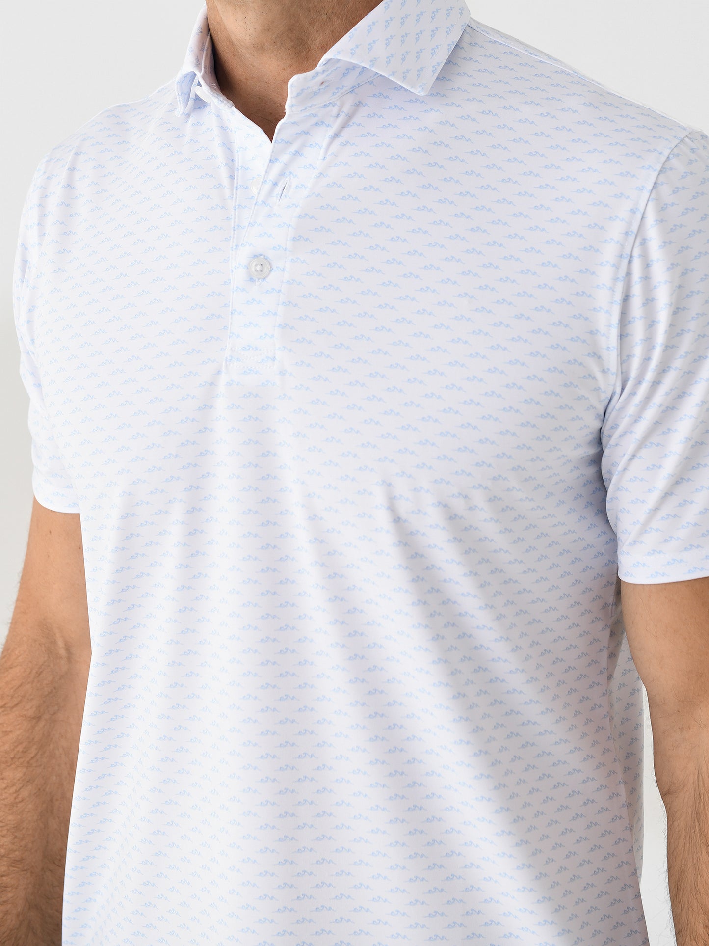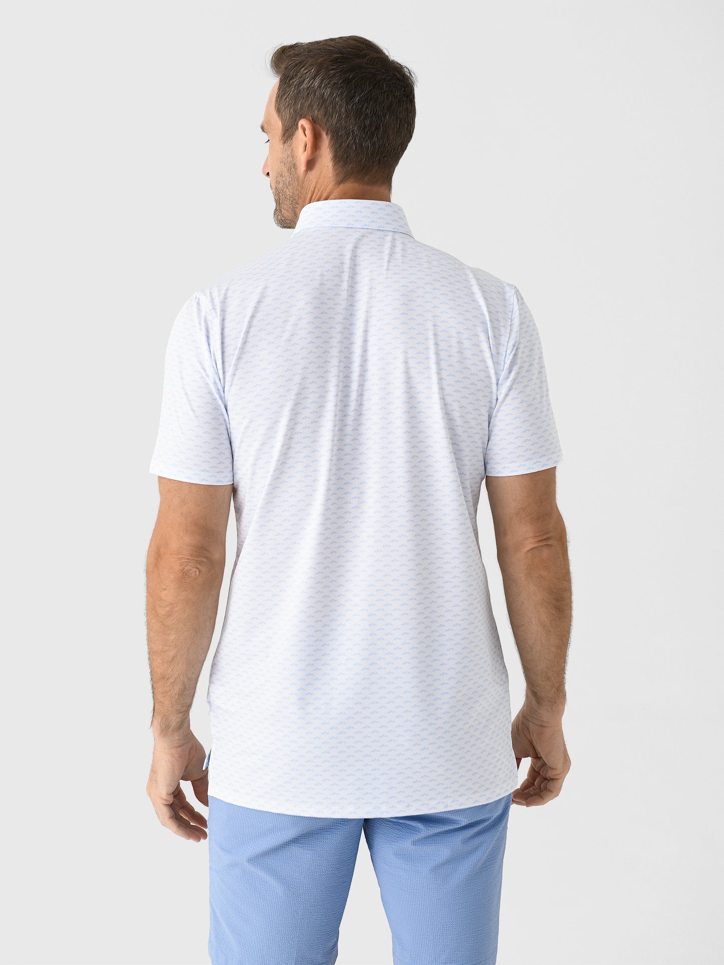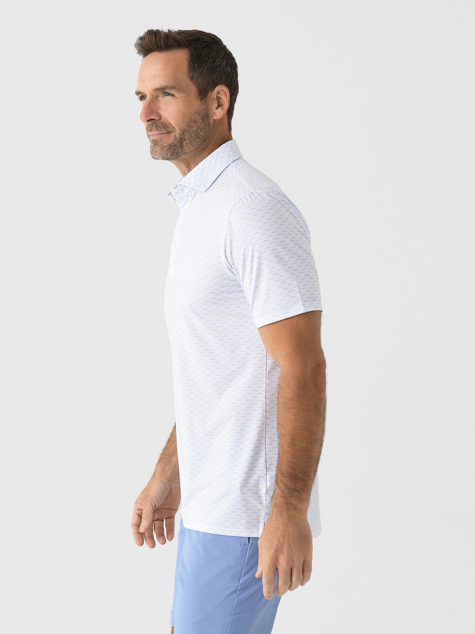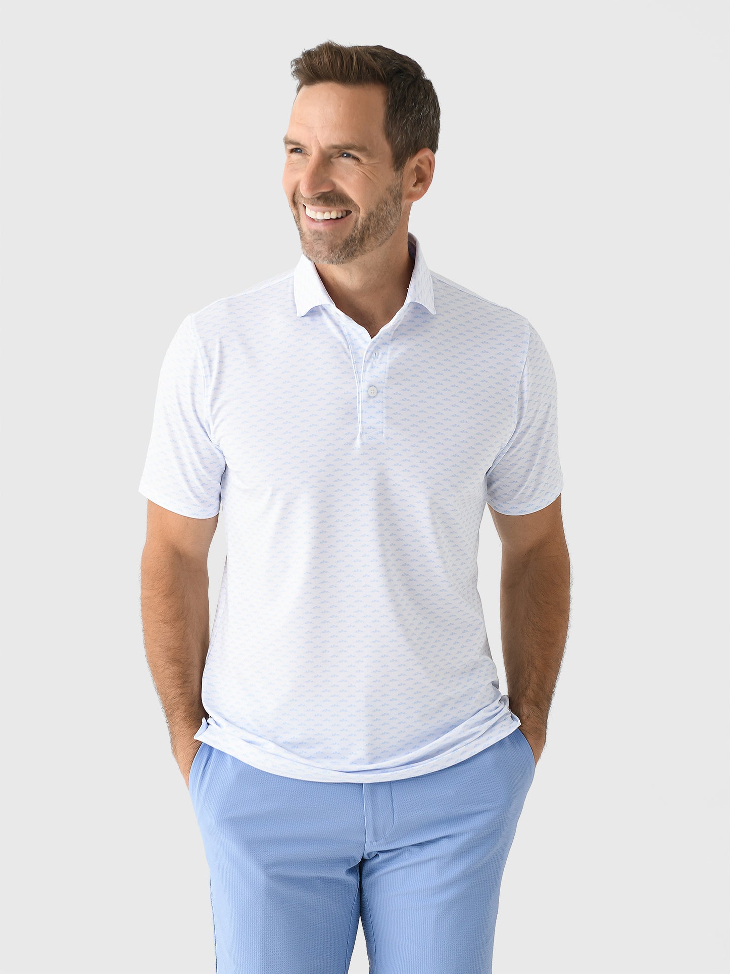A stylish and comfortable polo crafted from luxurious performance fabric featuring a wave print.