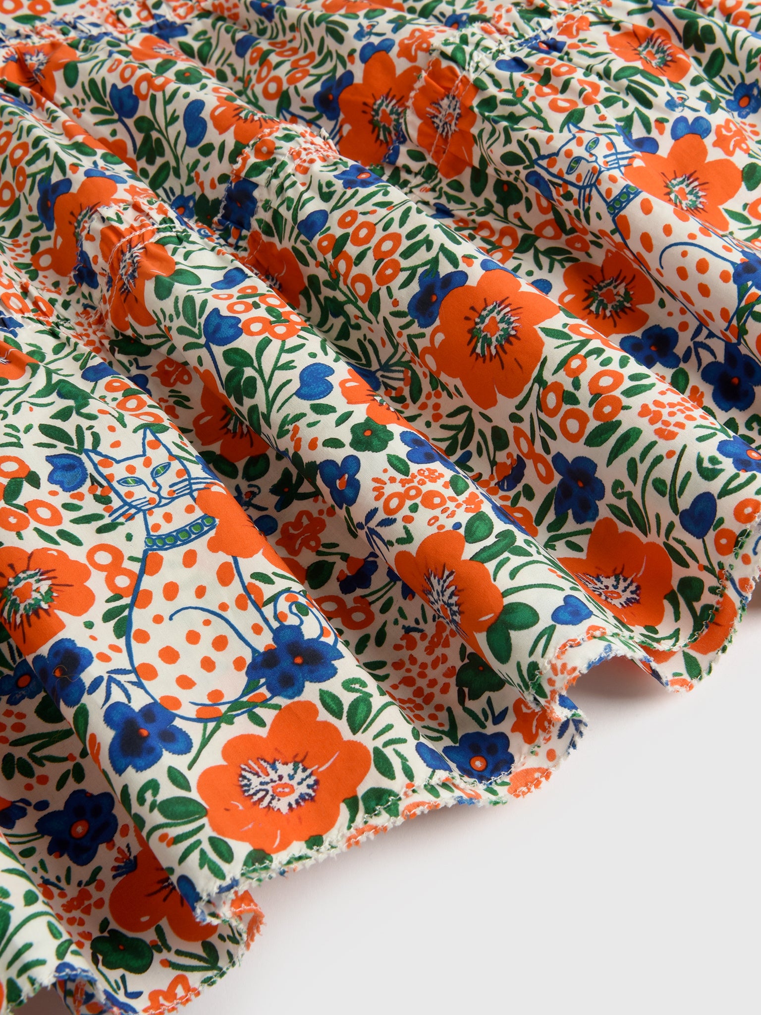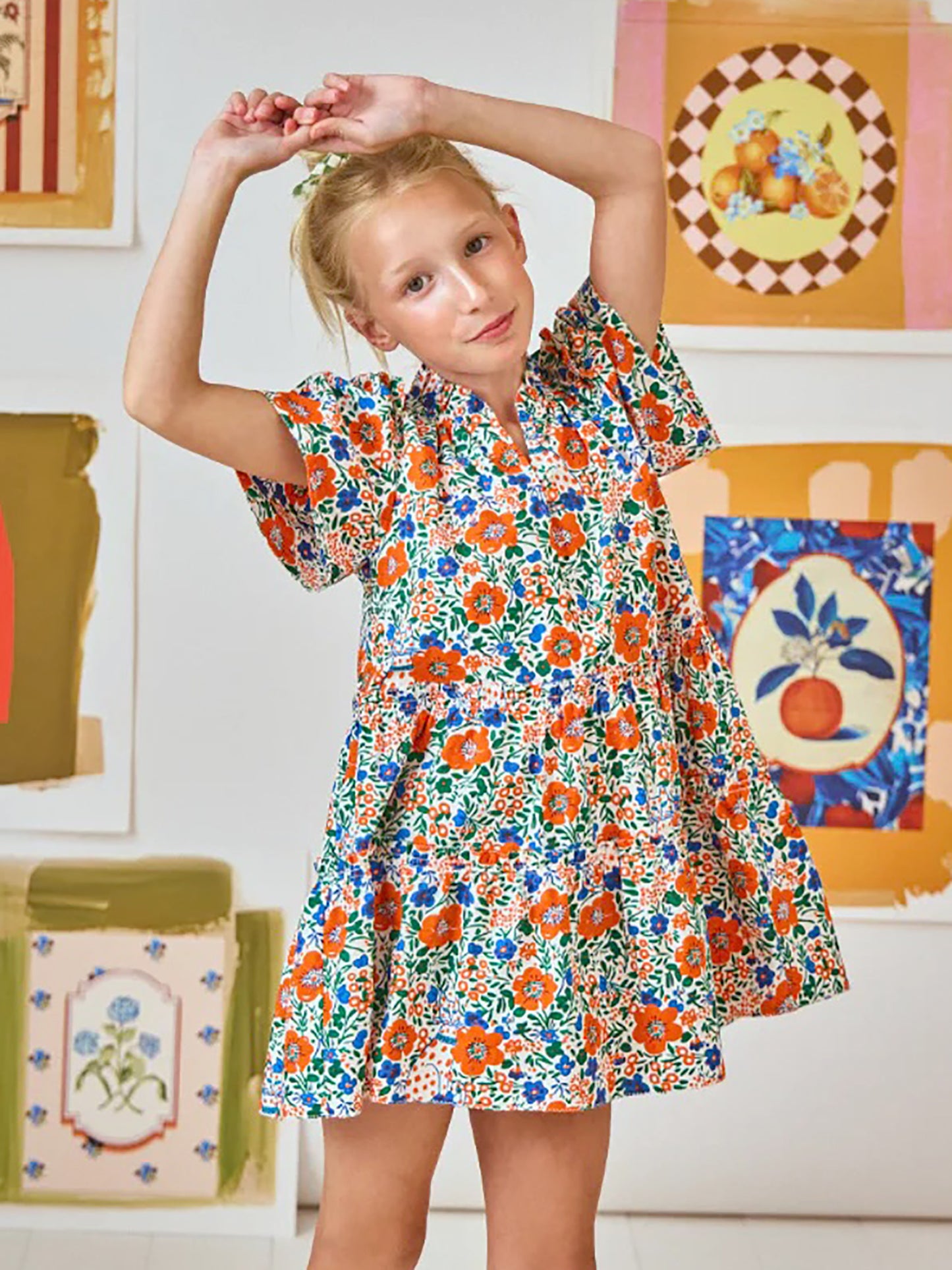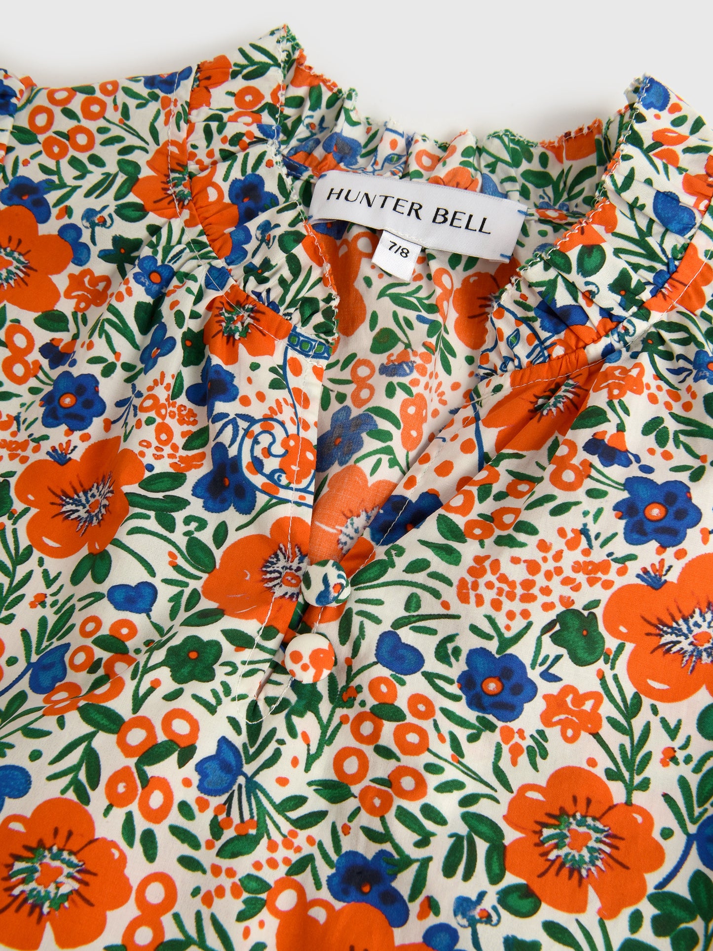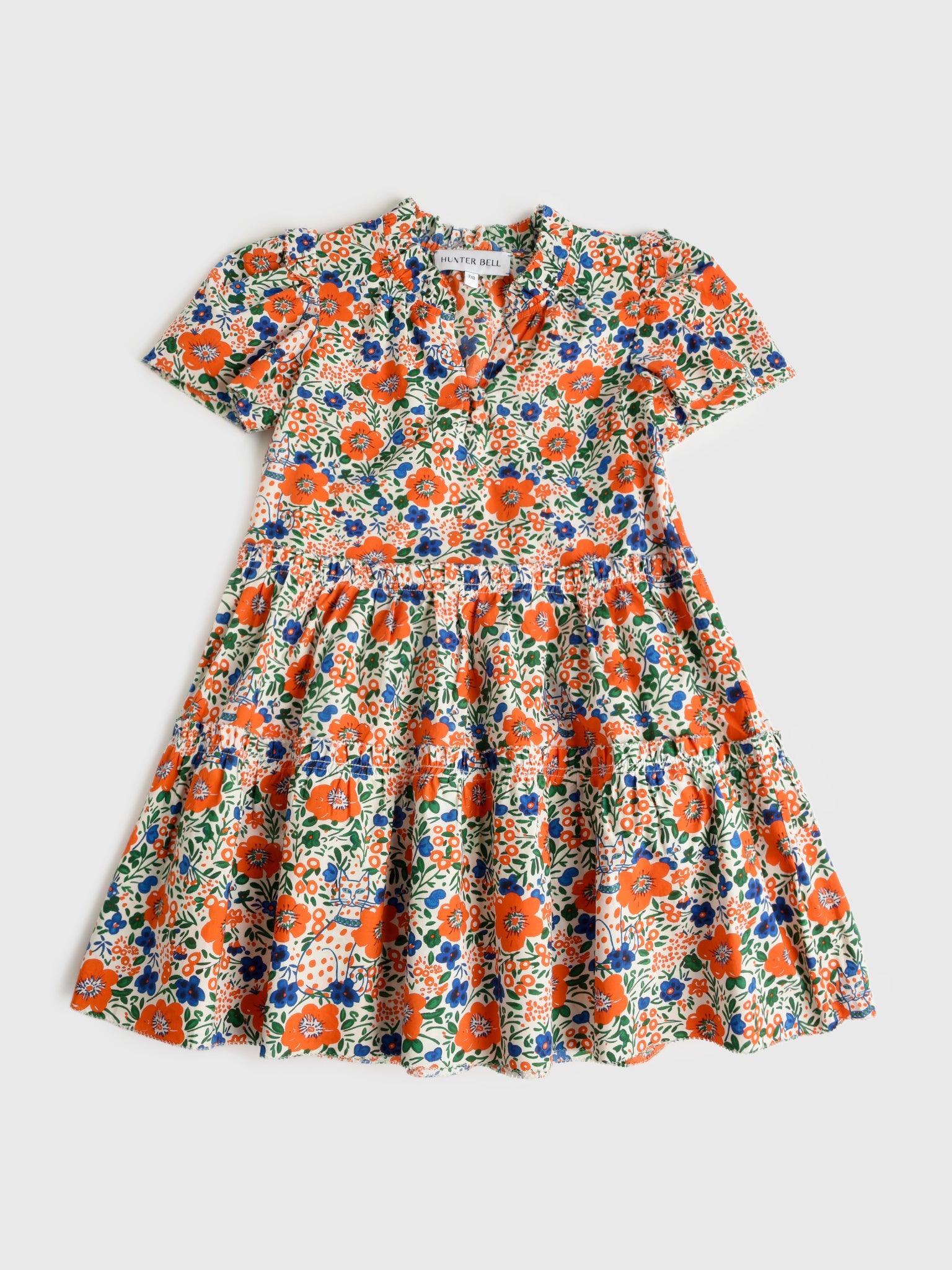 This lightweight dress features ruffle details and a blue and orange floral print.