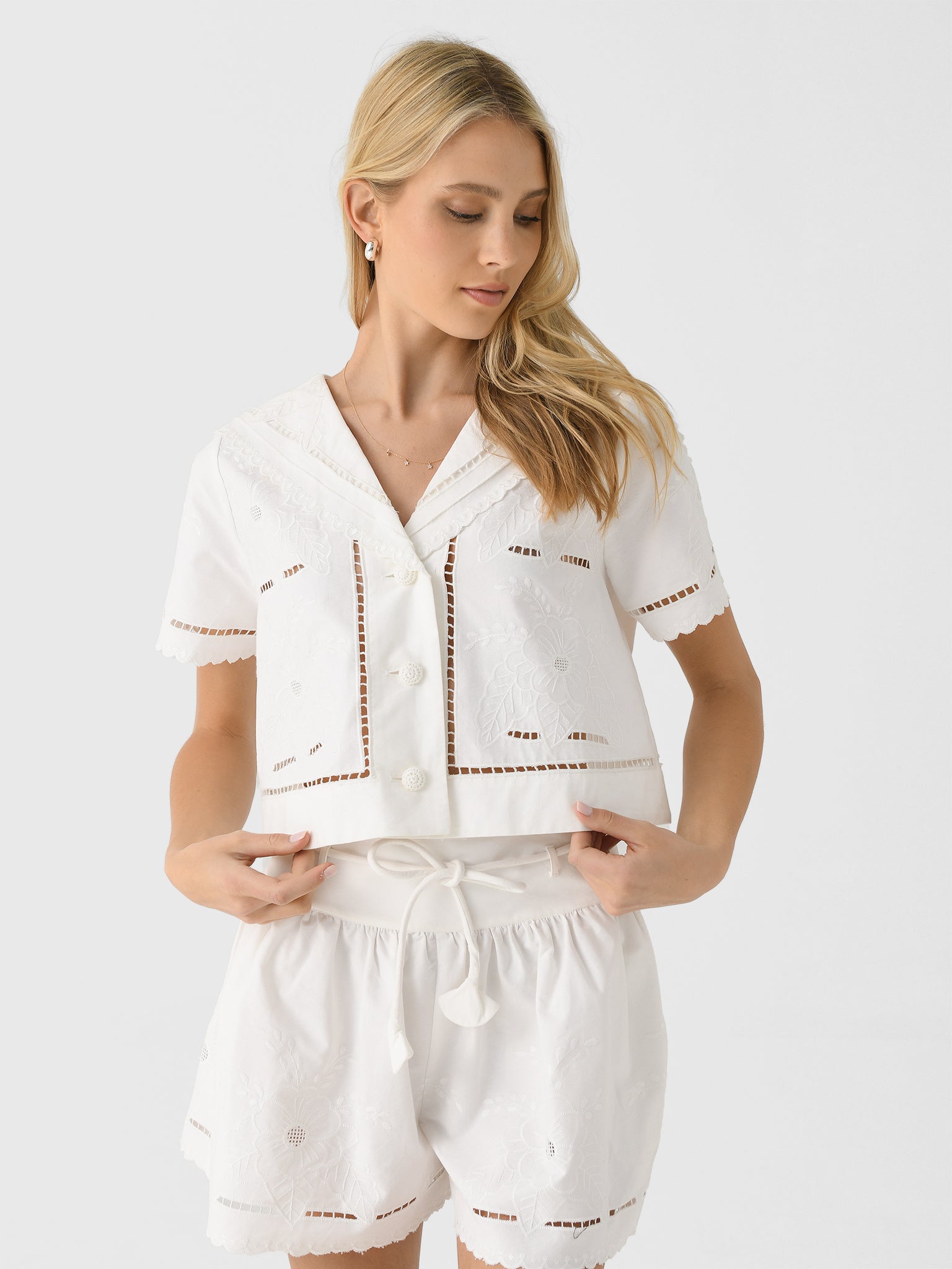 A feminine blouse made from lightweight cotton with a unique sailor collar and intricate embroidered details.