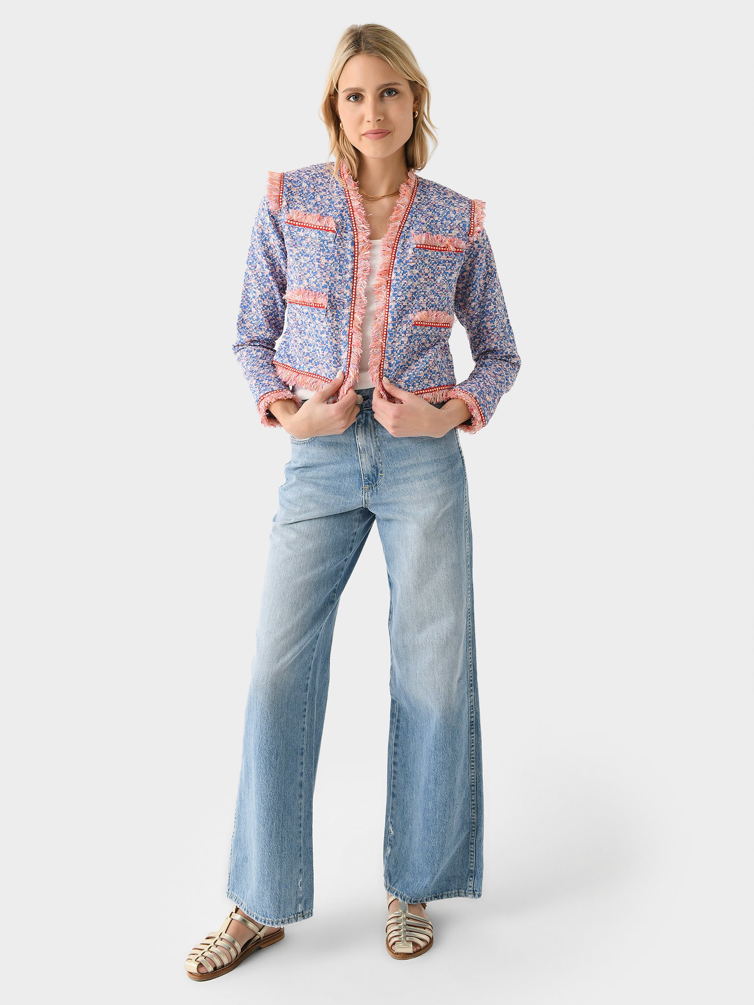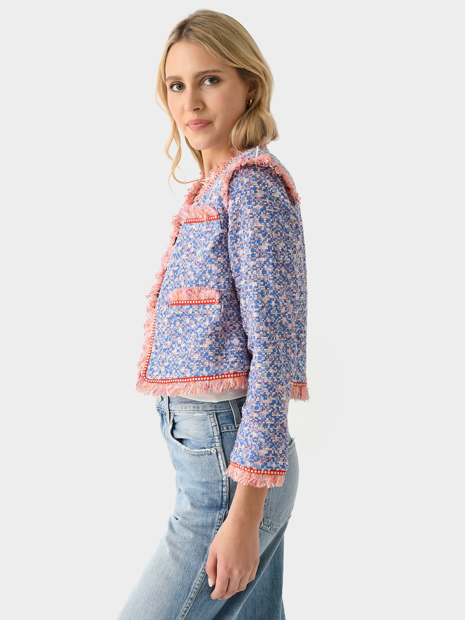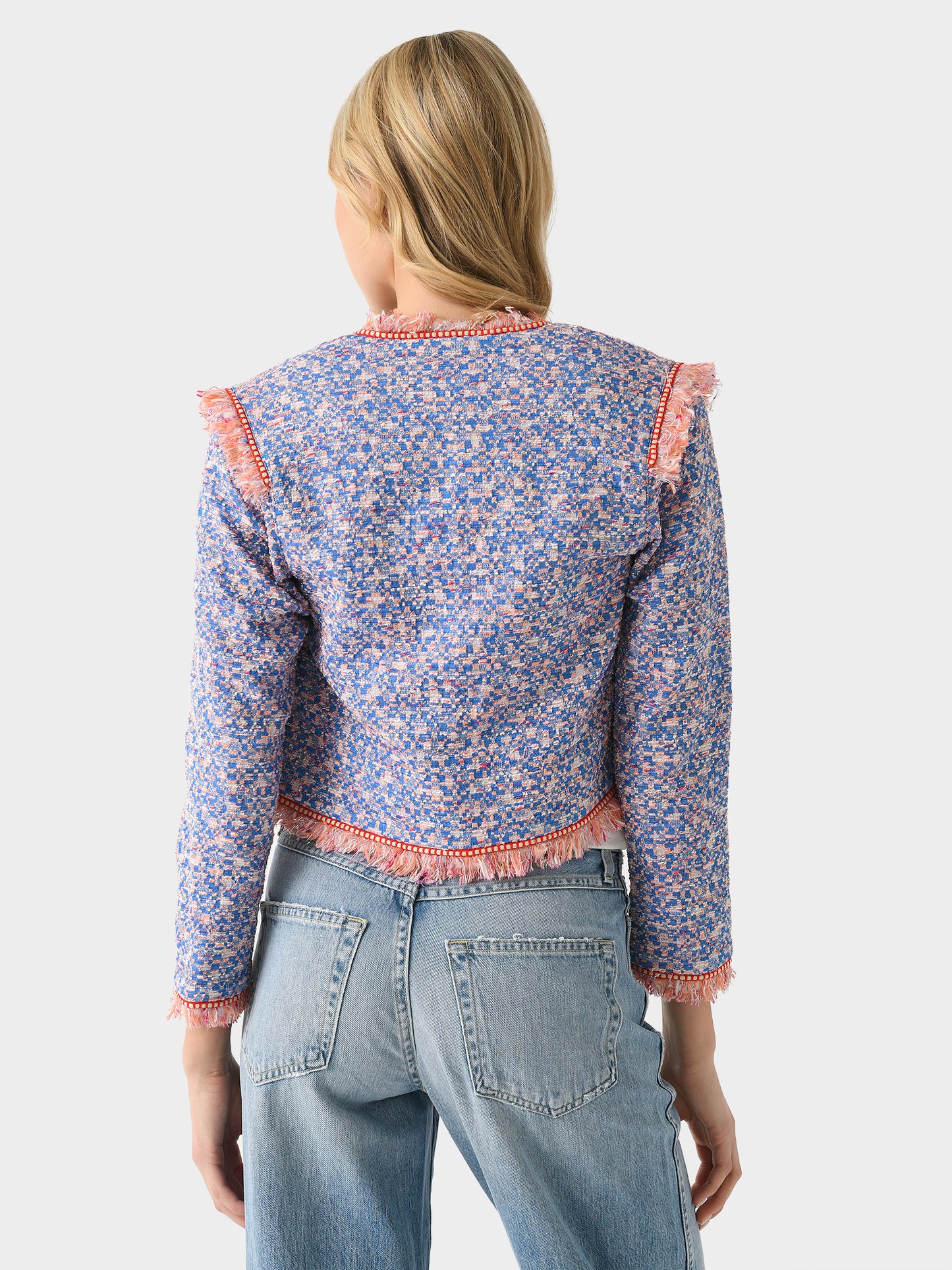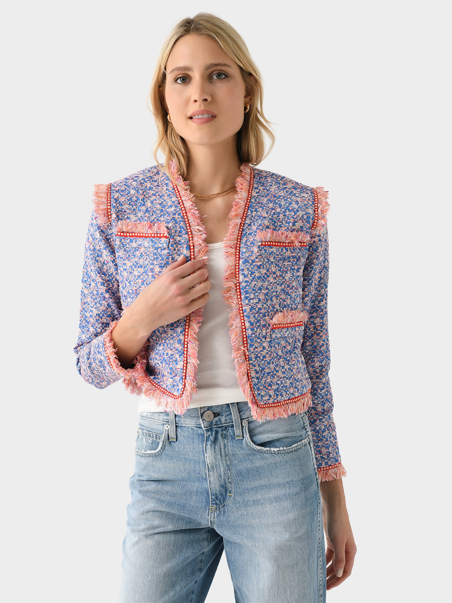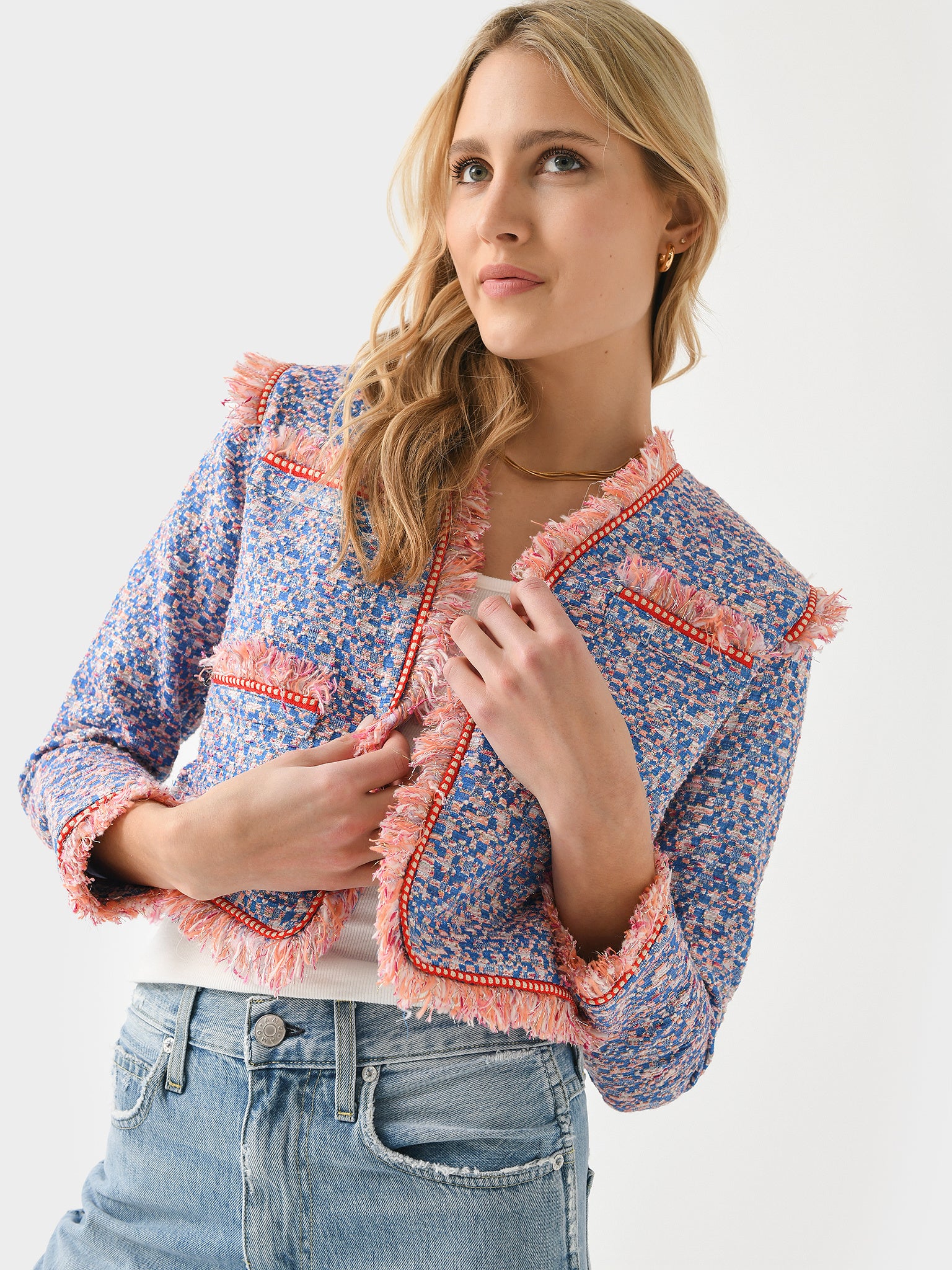 A slightly cropped, open-front jacket constructed from colorful mid-weight tweed fabric.